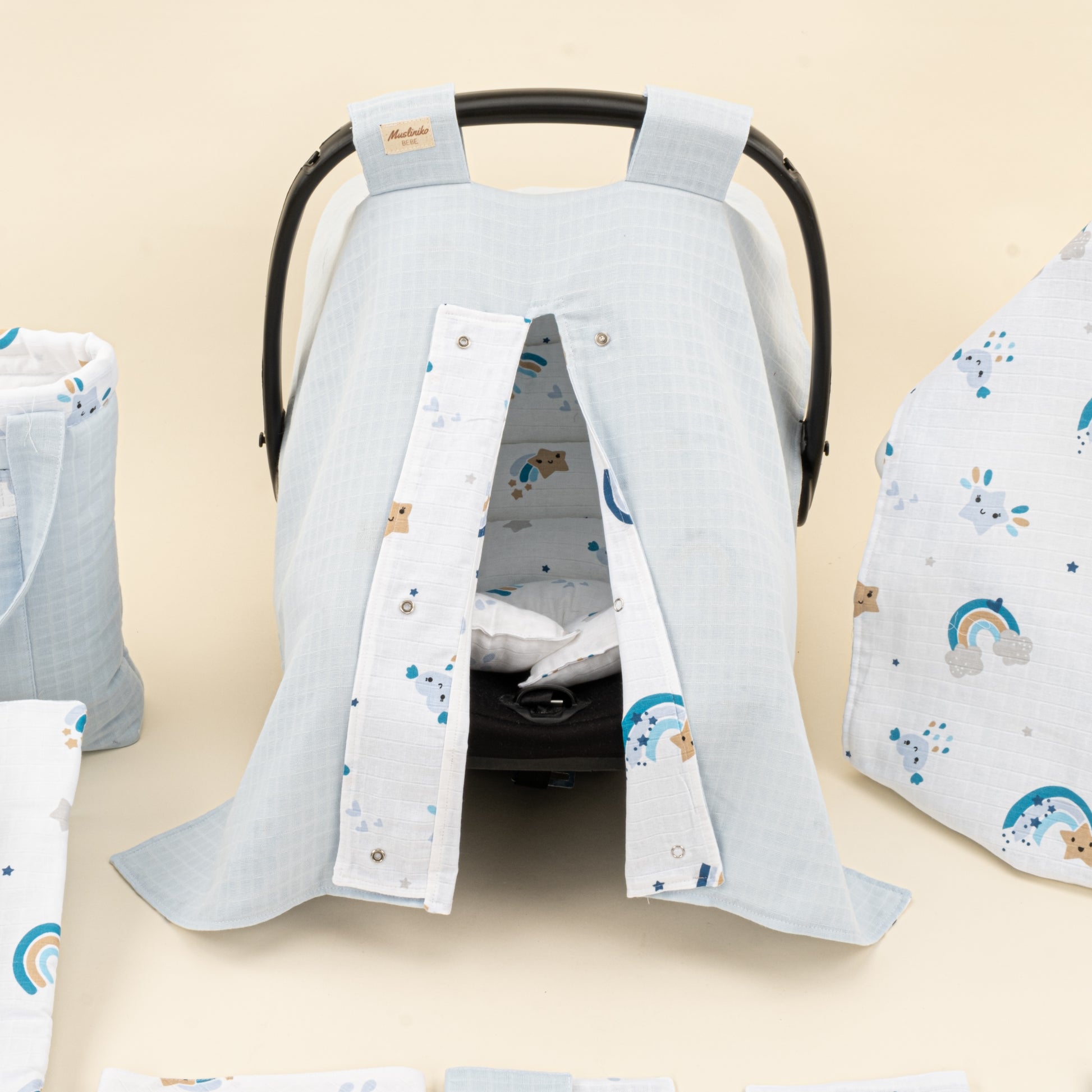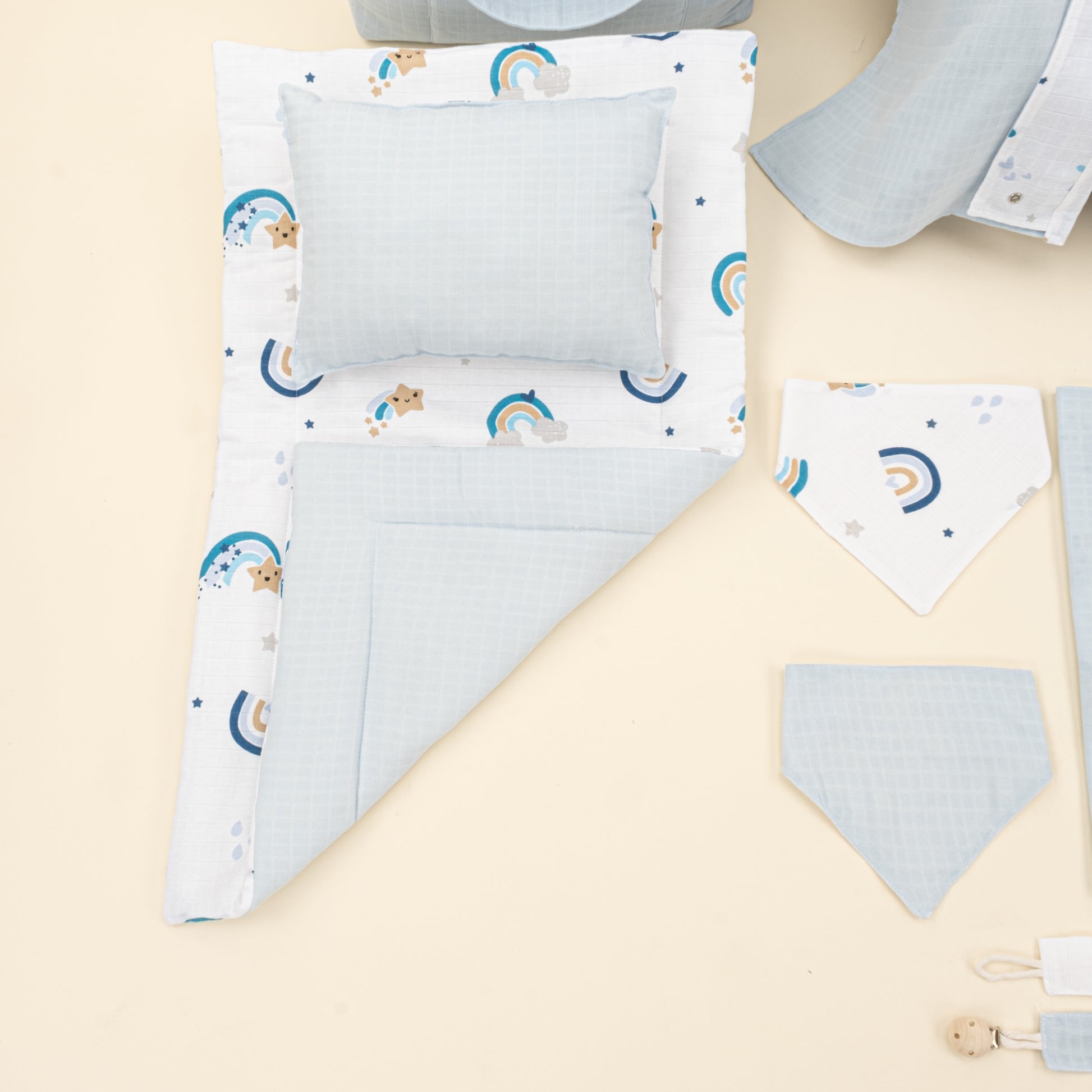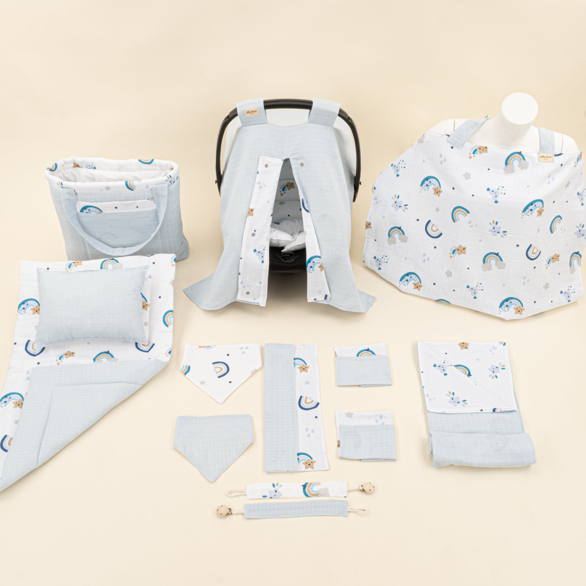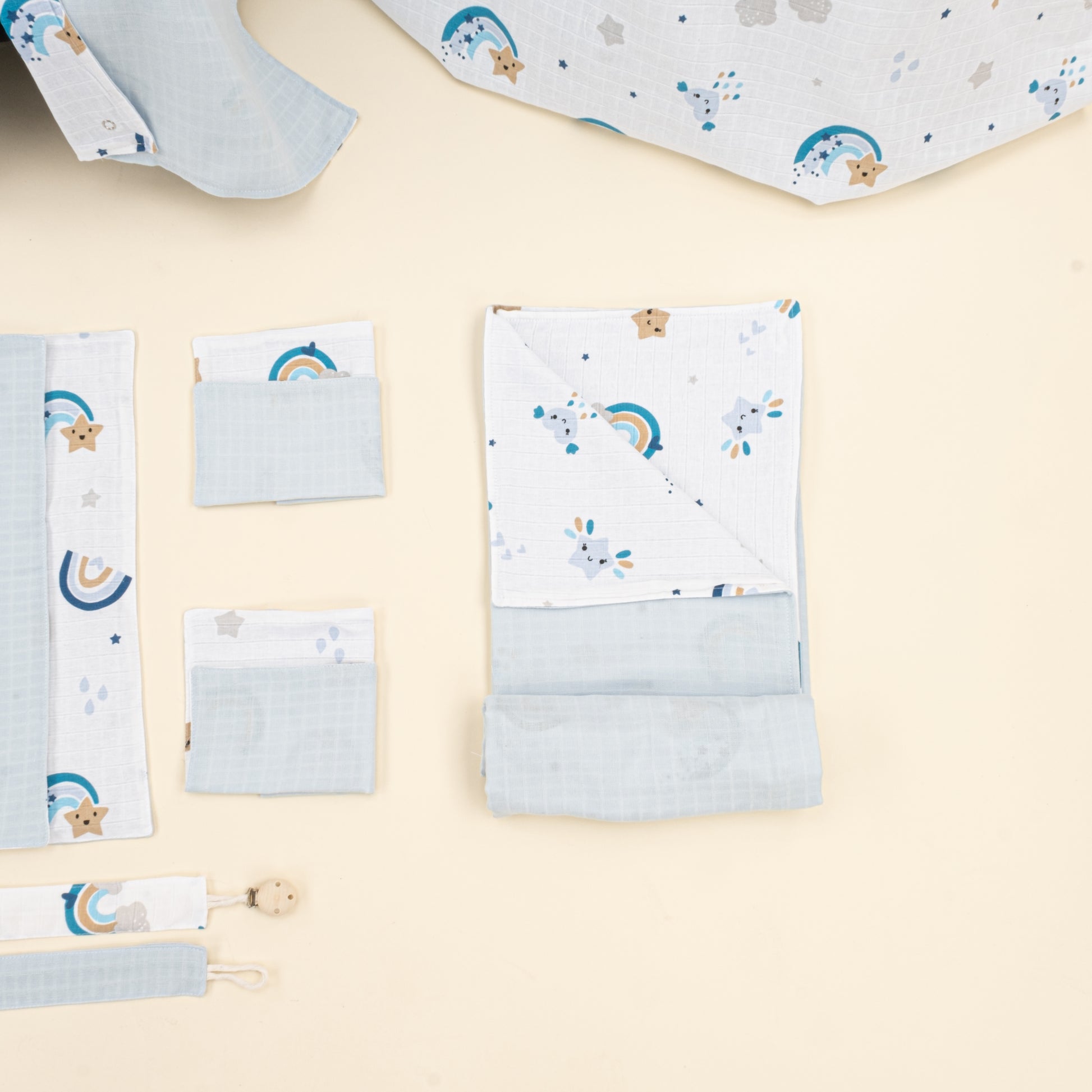 14 Parça Avantajlı Set - Çift Taraflı - Bebe Mavisi Muslin - Mavi Gökkuşağı