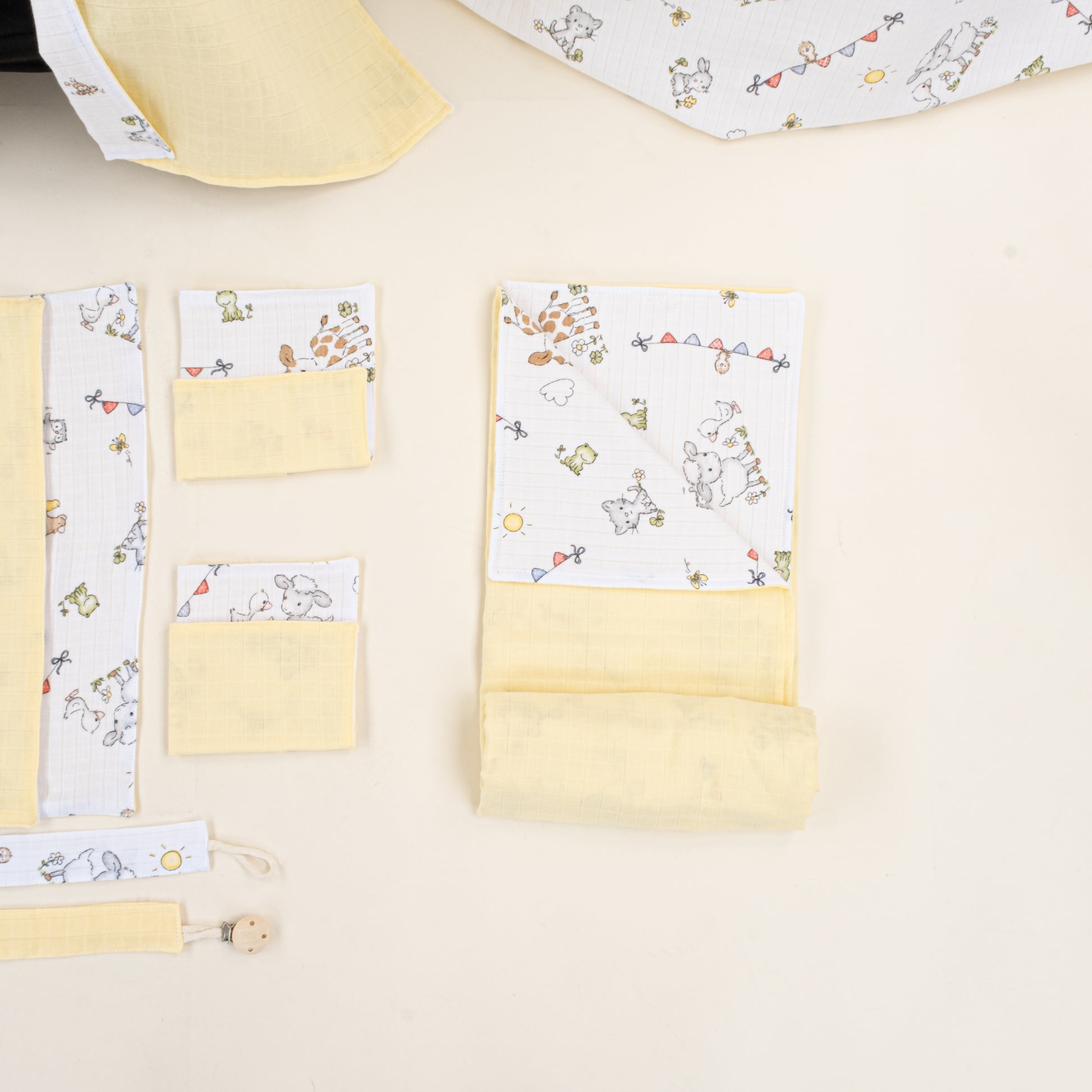 14 Parça Avantajlı Set - Çift Taraflı - Sarı Muslin - Çiftlik Hayvanları