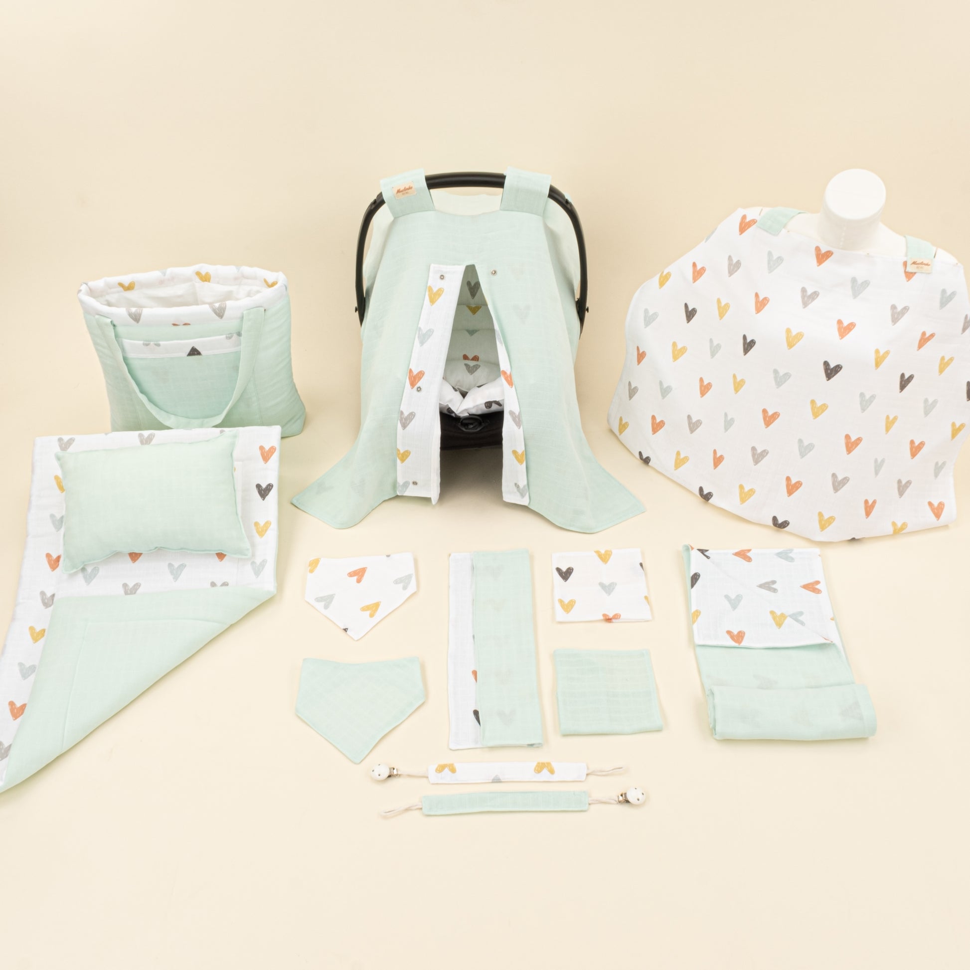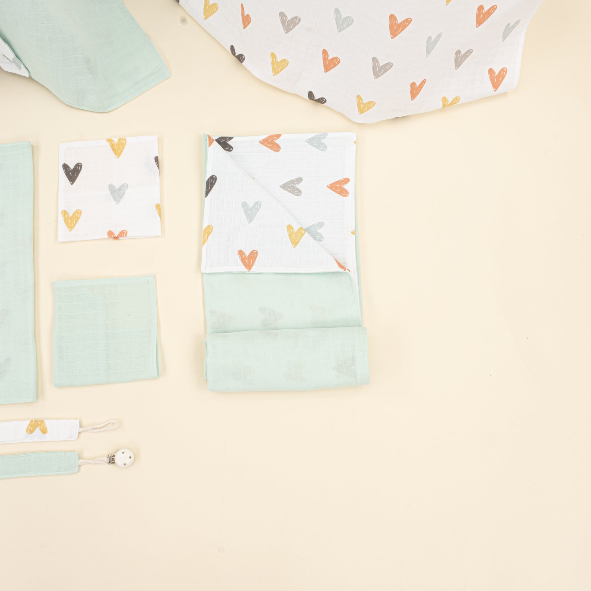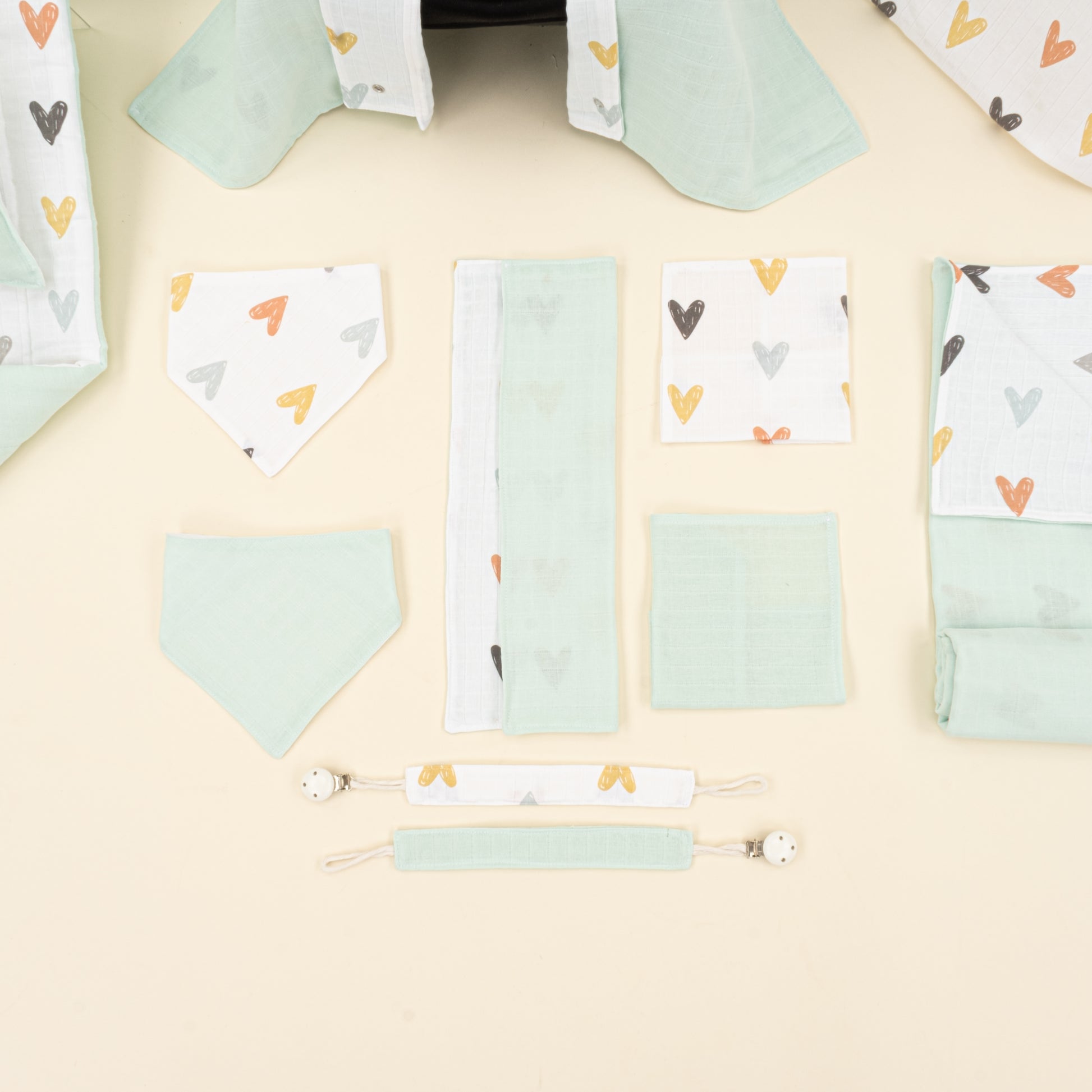 14 Parça Avantajlı Set - Çift Taraflı - Su Yeşili Muslin - Kalpler