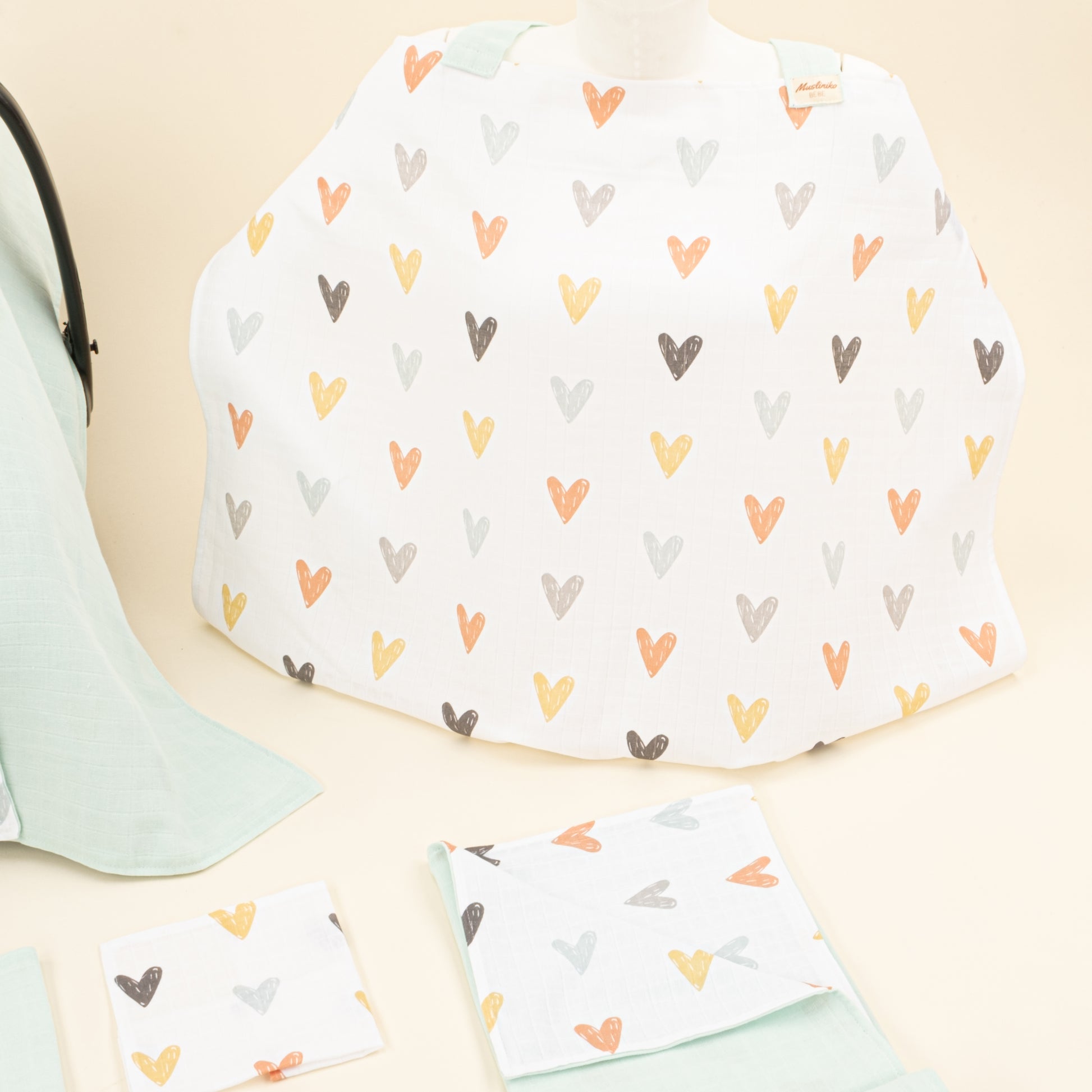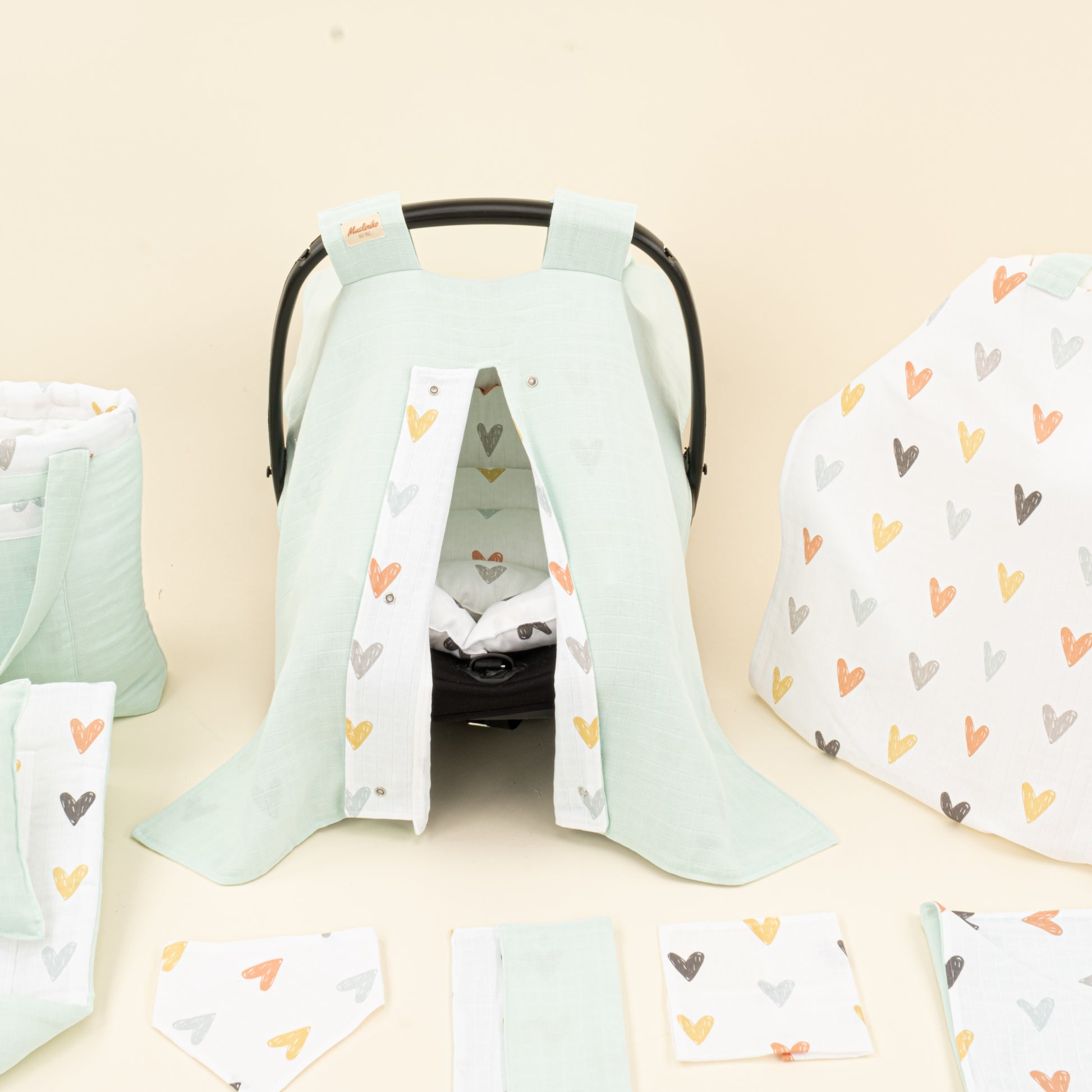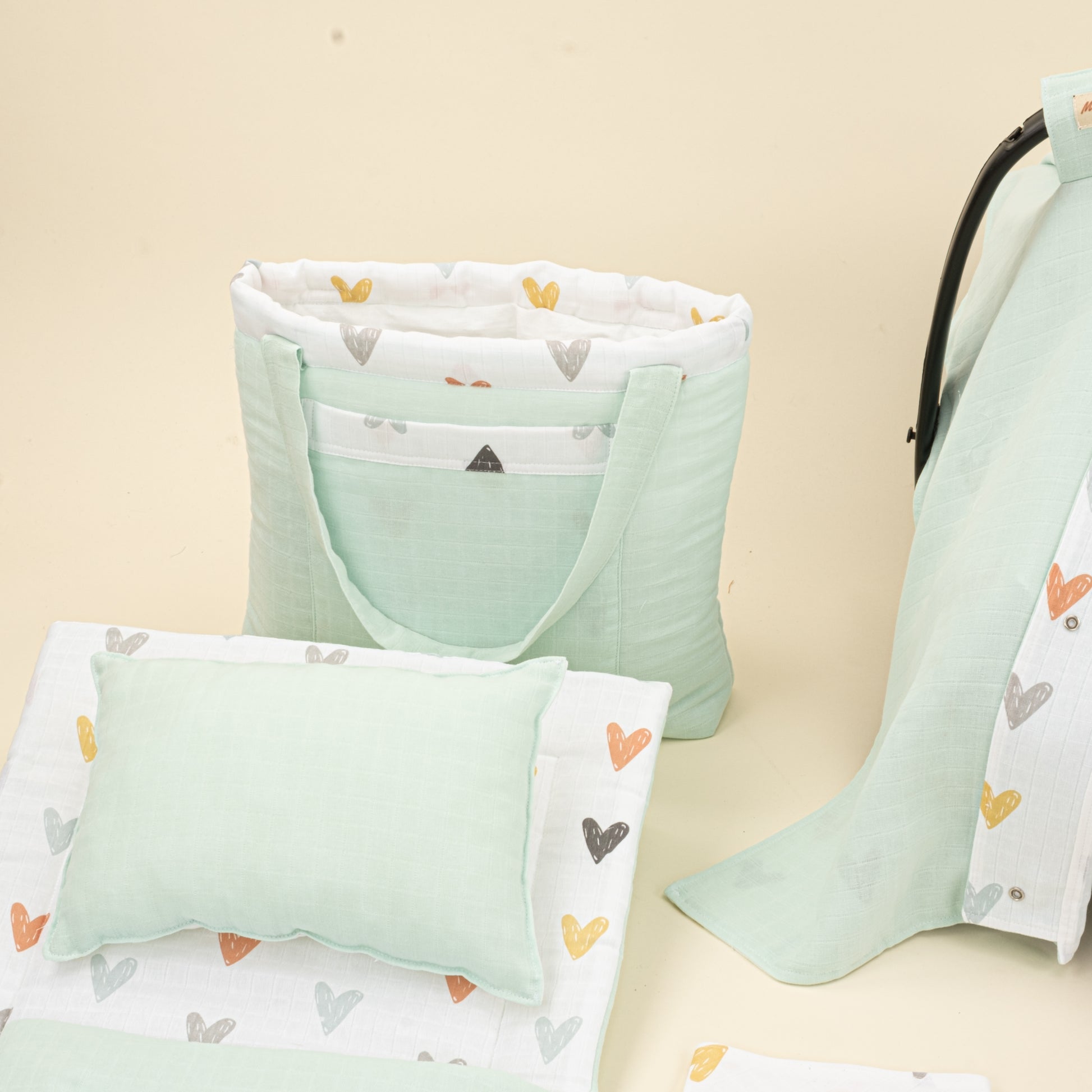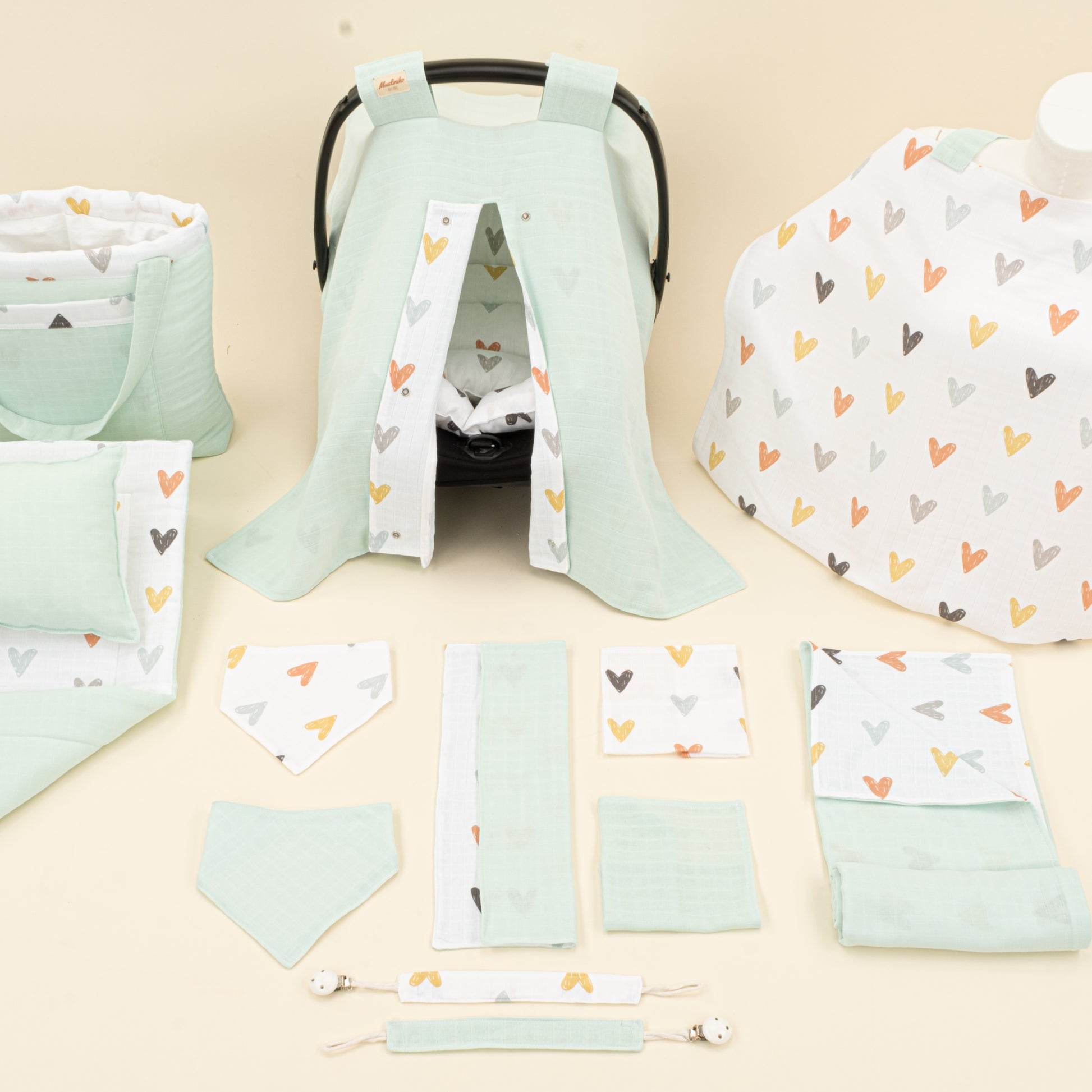14 Parça Avantajlı Set - Çift Taraflı - Su Yeşili Muslin - Kalpler