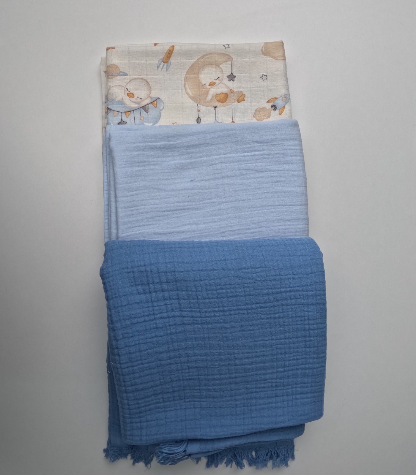 3 lü Bebek Muslin Battaniye Set - Dört Katlı Püsküllü İndigo - İki Katlı Bebe Mavi - Uykucu Ördek