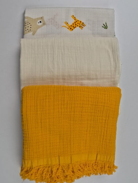 3 lü Bebek Muslin Battaniye Set - Dört Katlı Püsküllü Hardal - İki Katlı Krem - Aslan