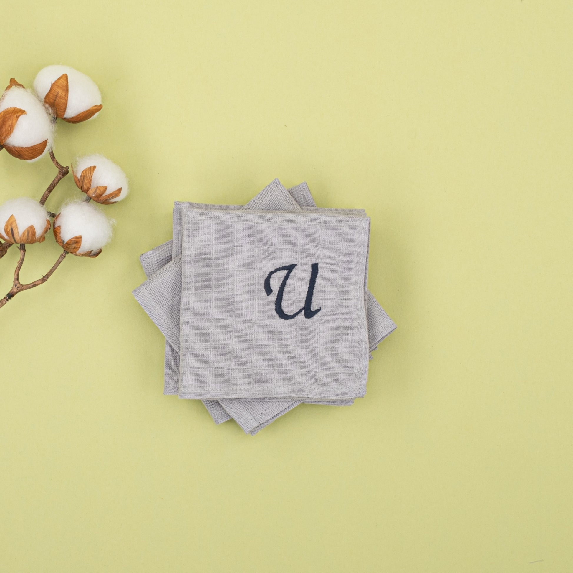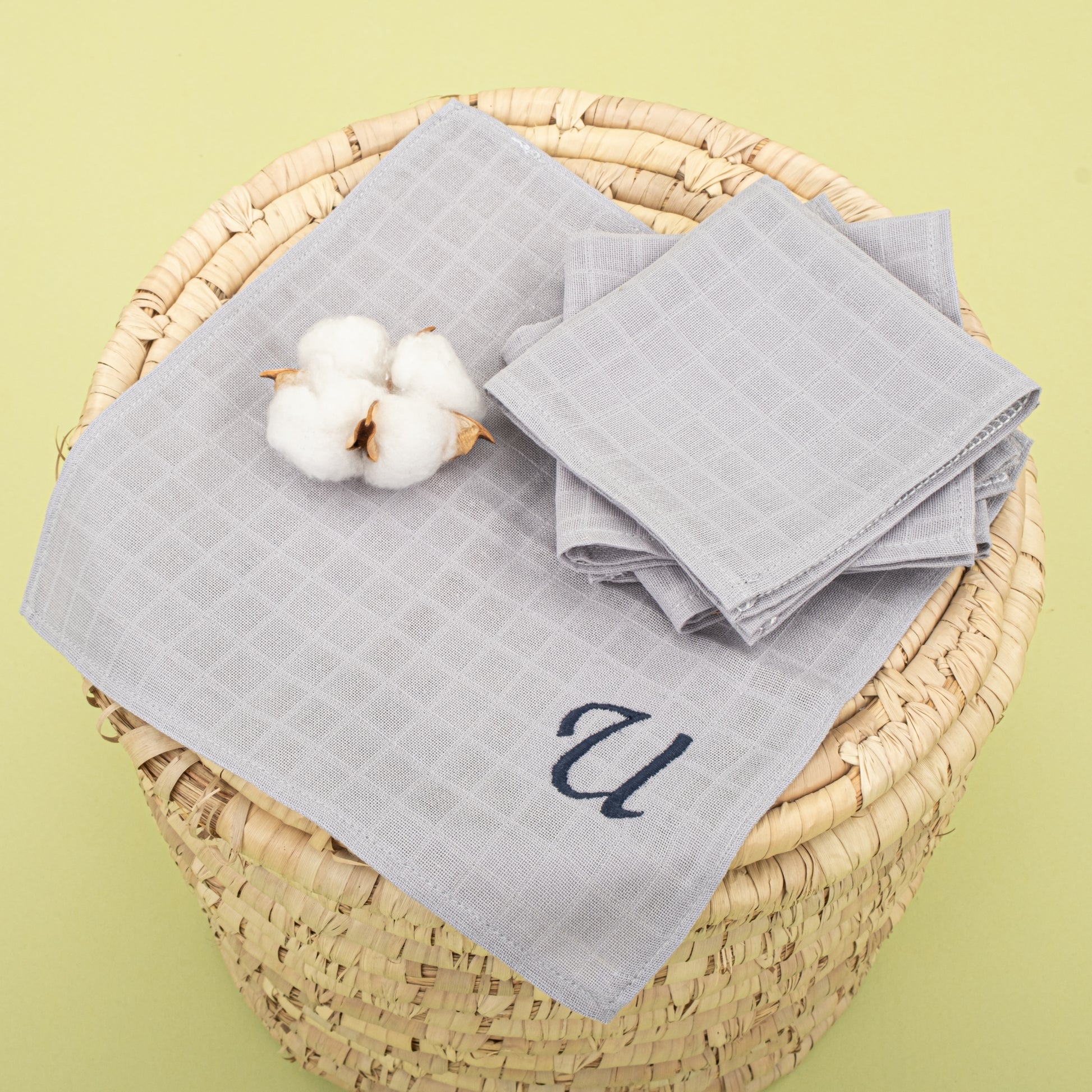 5'li U Harf Nakışlı Mendil Set - Gri Muslin