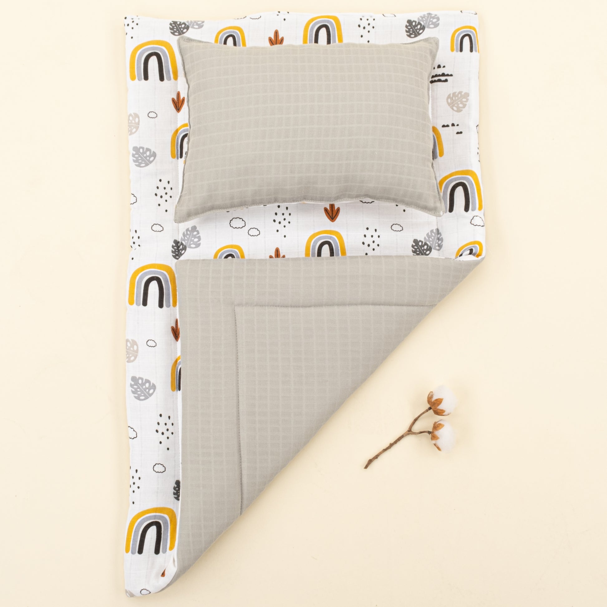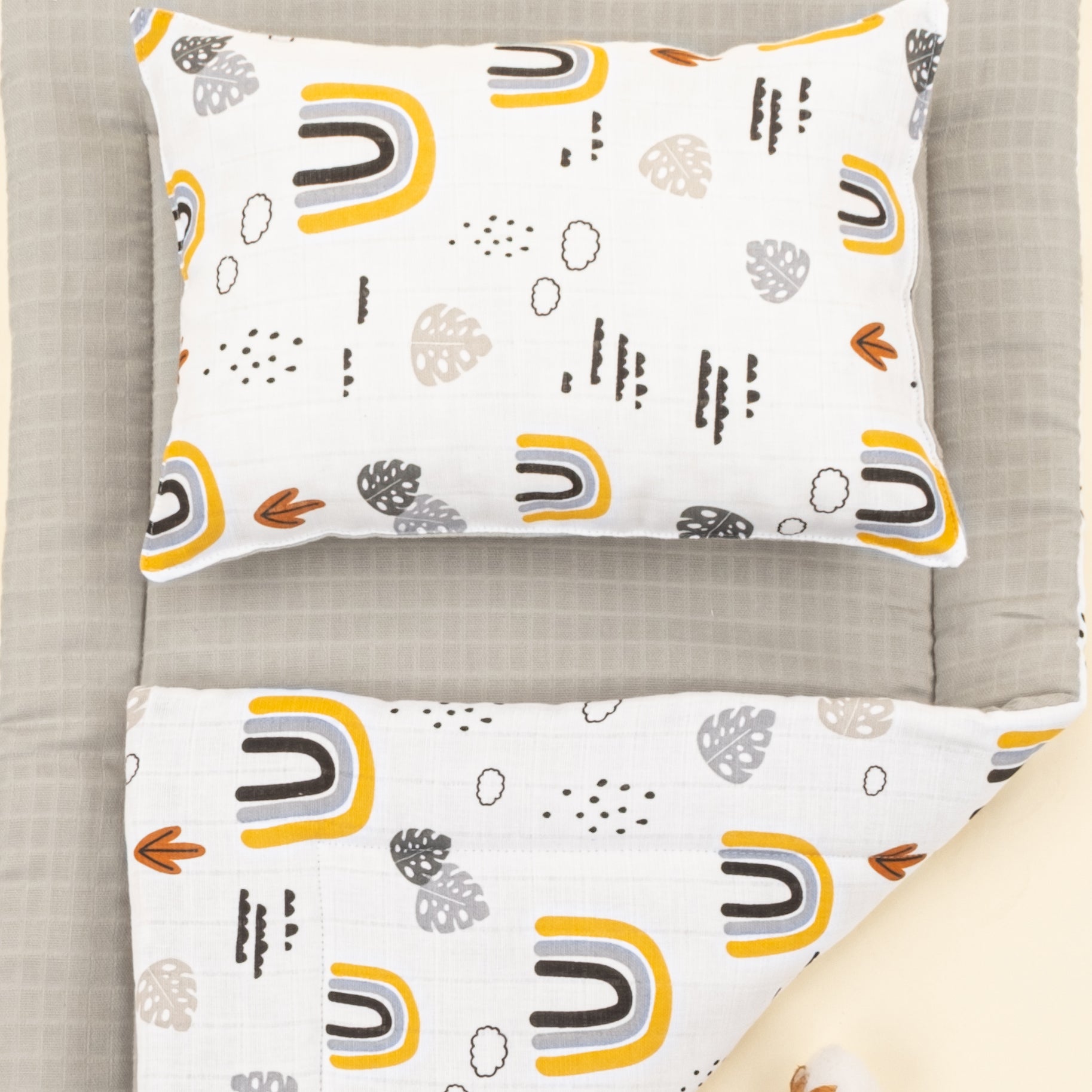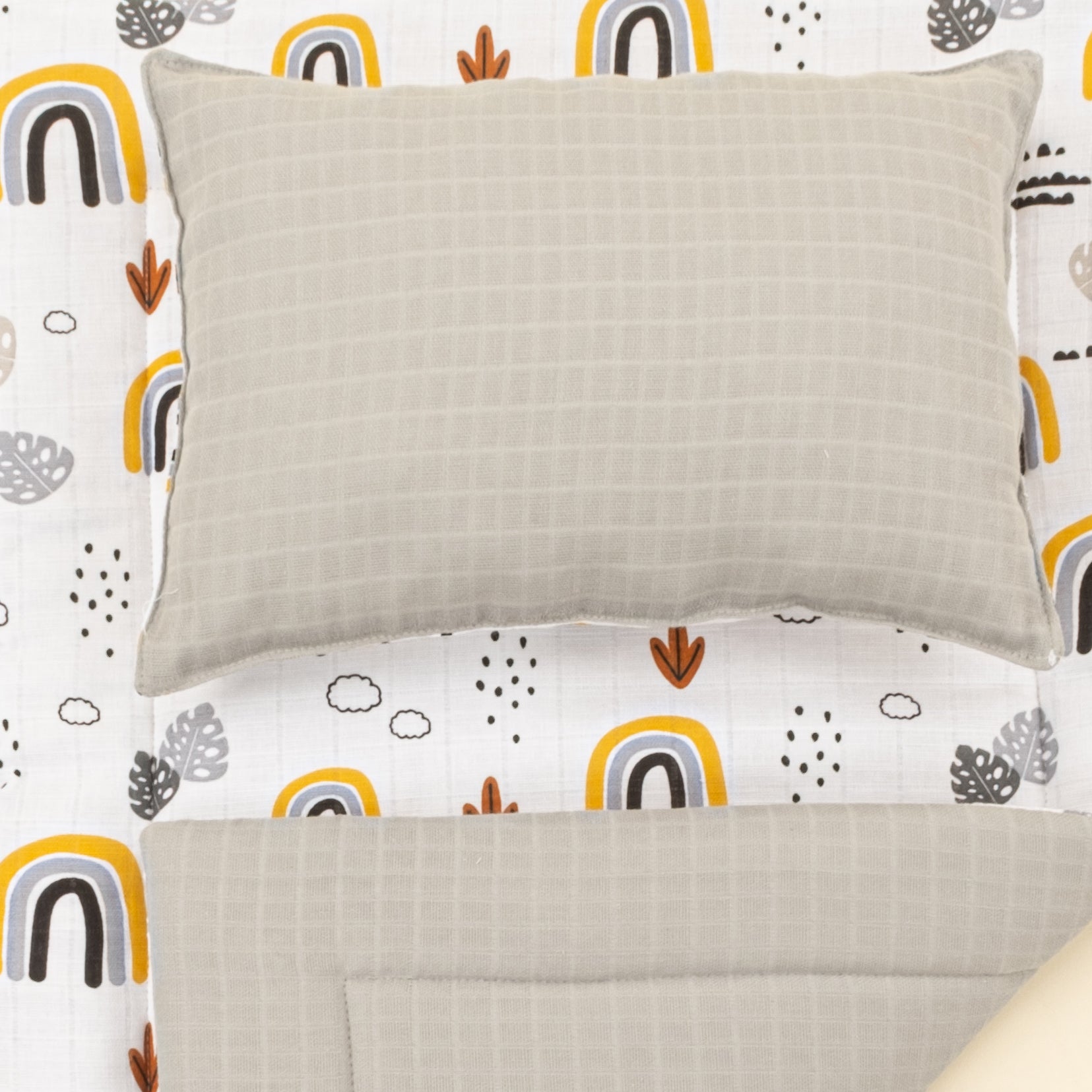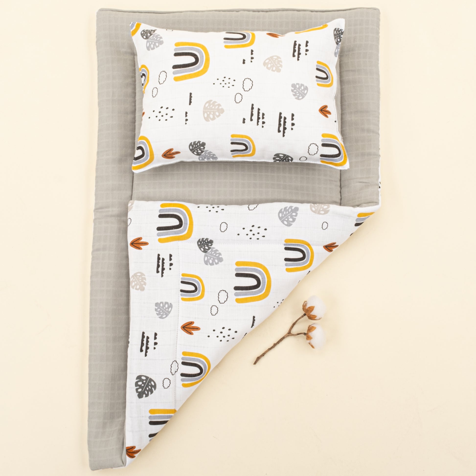 Alt Açma Matı ve Yastık - Çift Taraflı - Açık Gri Muslin - Hardal Gökkuşağı