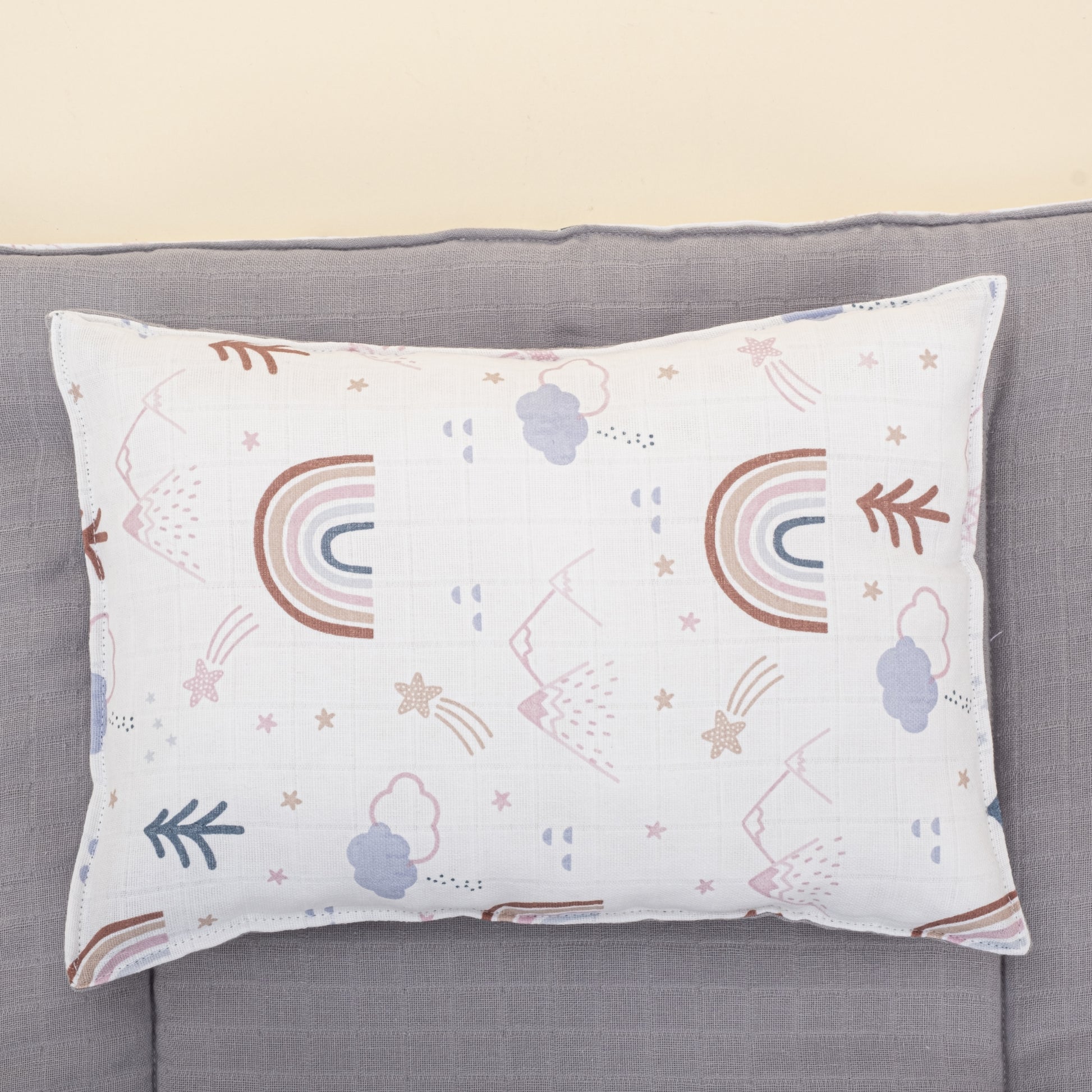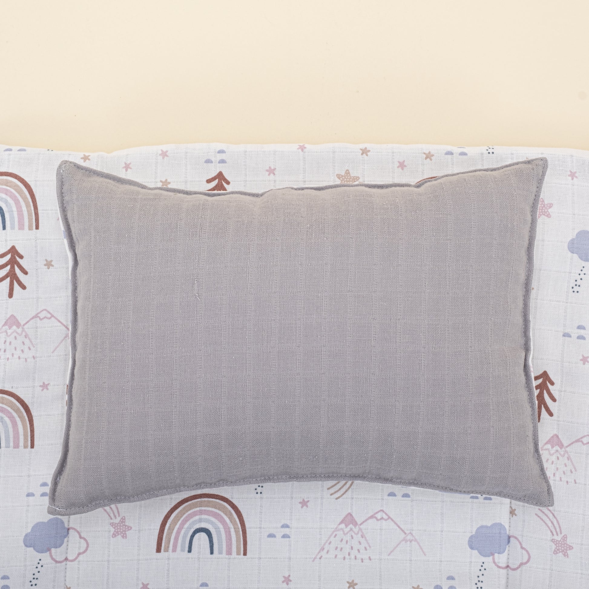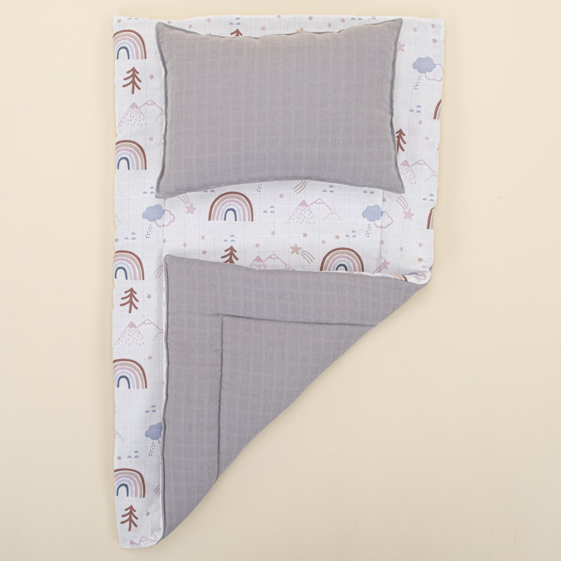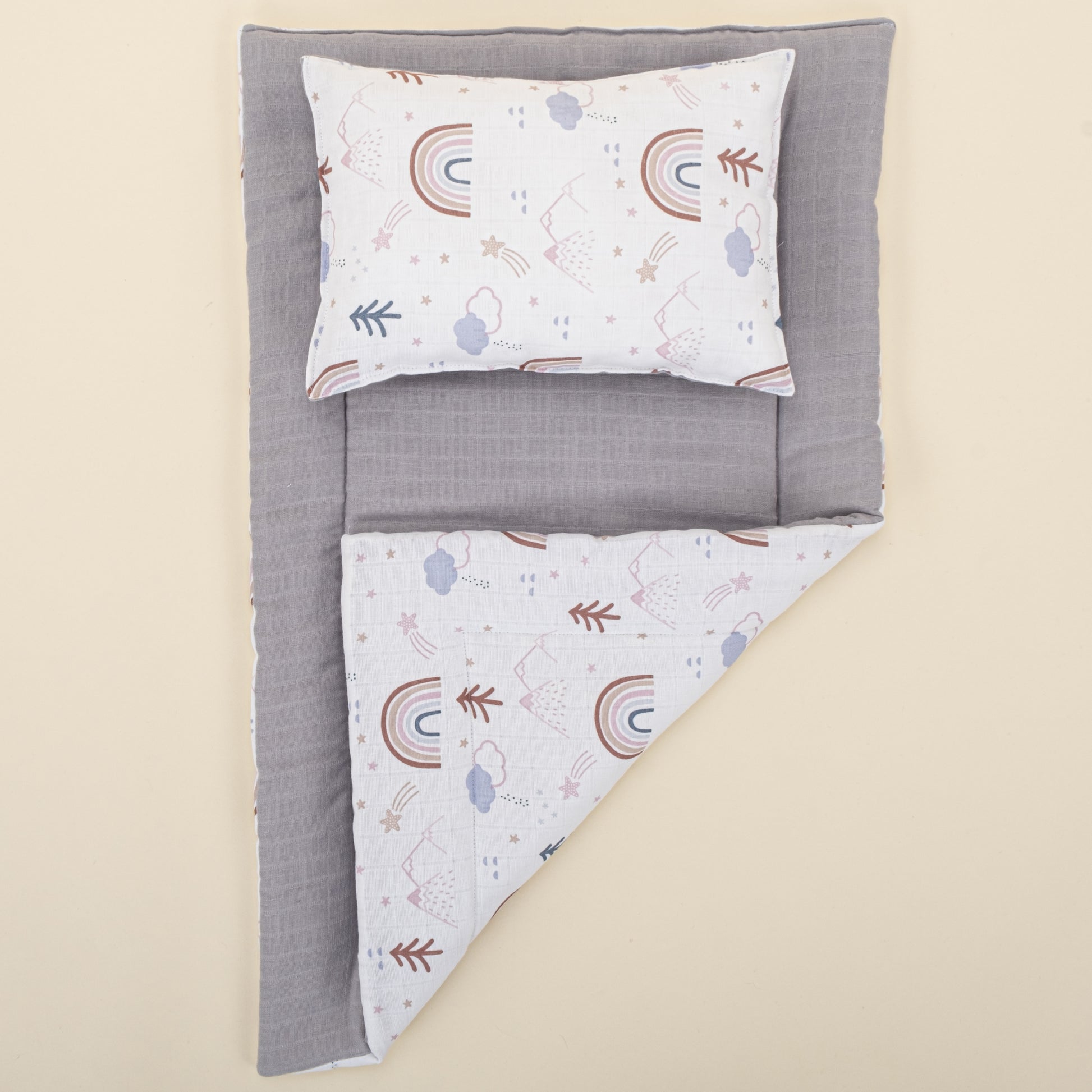 Alt Açma Matı ve Yastık - Çift Taraflı - Gri Muslin - Pastel Gökkuşağı
