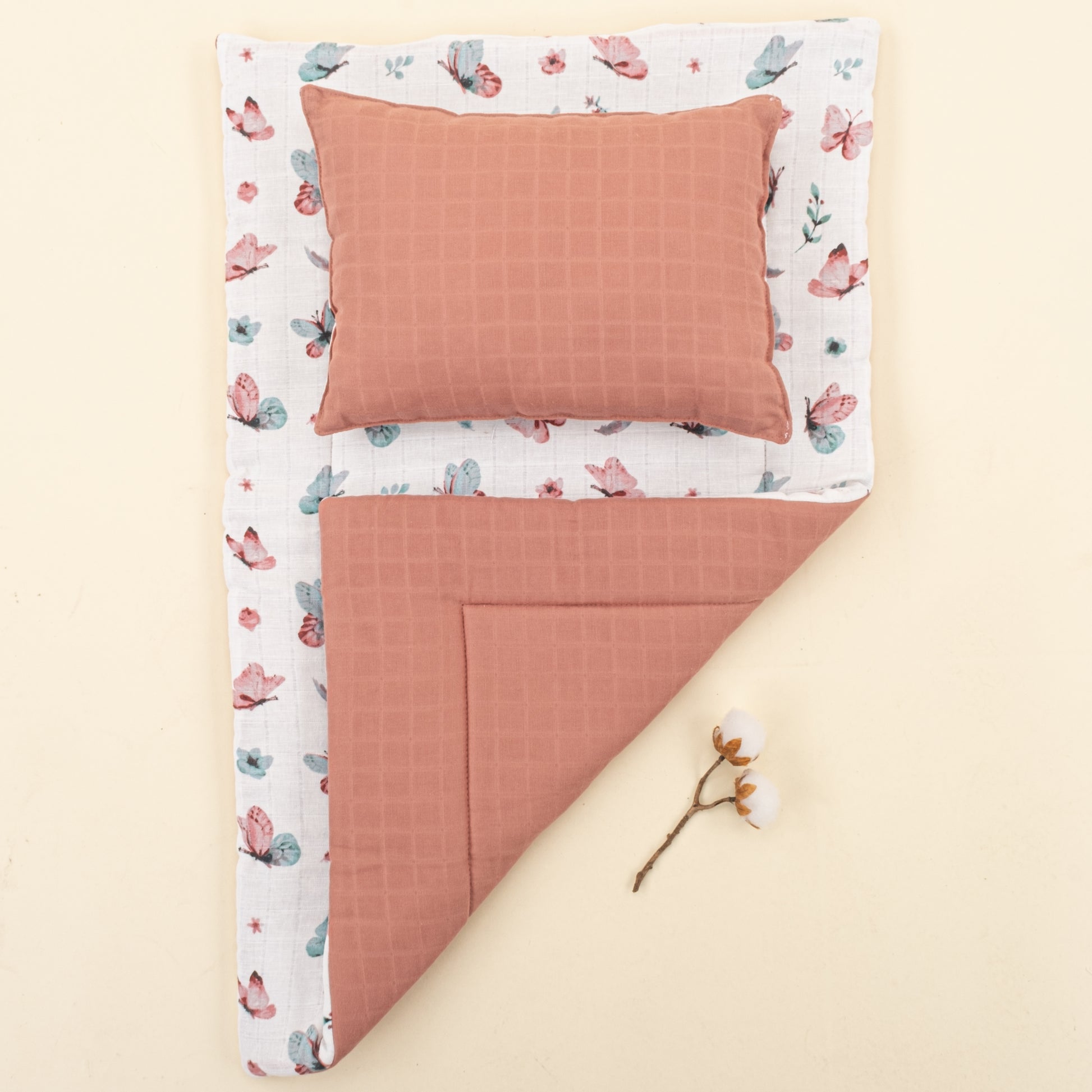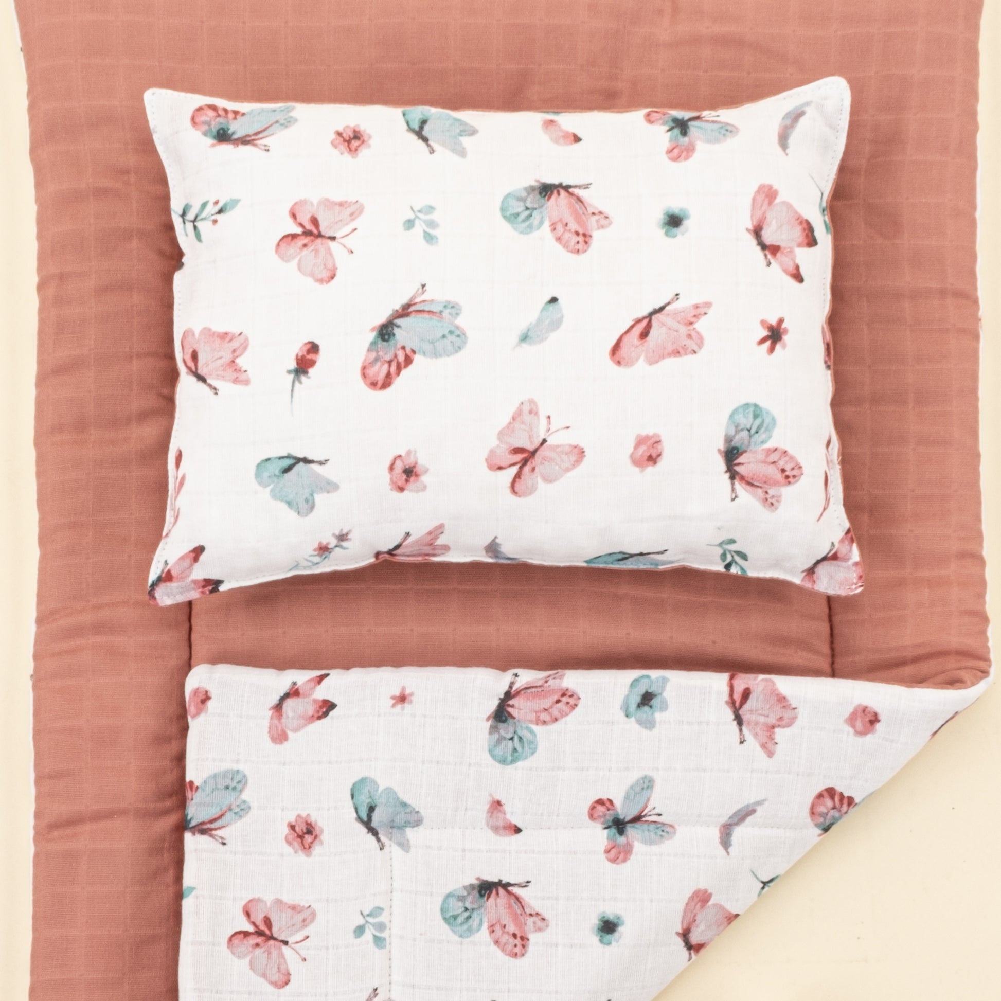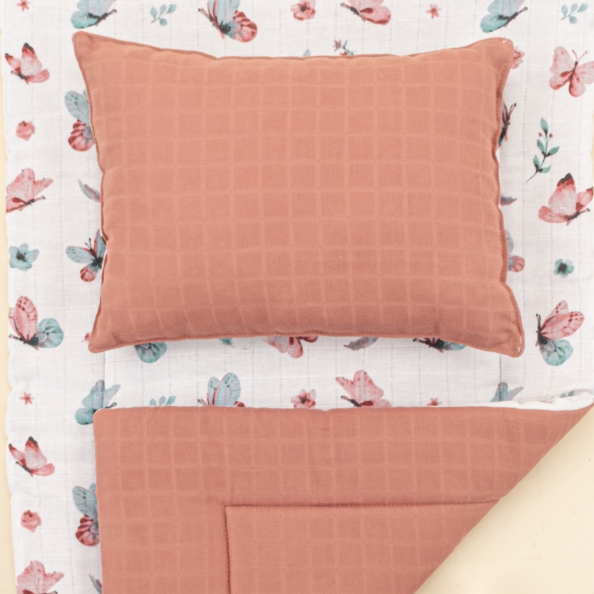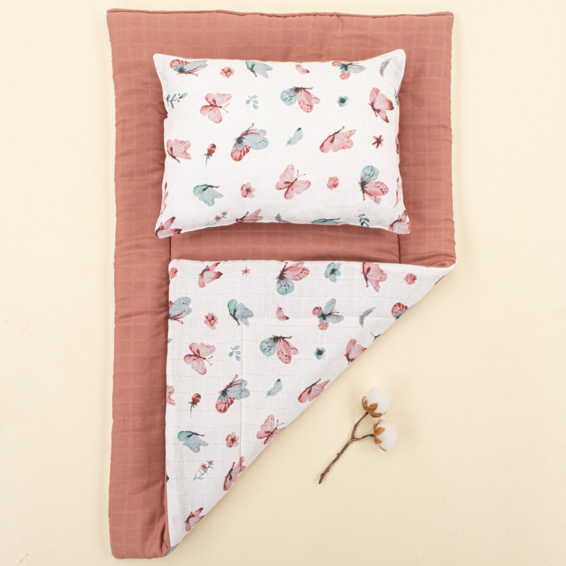 Alt Açma Matı ve Yastık - Çift Taraflı - Gül Kurusu Muslin - Kelebekler
