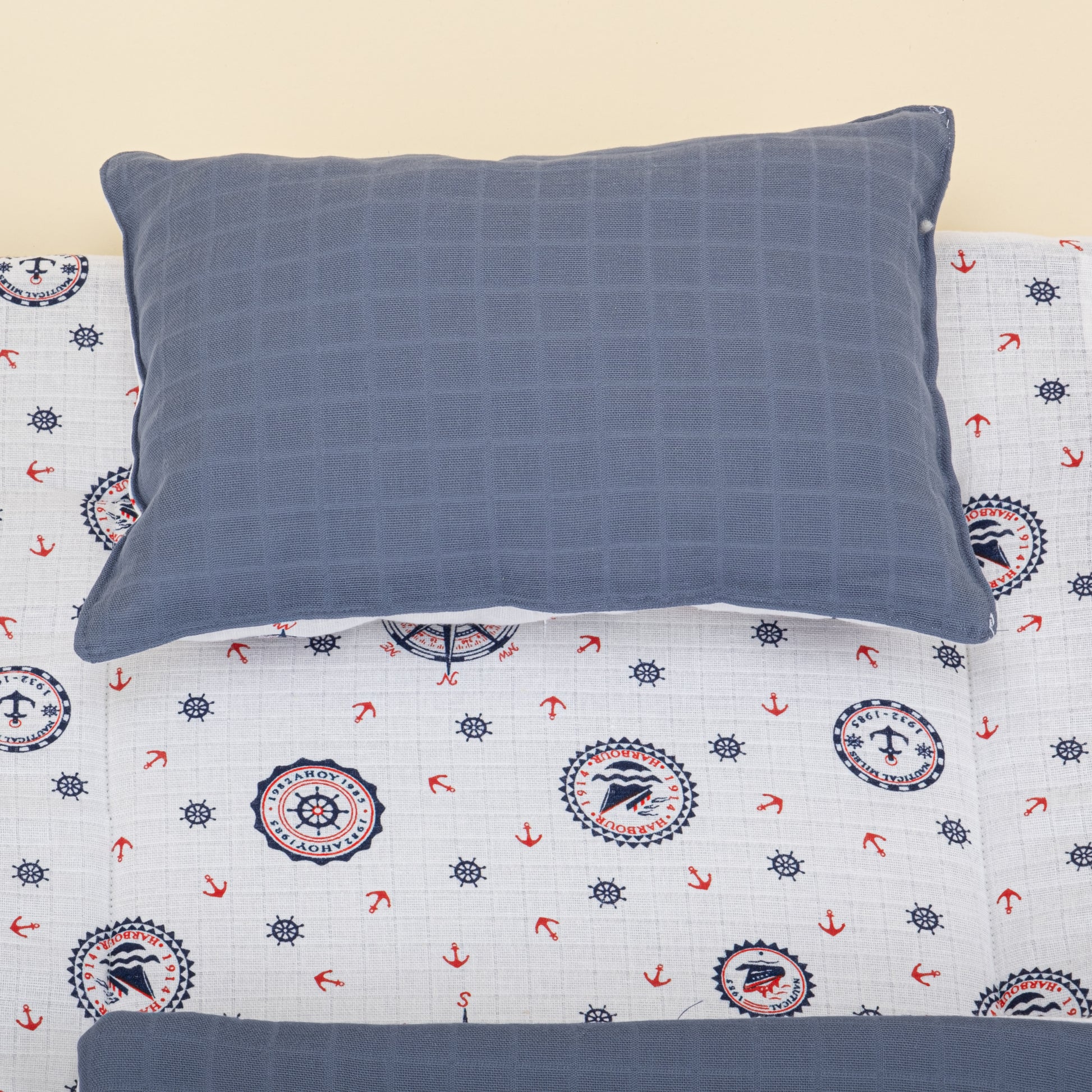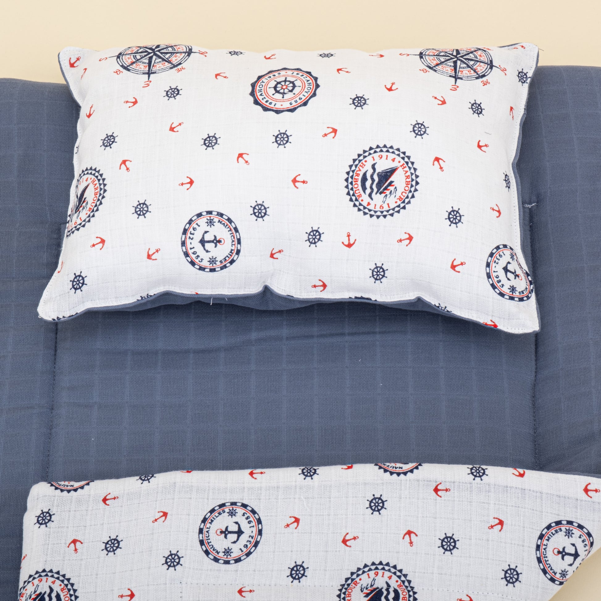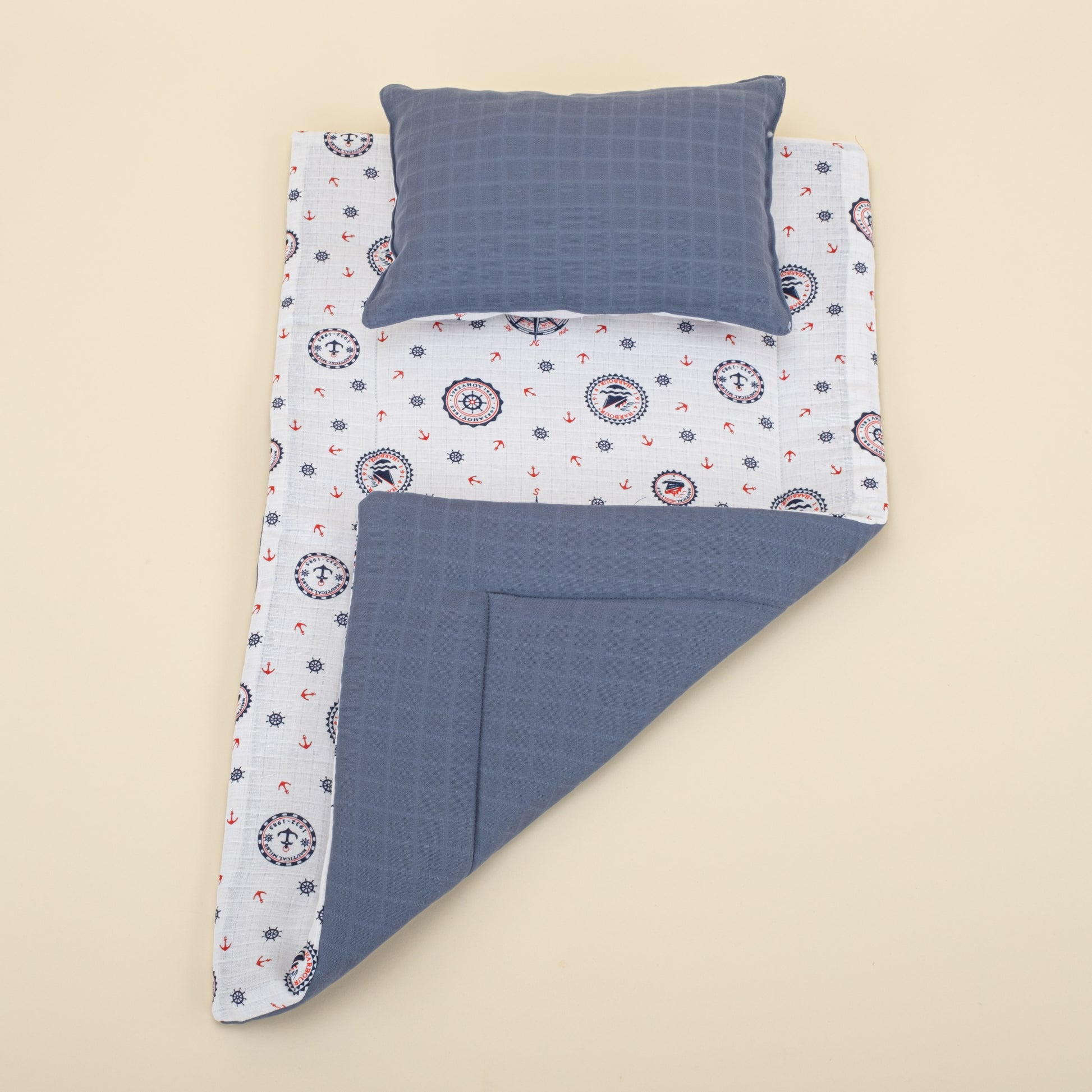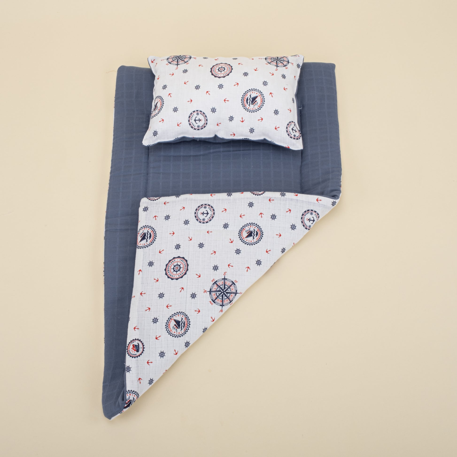 Alt Açma Matı ve Yastık - Çift Taraflı - İndigo Muslin - Mavi Gemili