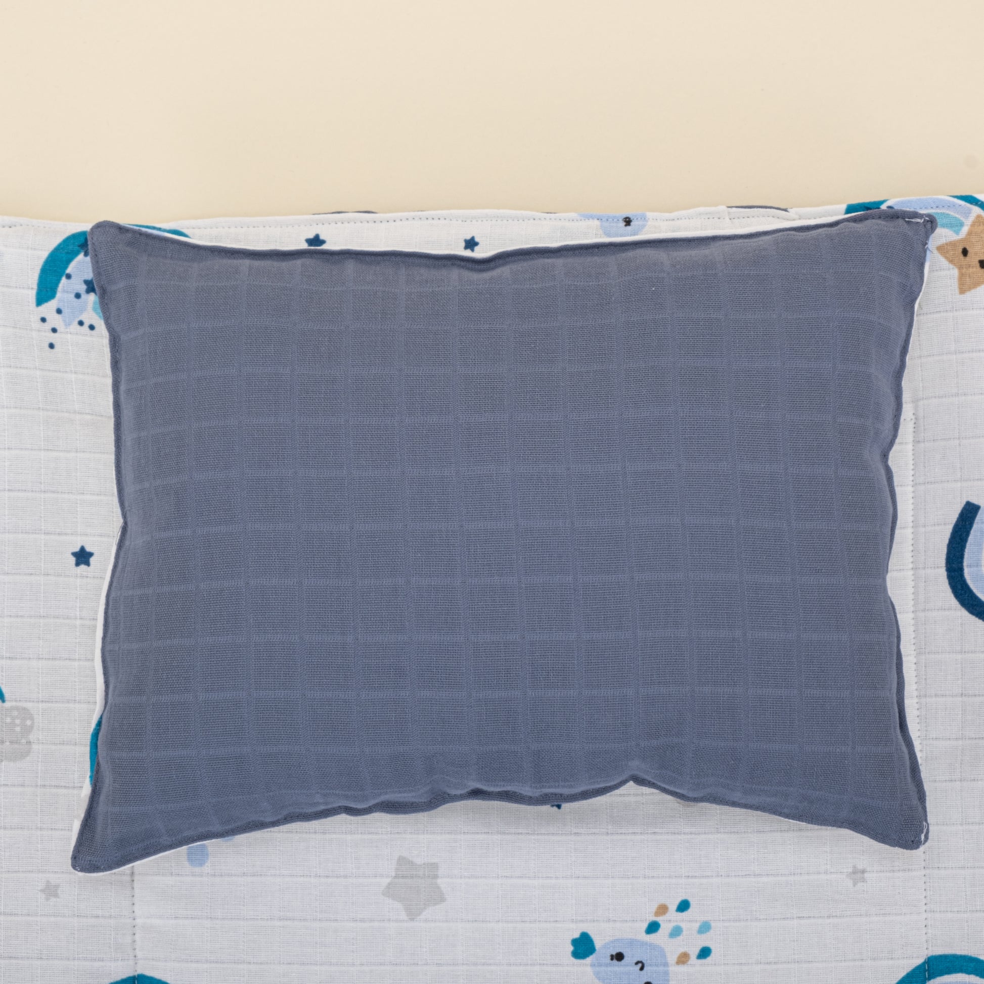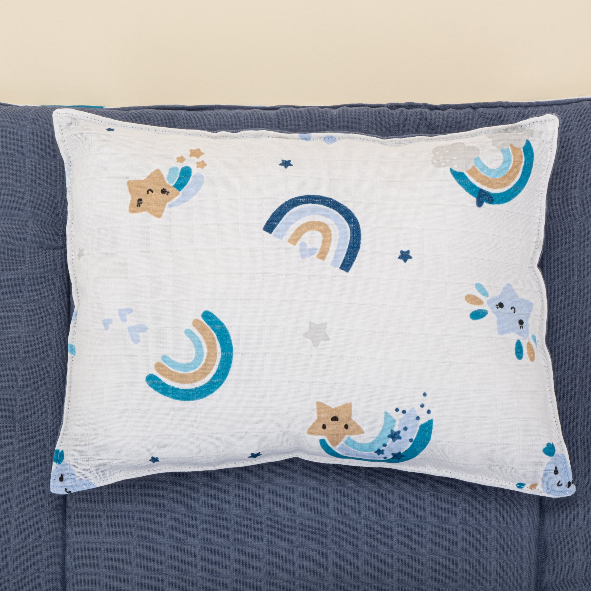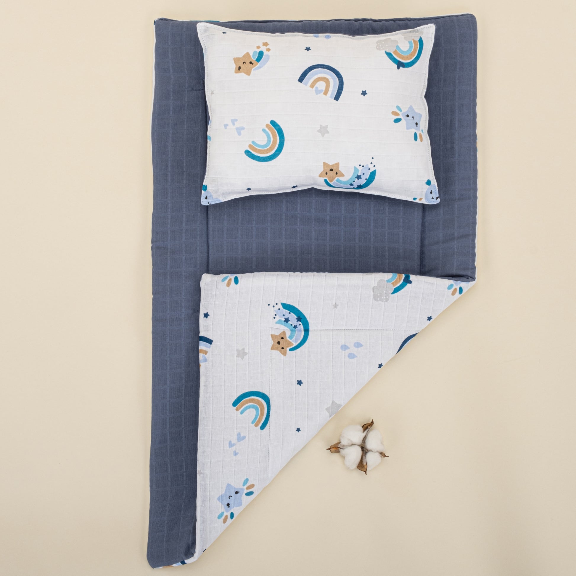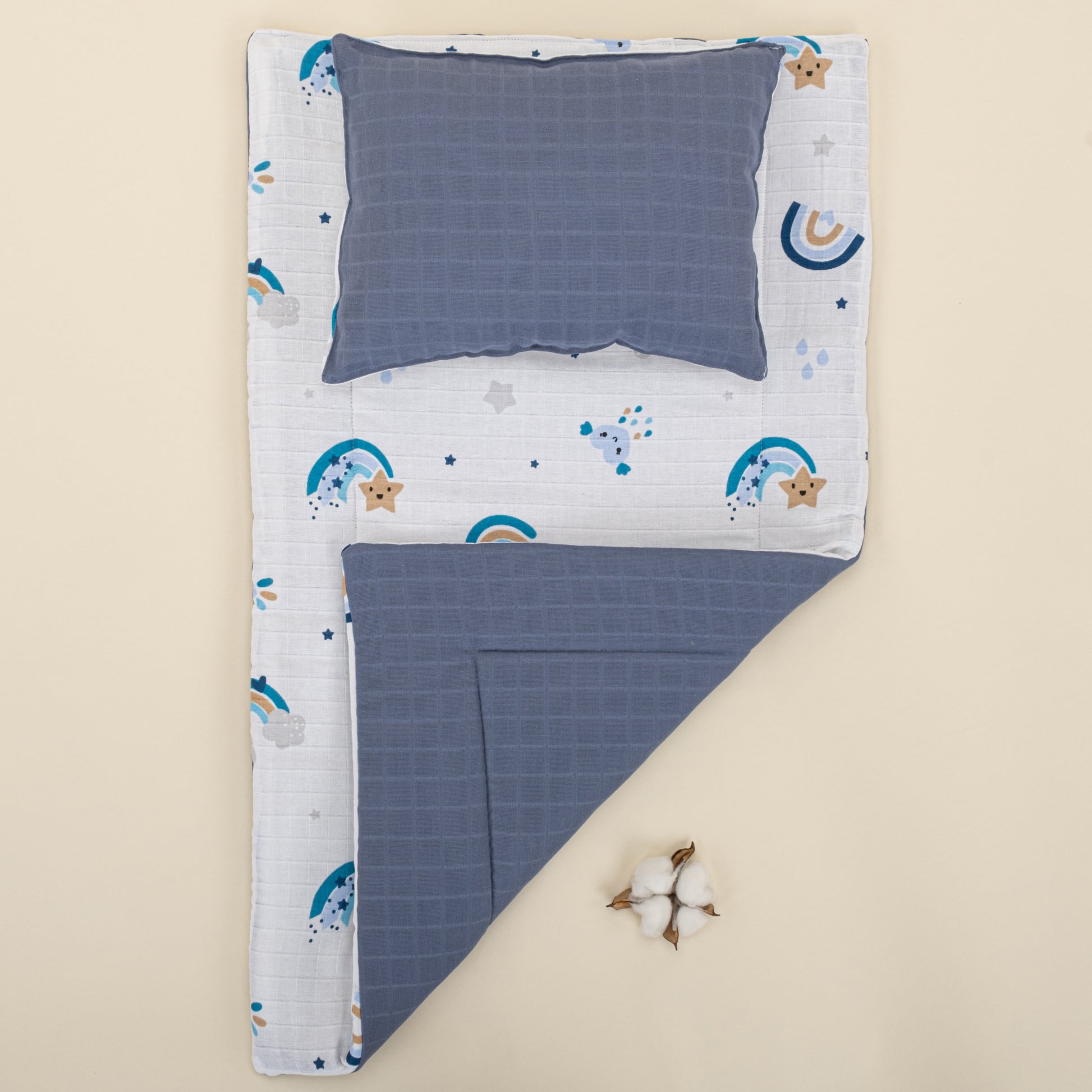Alt Açma Matı ve Yastık - Çift Taraflı - İndigo Müslin - Mavi Gökkuşağı