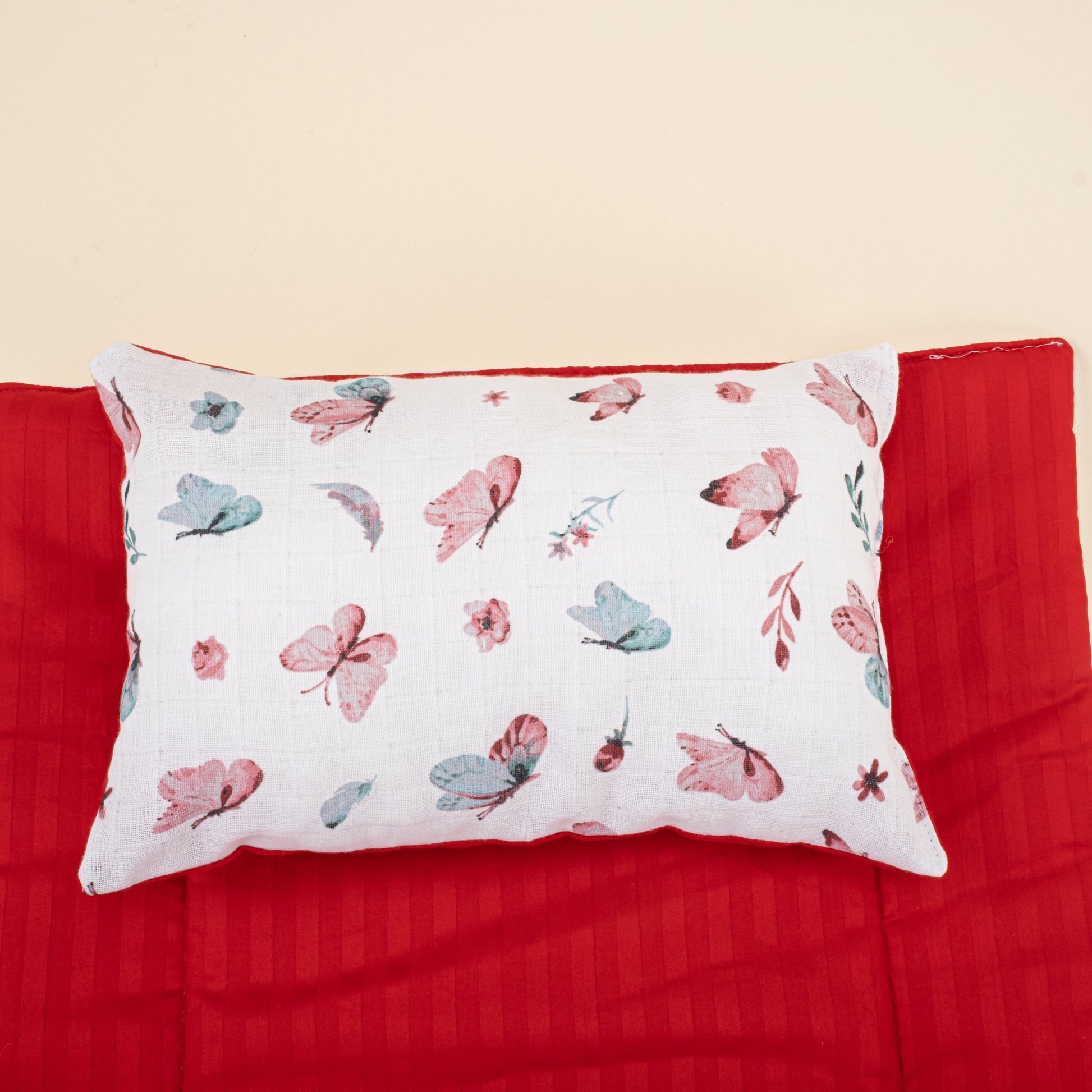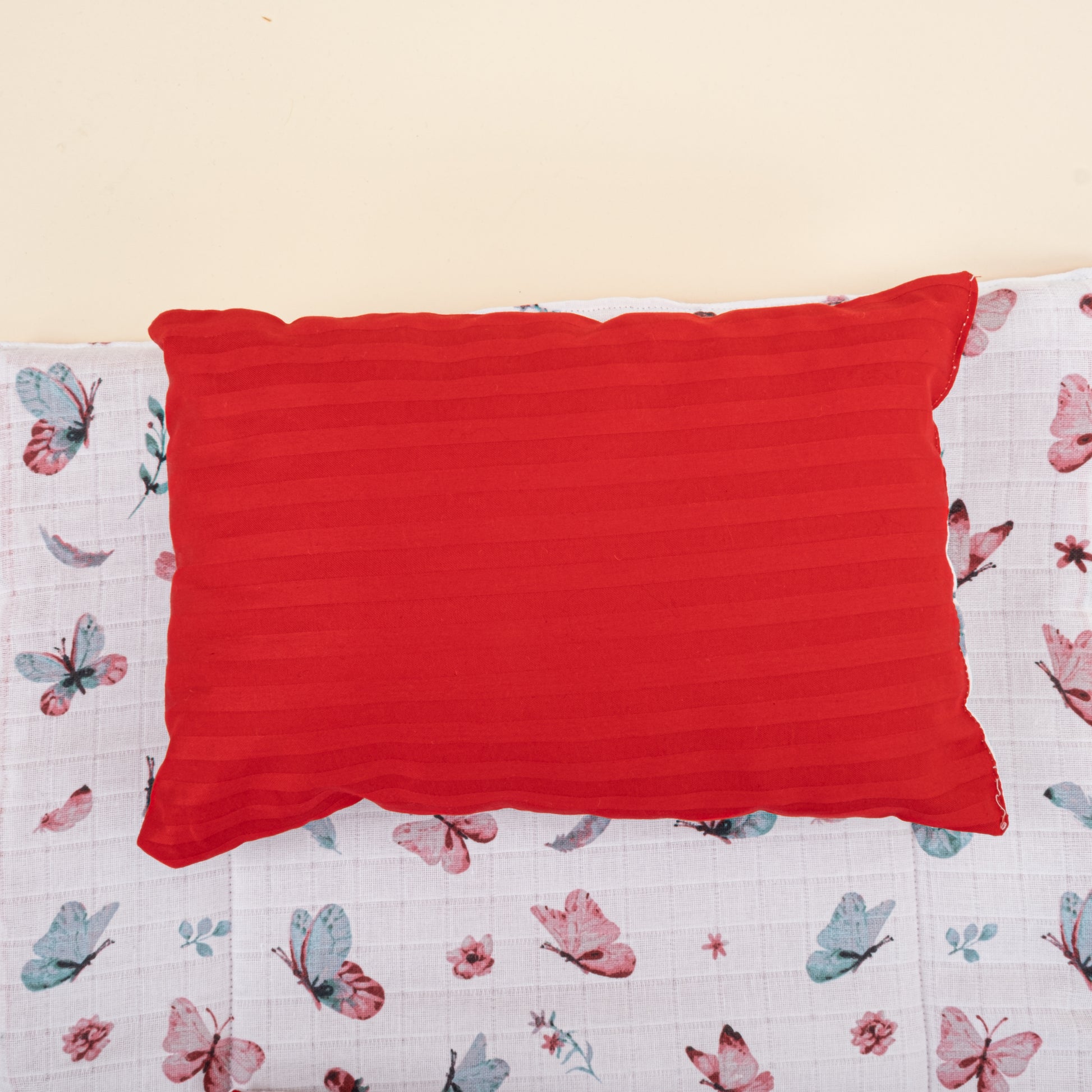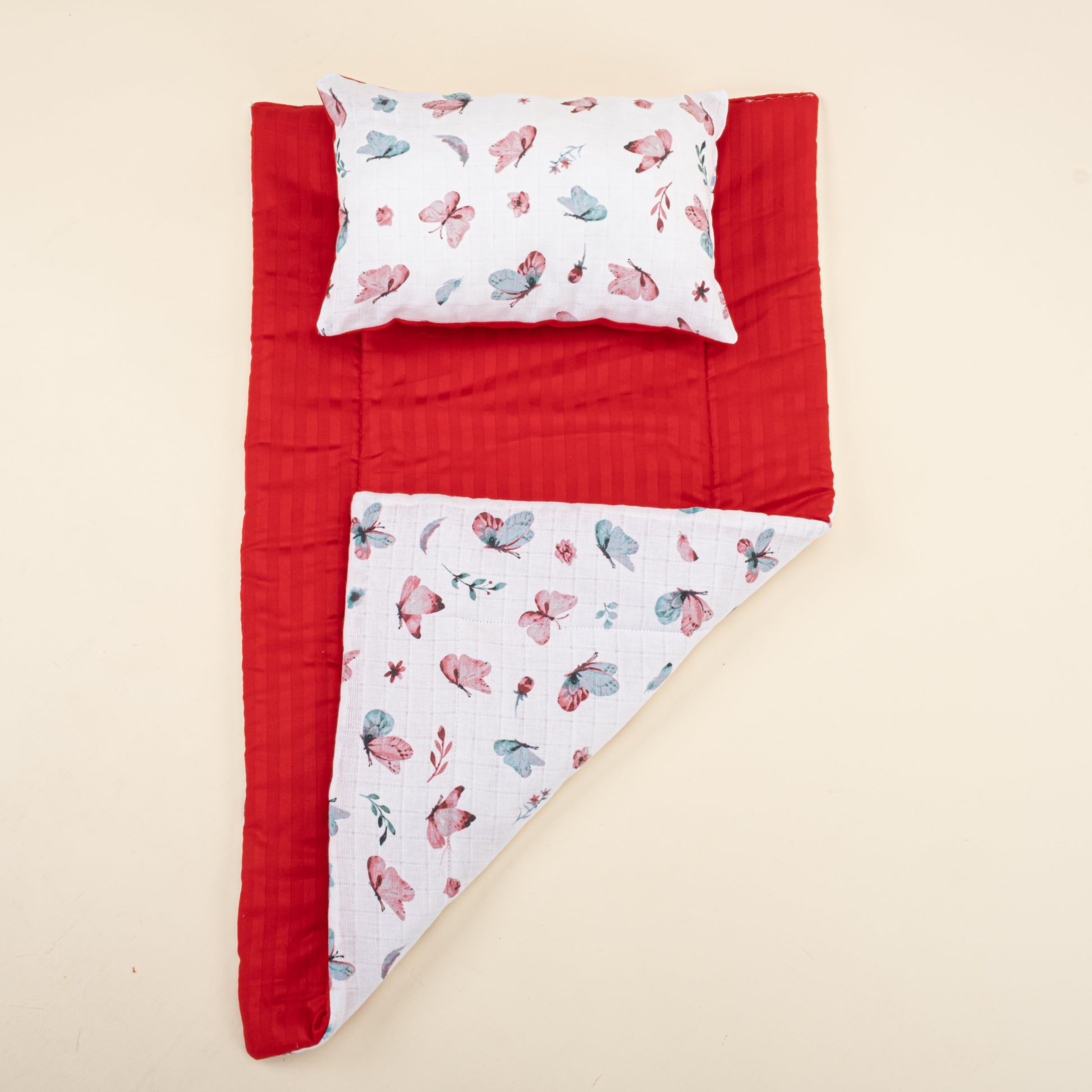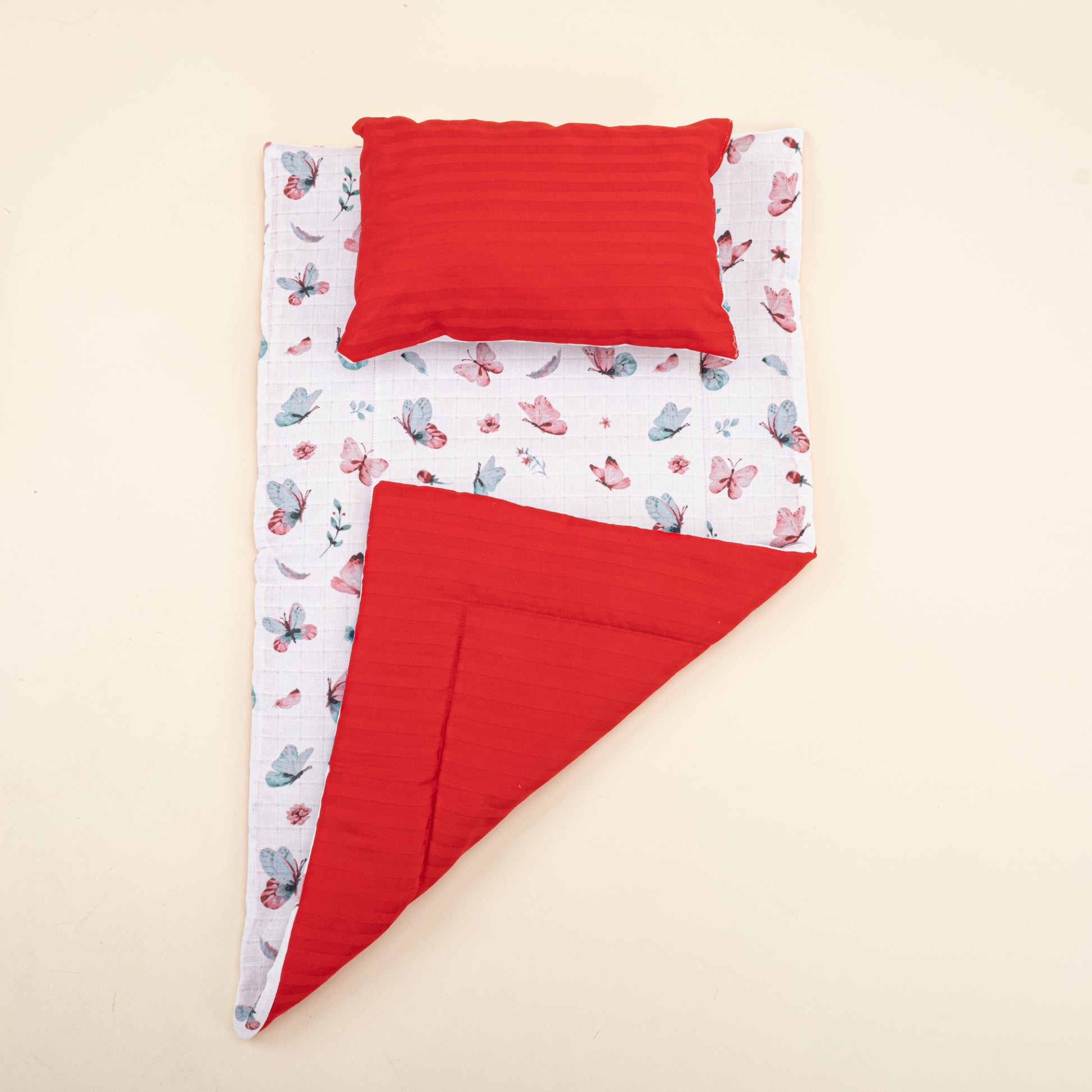 Alt Açma Matı ve Yastık - Çift Taraflı - Kırmızı Saten - Kelebek