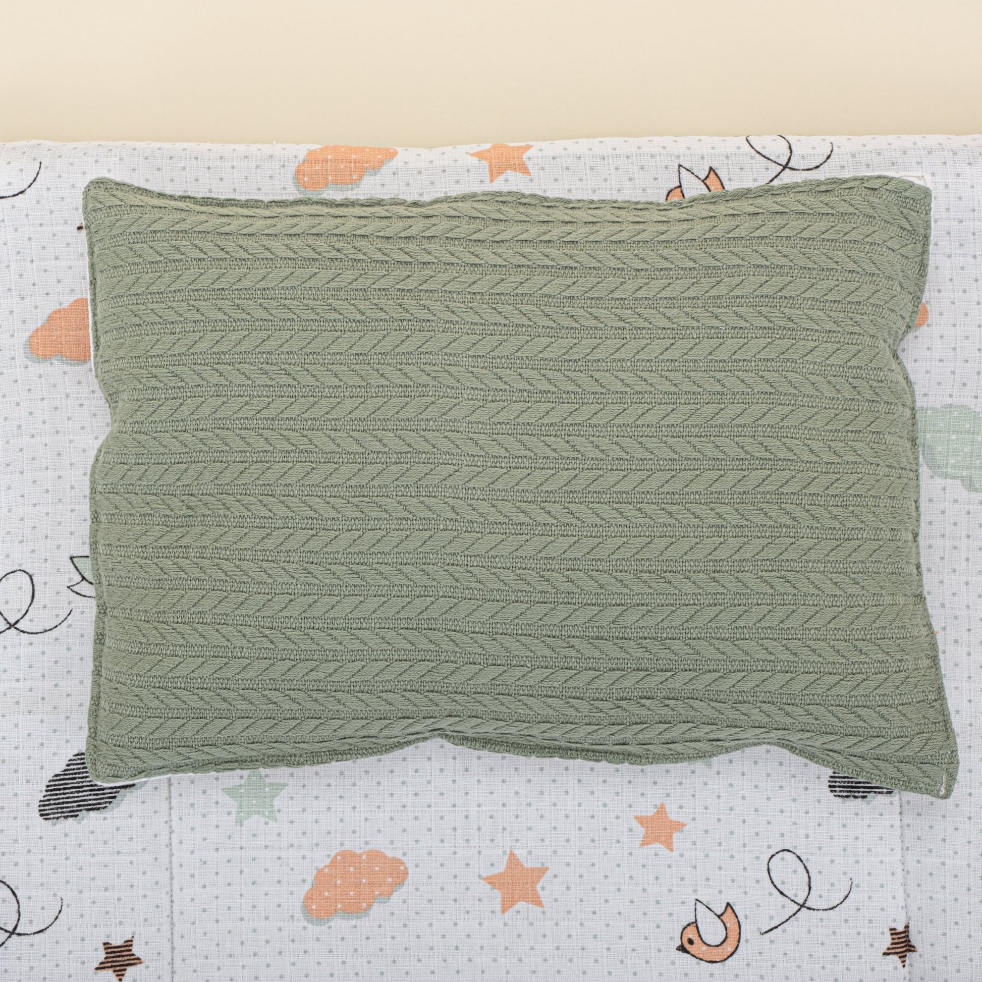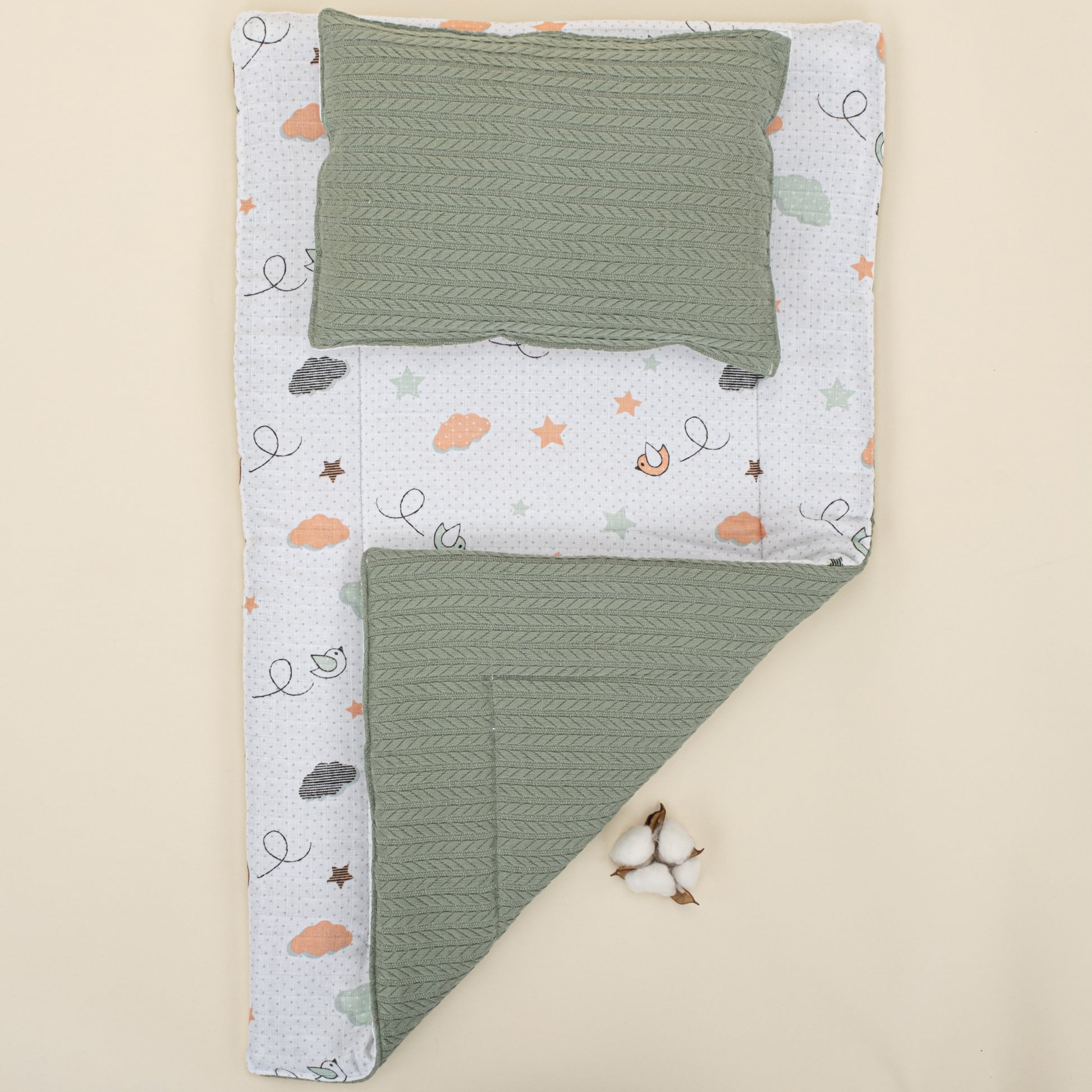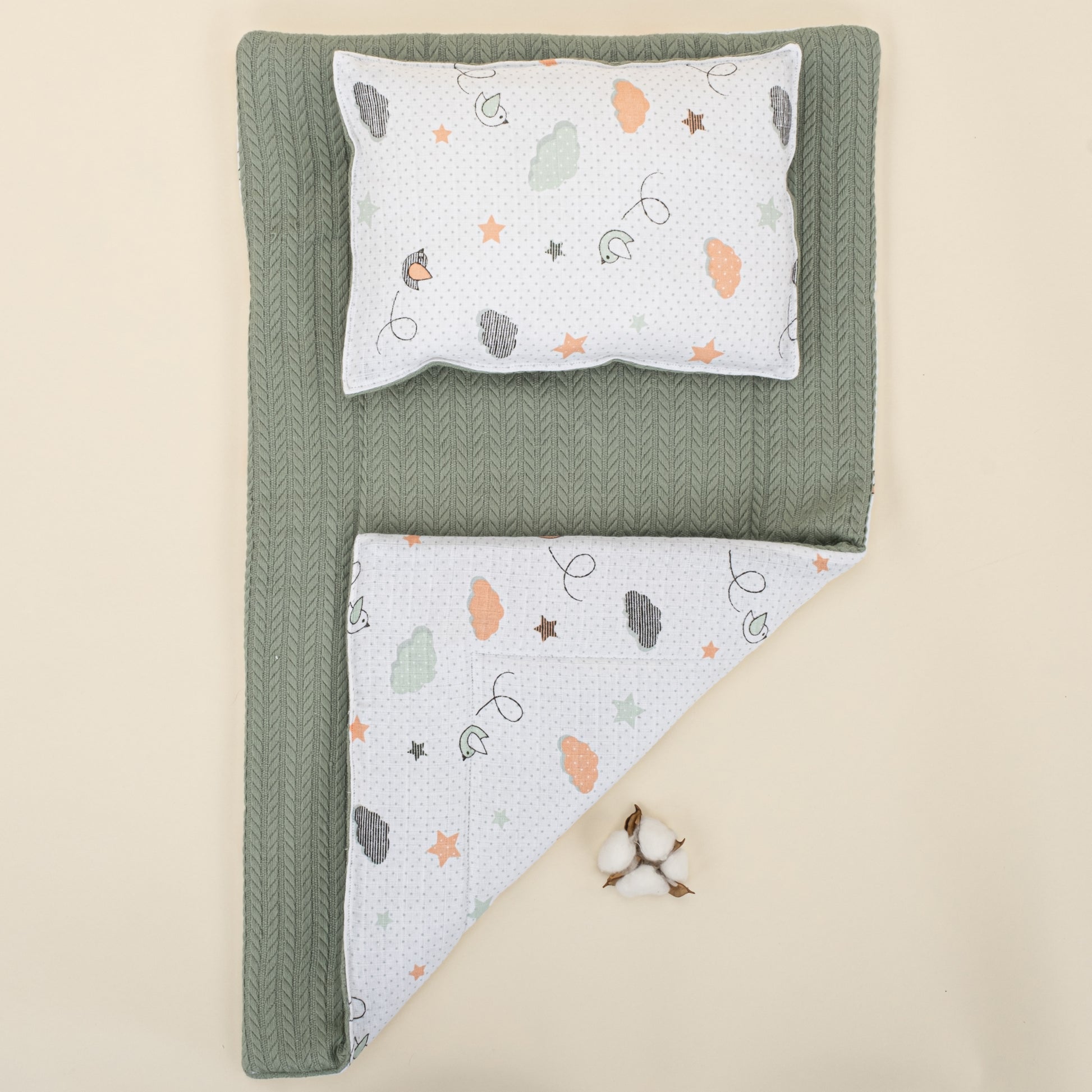 Alt Açma Matı ve Yastık - Çift Taraflı - Koyu Yeşil Örgü - Kuş