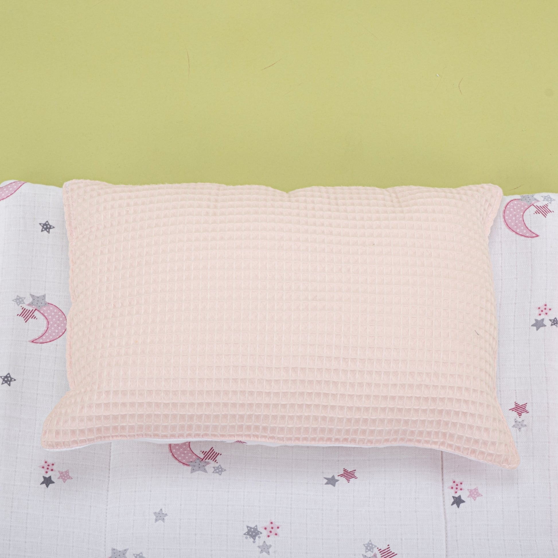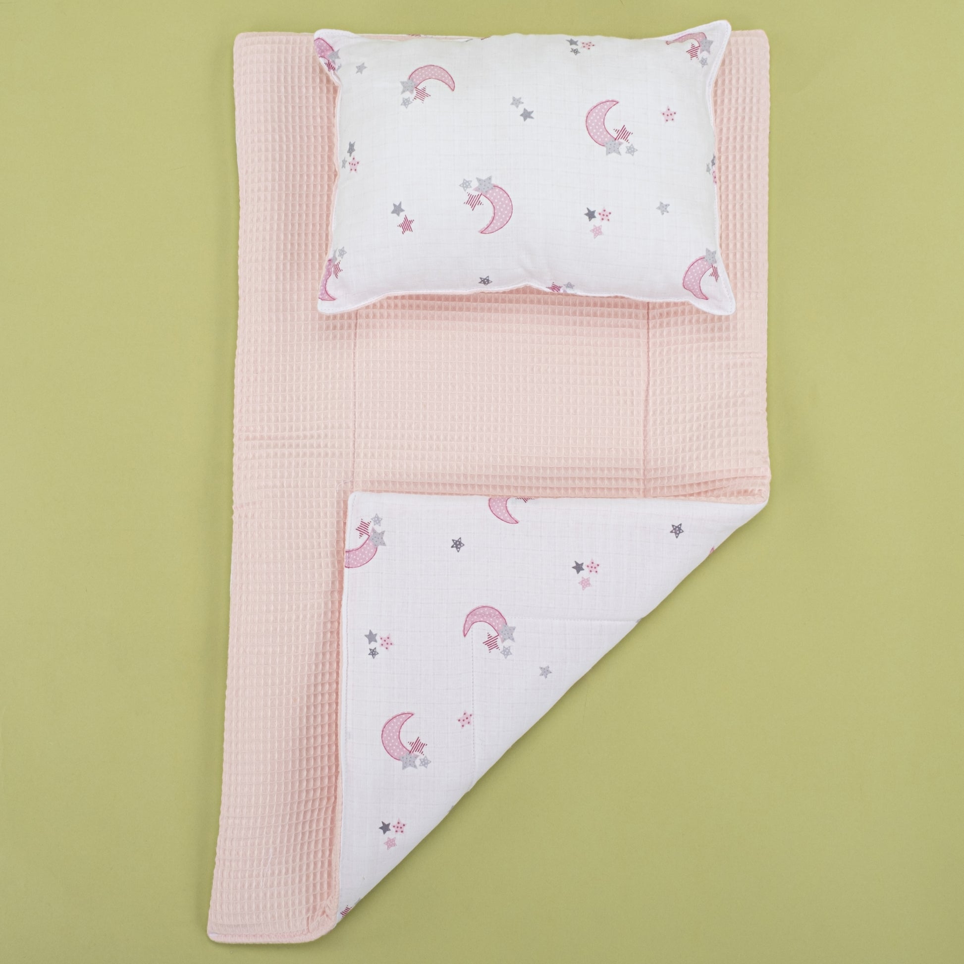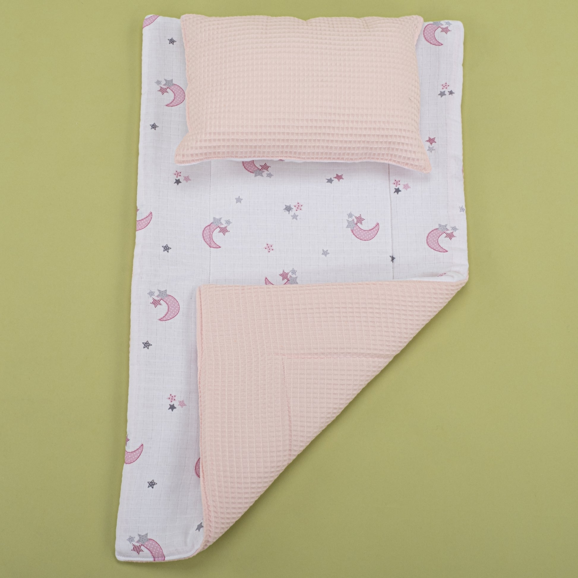 Alt Açma Matı ve Yastık - Çift Taraflı - Bebe Pembe Petek - Pembe Ay