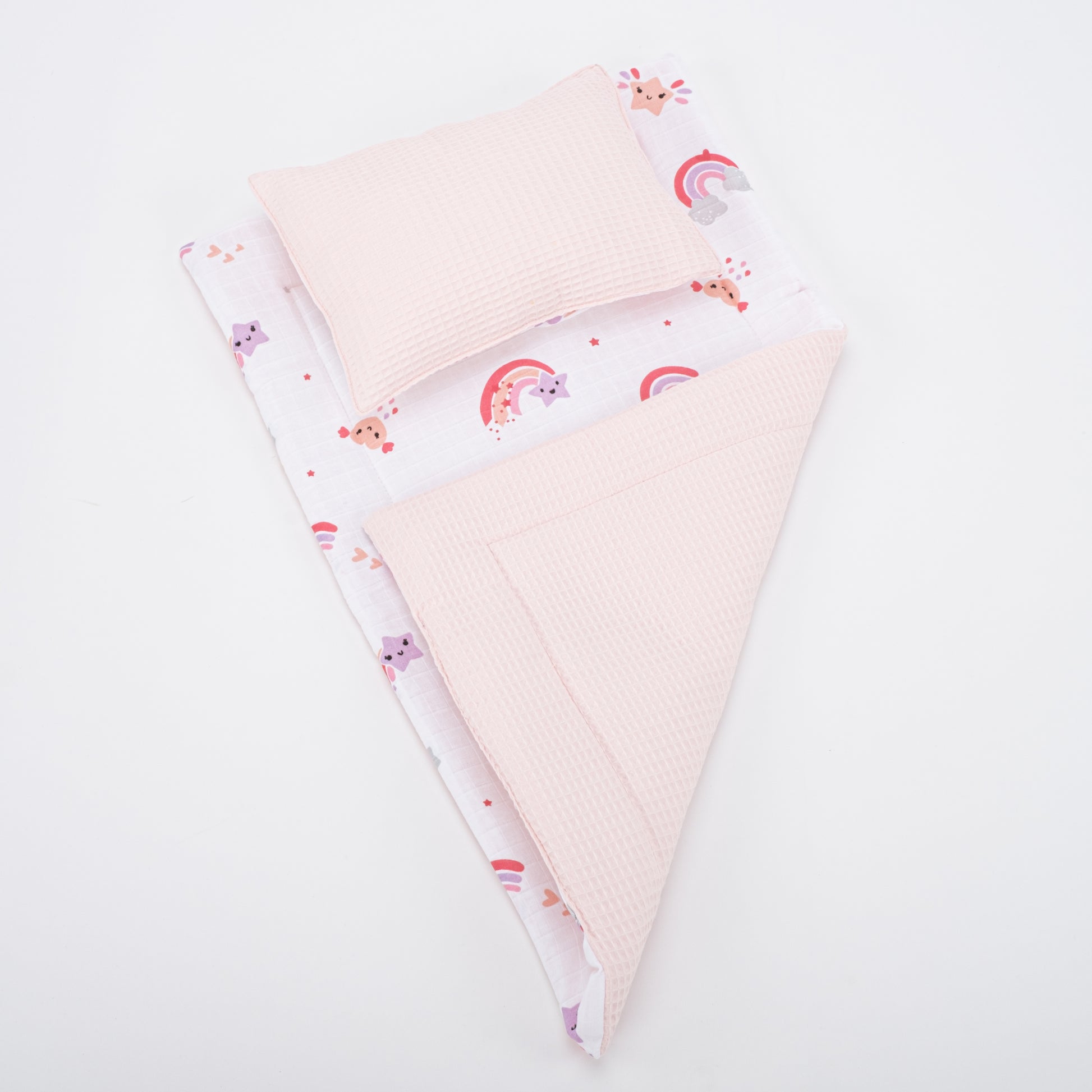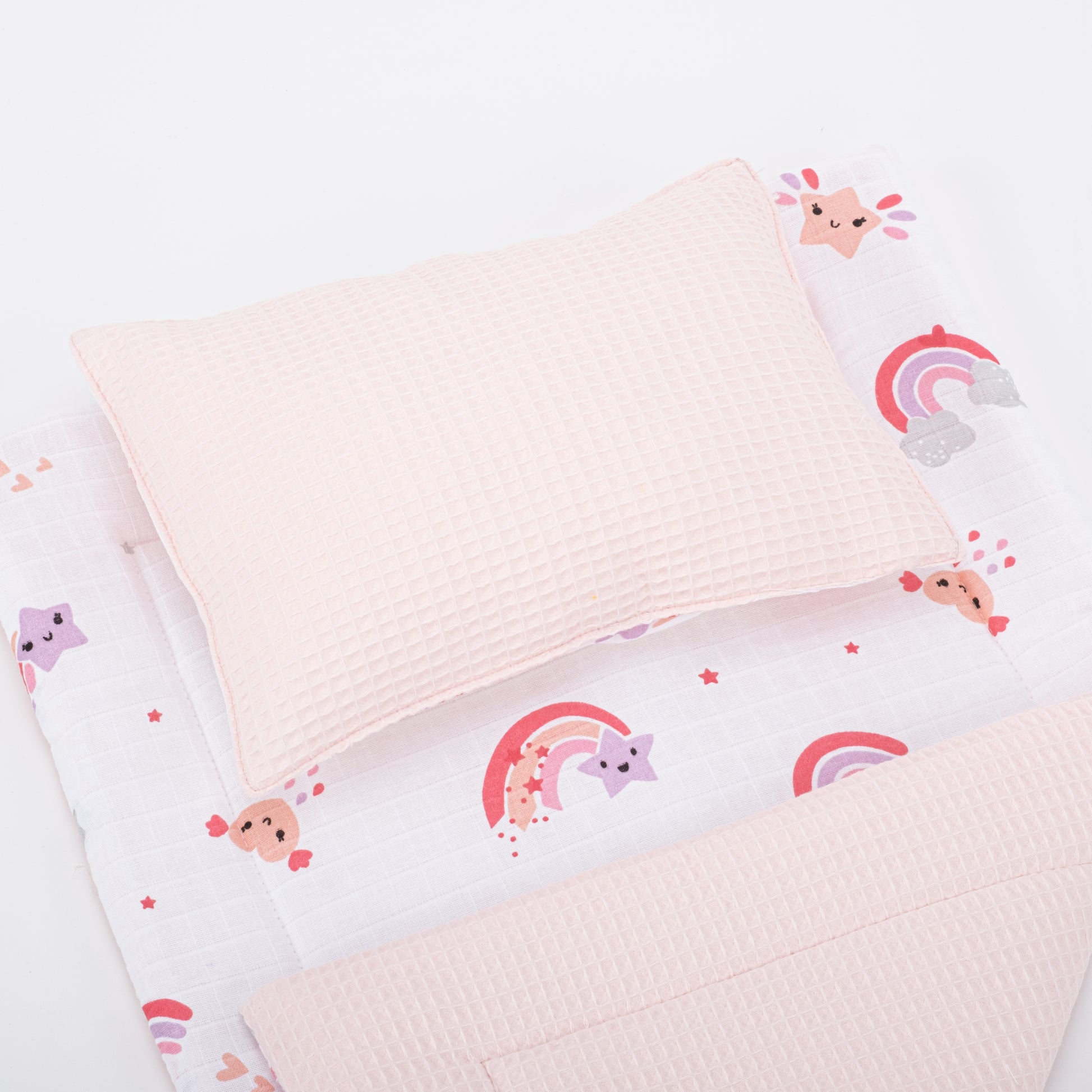 Alt Açma Matı ve Yastık - Çift Taraflı - Bebe Pembe Petek - Pembe Gökkuşağı