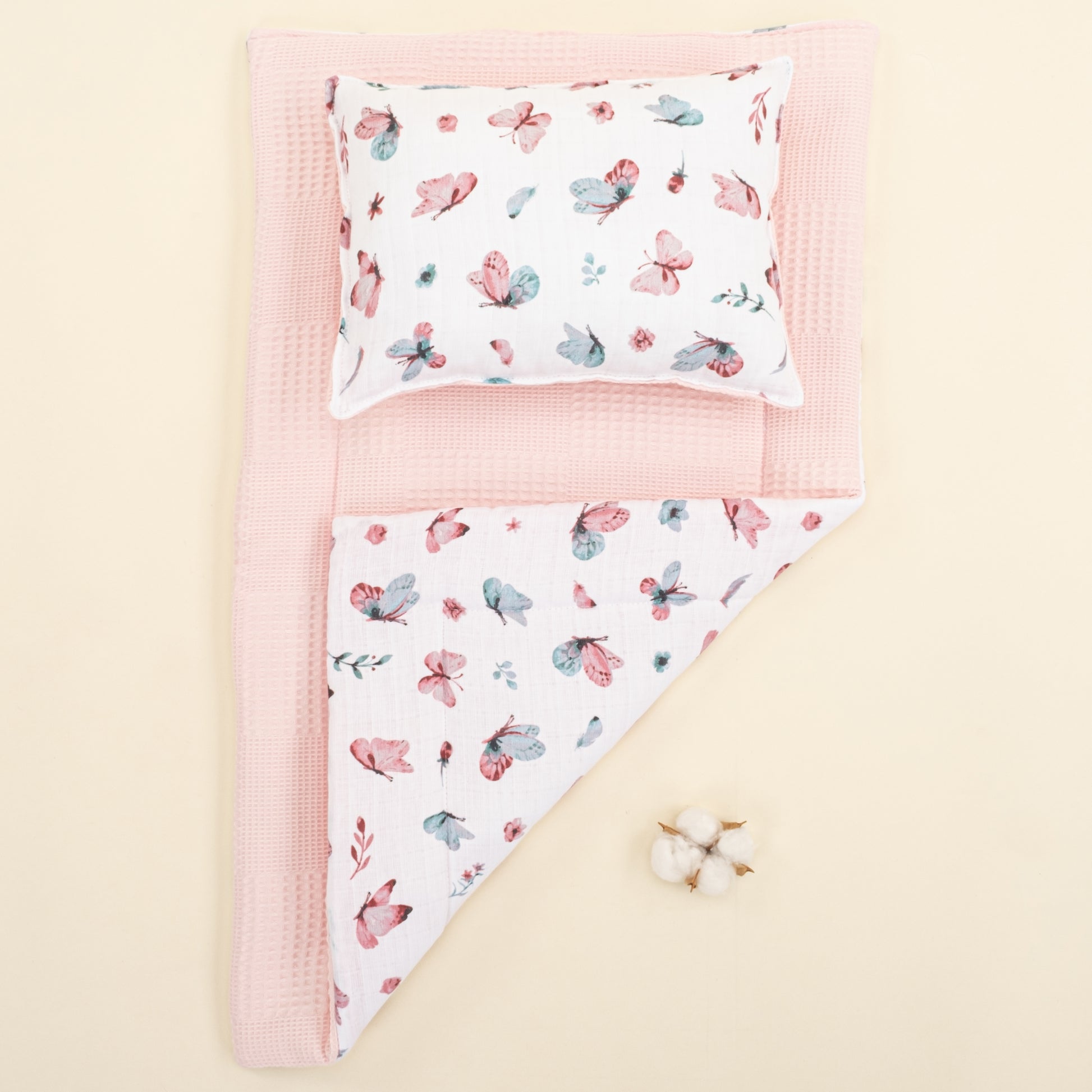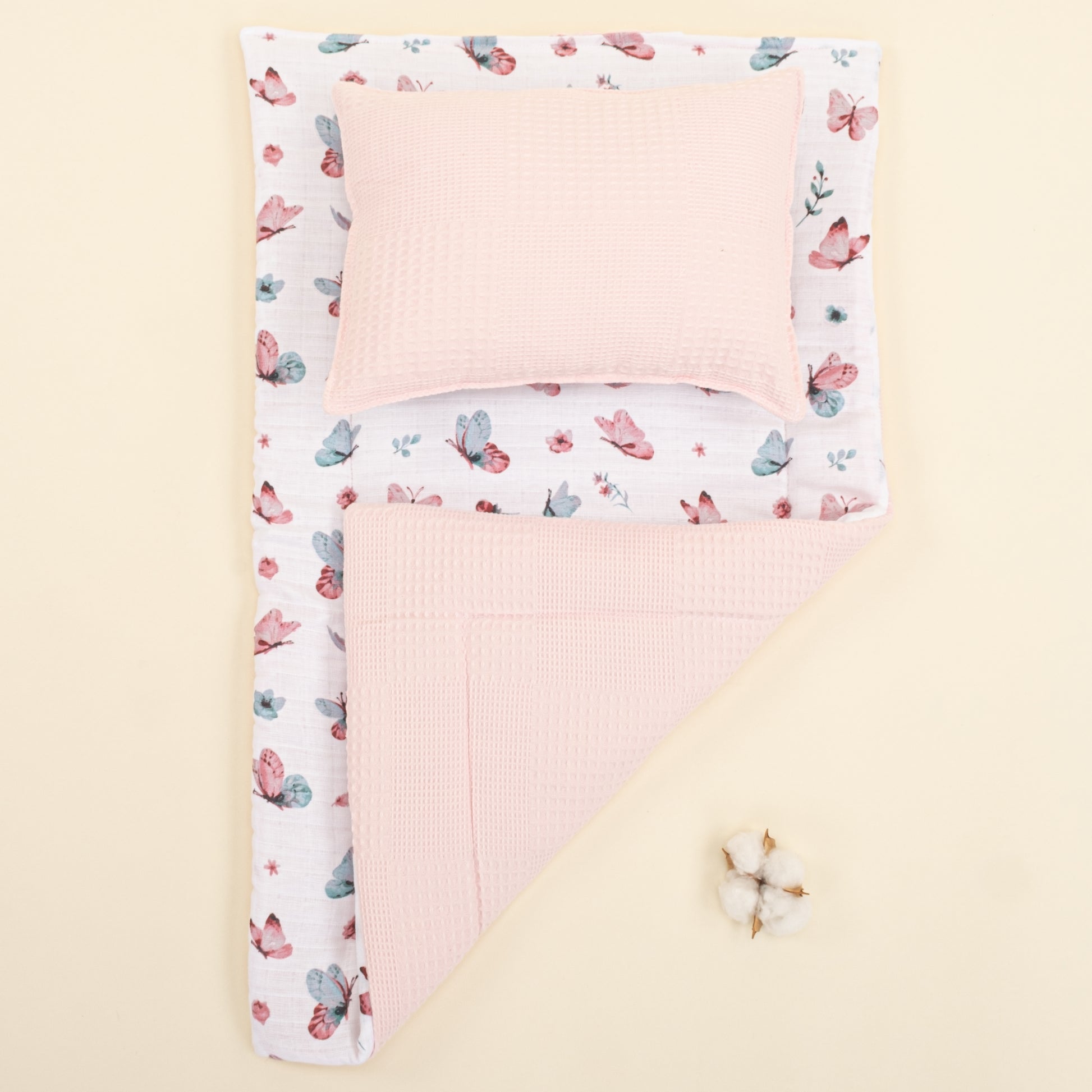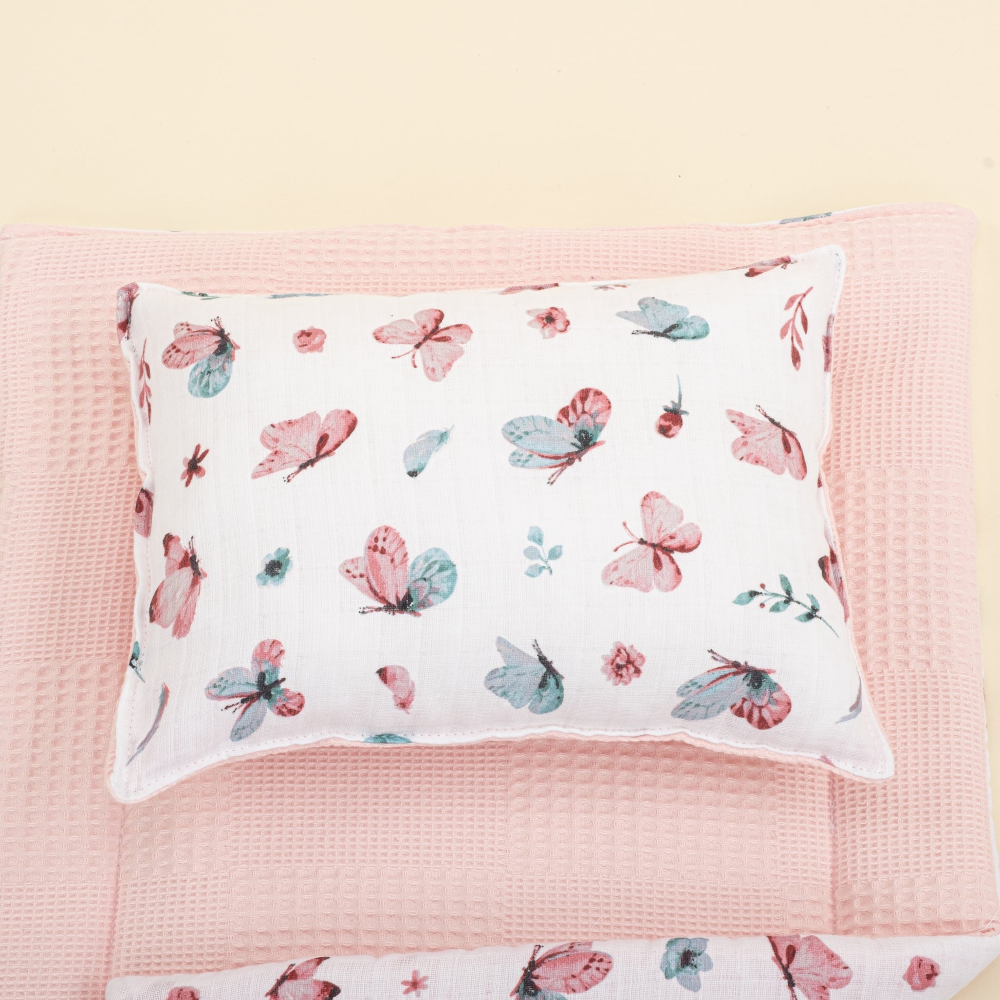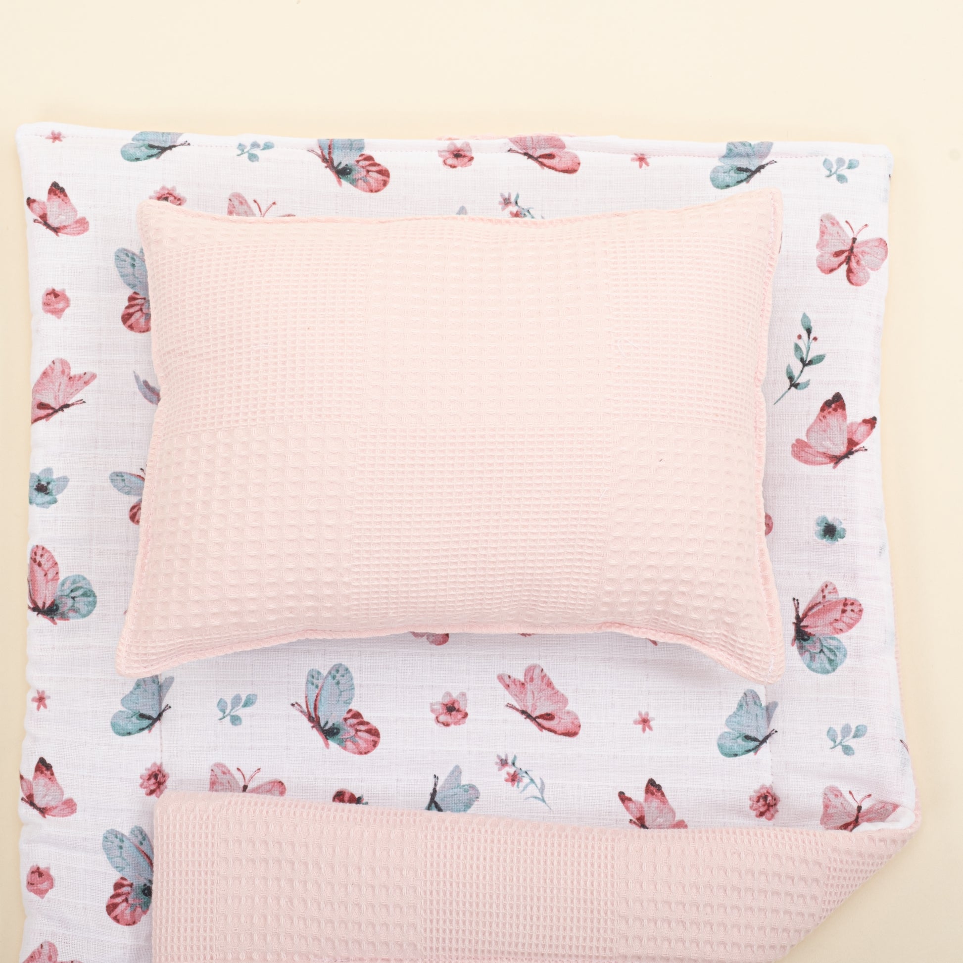 Alt Açma Matı ve Yastık - Çift Taraflı - Pembe Waffle - Kelebekler