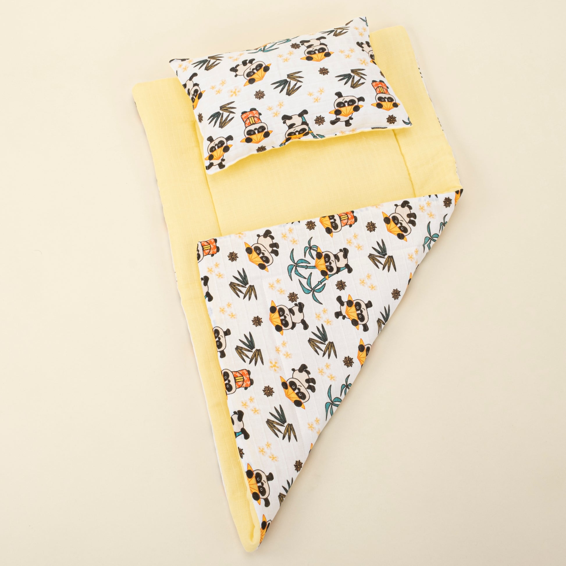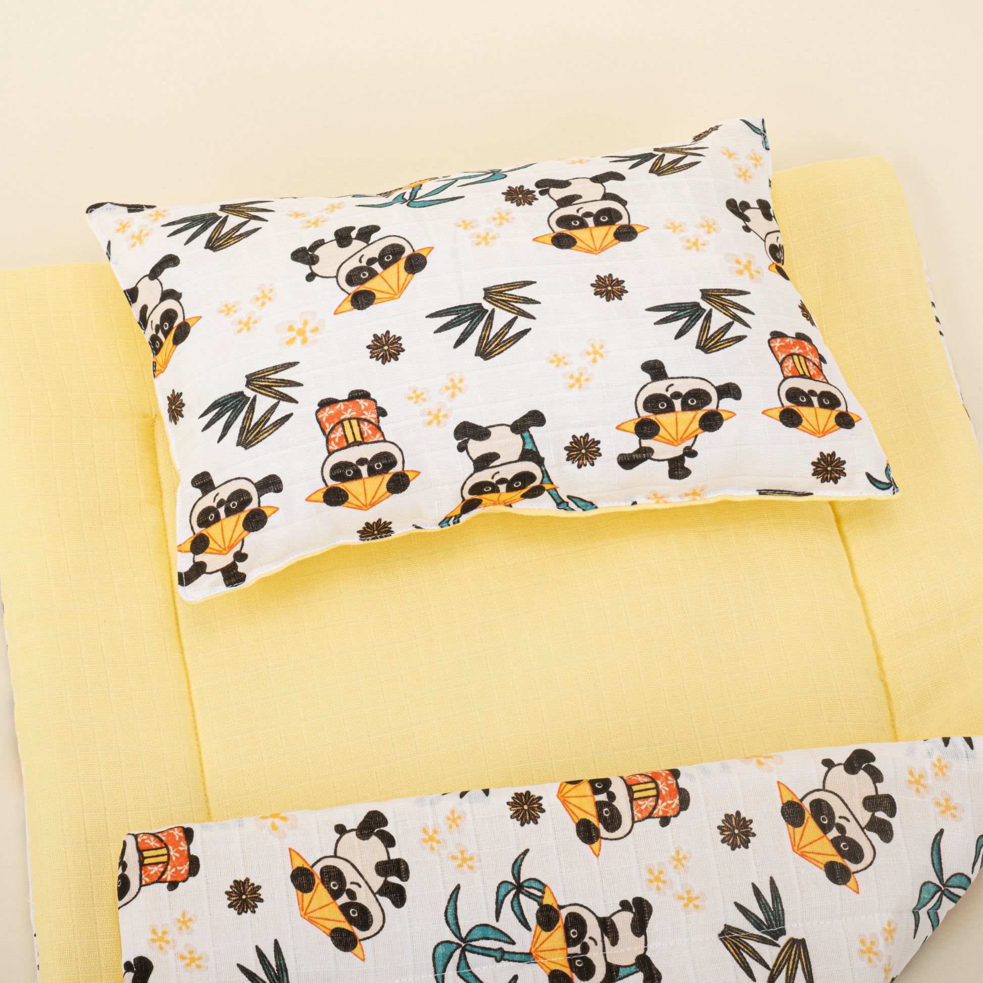 Alt Açma Matı ve Yastık - Çift Taraflı - Sarı Muslin - Tropikal Panda
