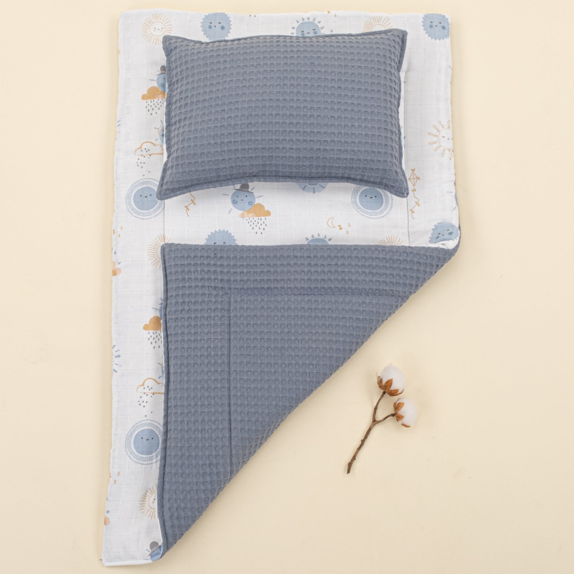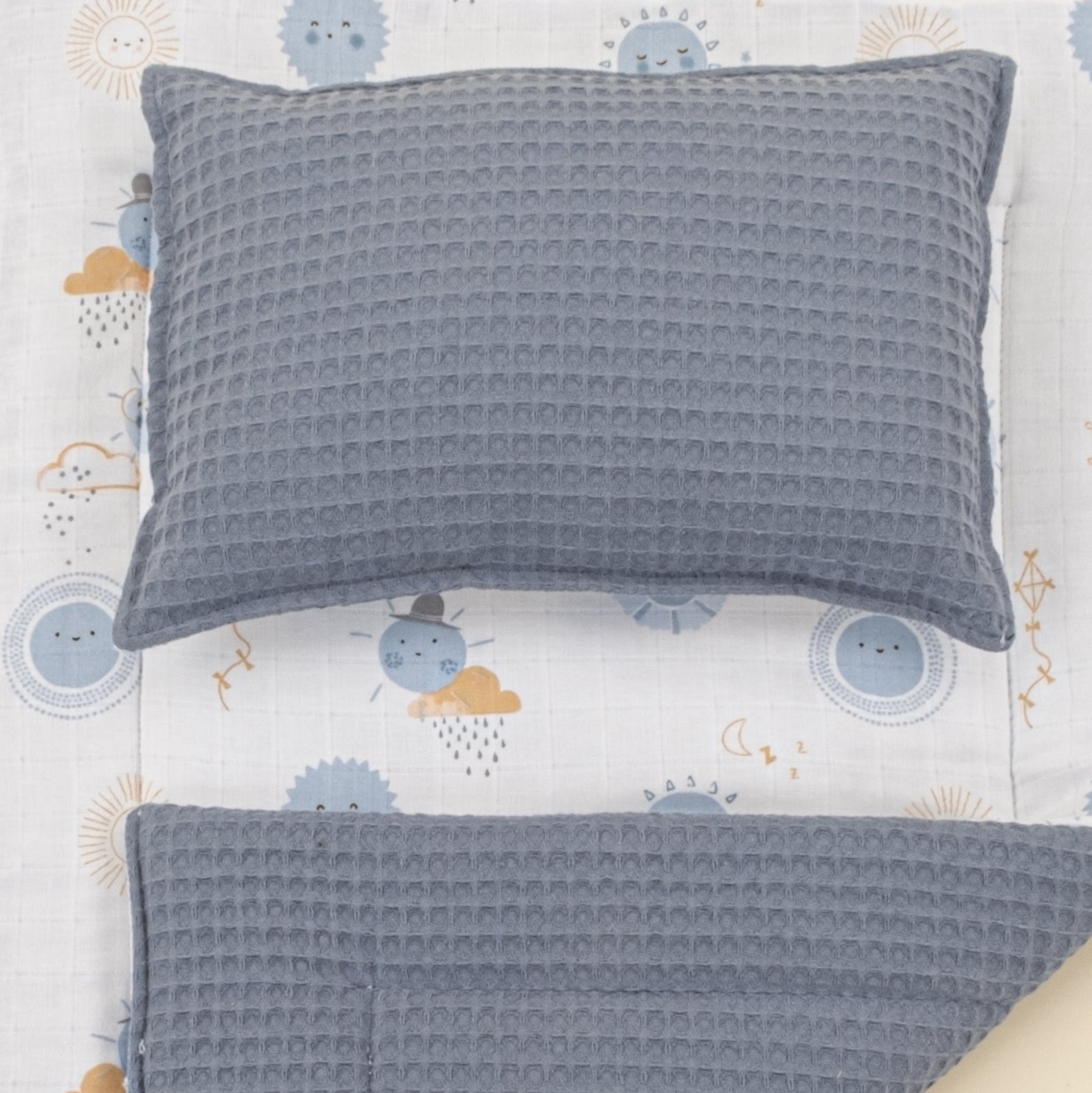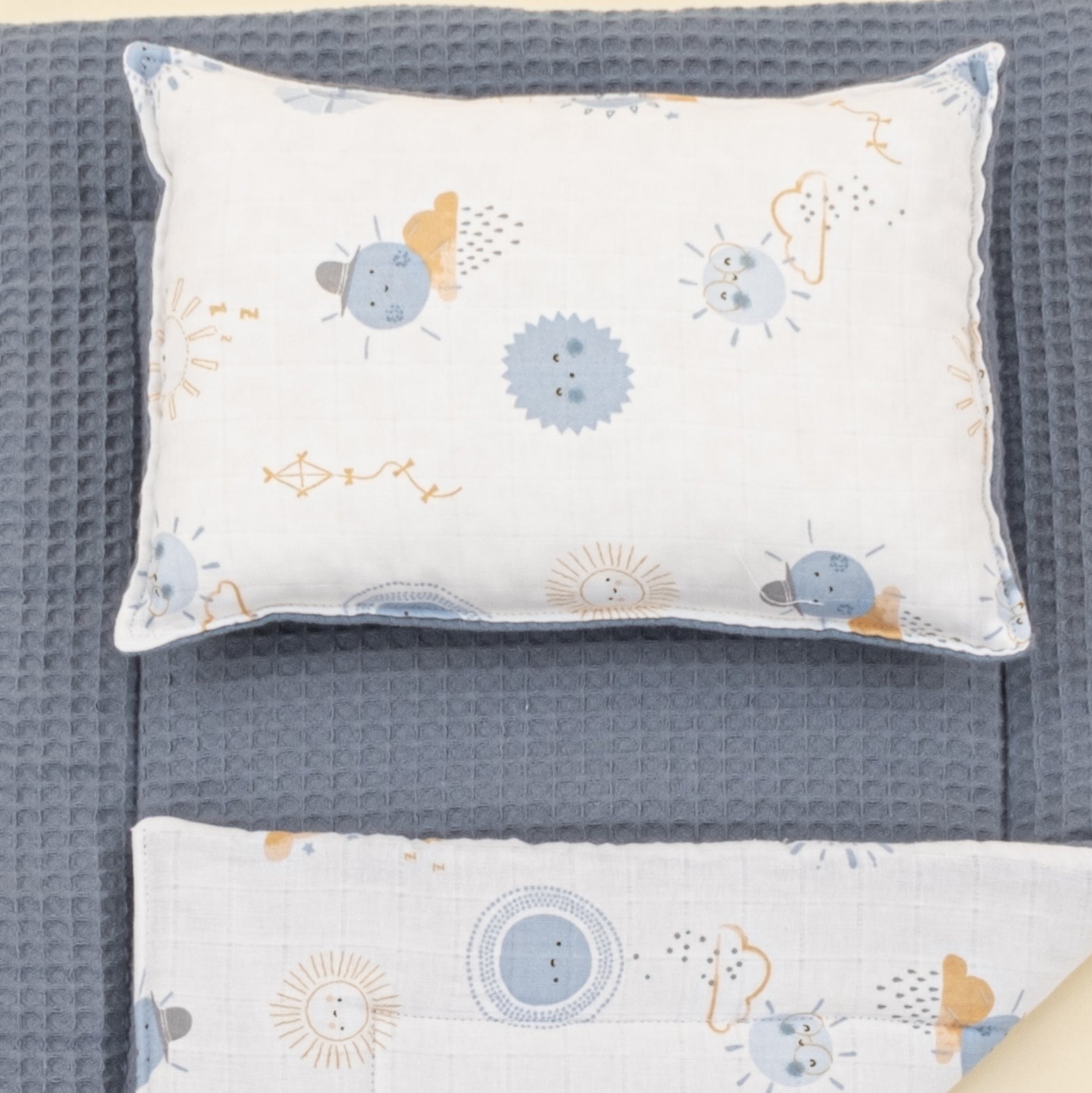 Alt Açma Matı ve Yastık - Çift Taraflı - Açık İndigo Petek - Mavi Güneş