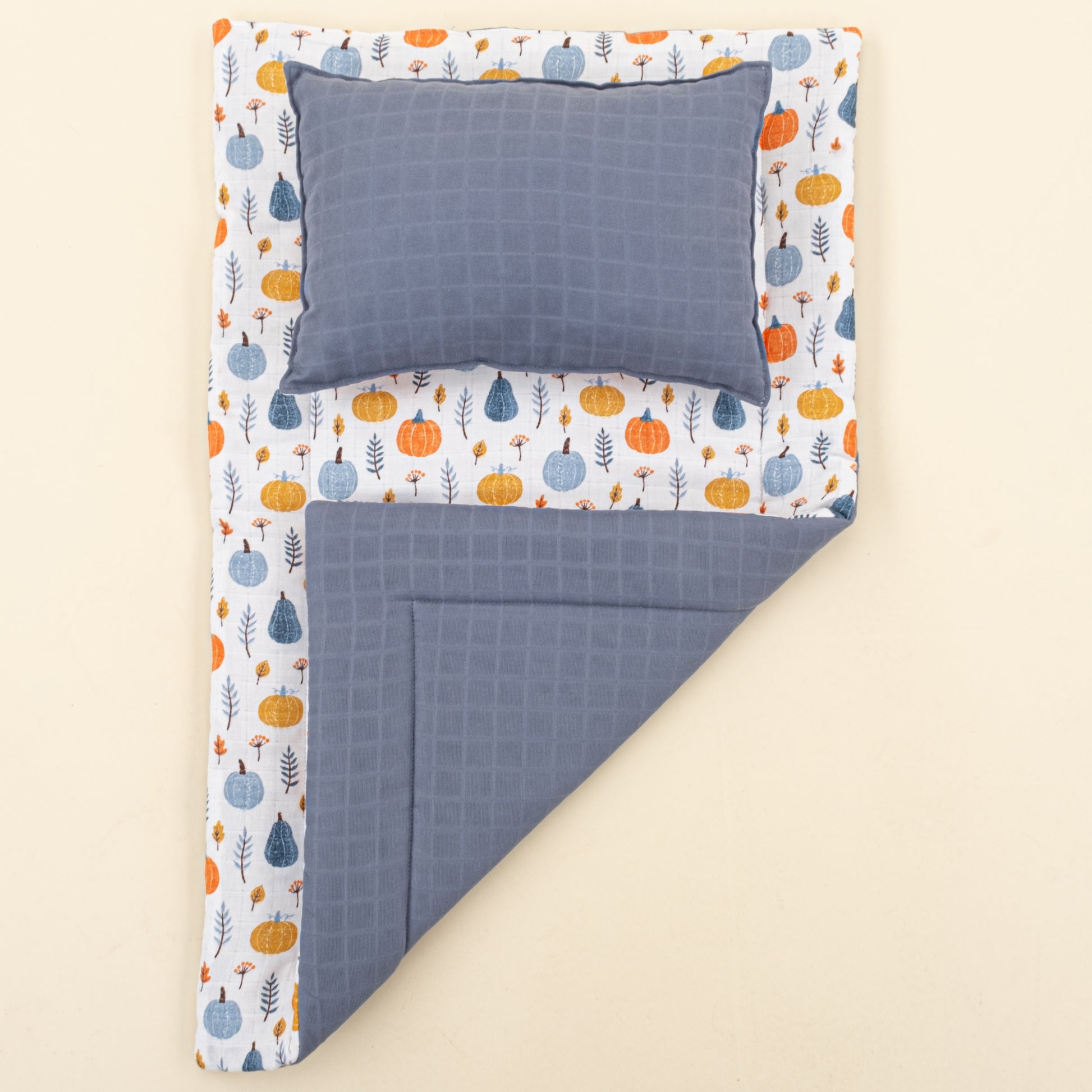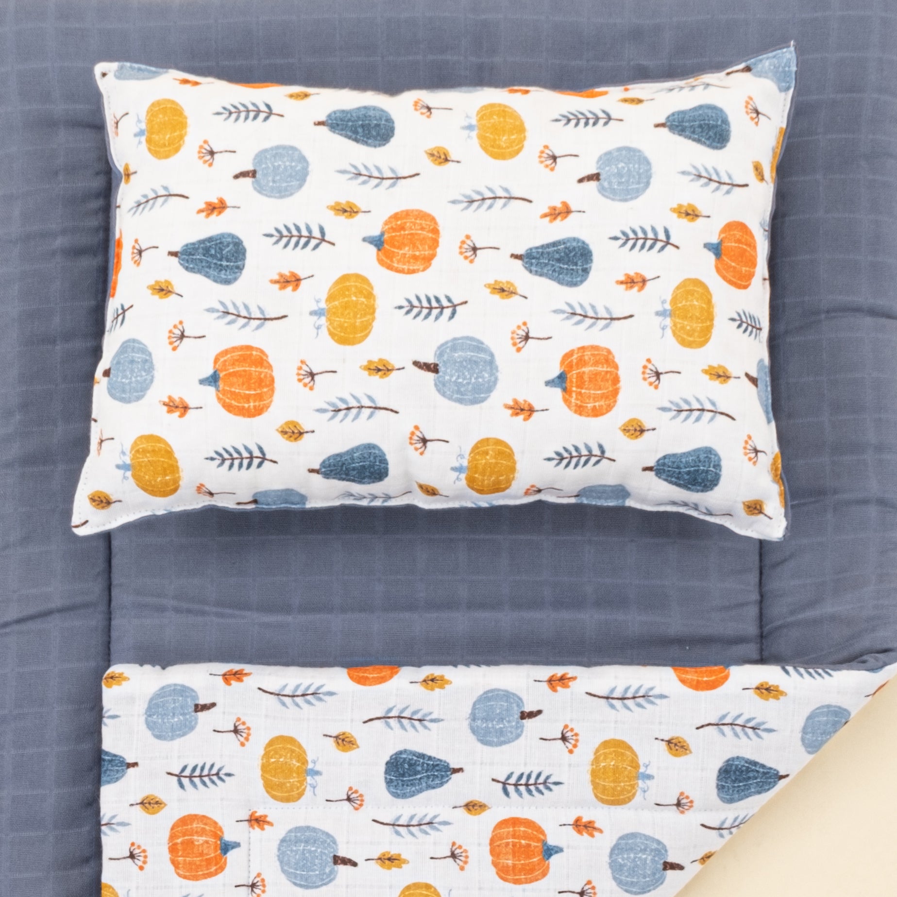 Alt Açma Matı ve Yastık - Çift Taraflı - İndigo Muslin - Mavi Balkabağı