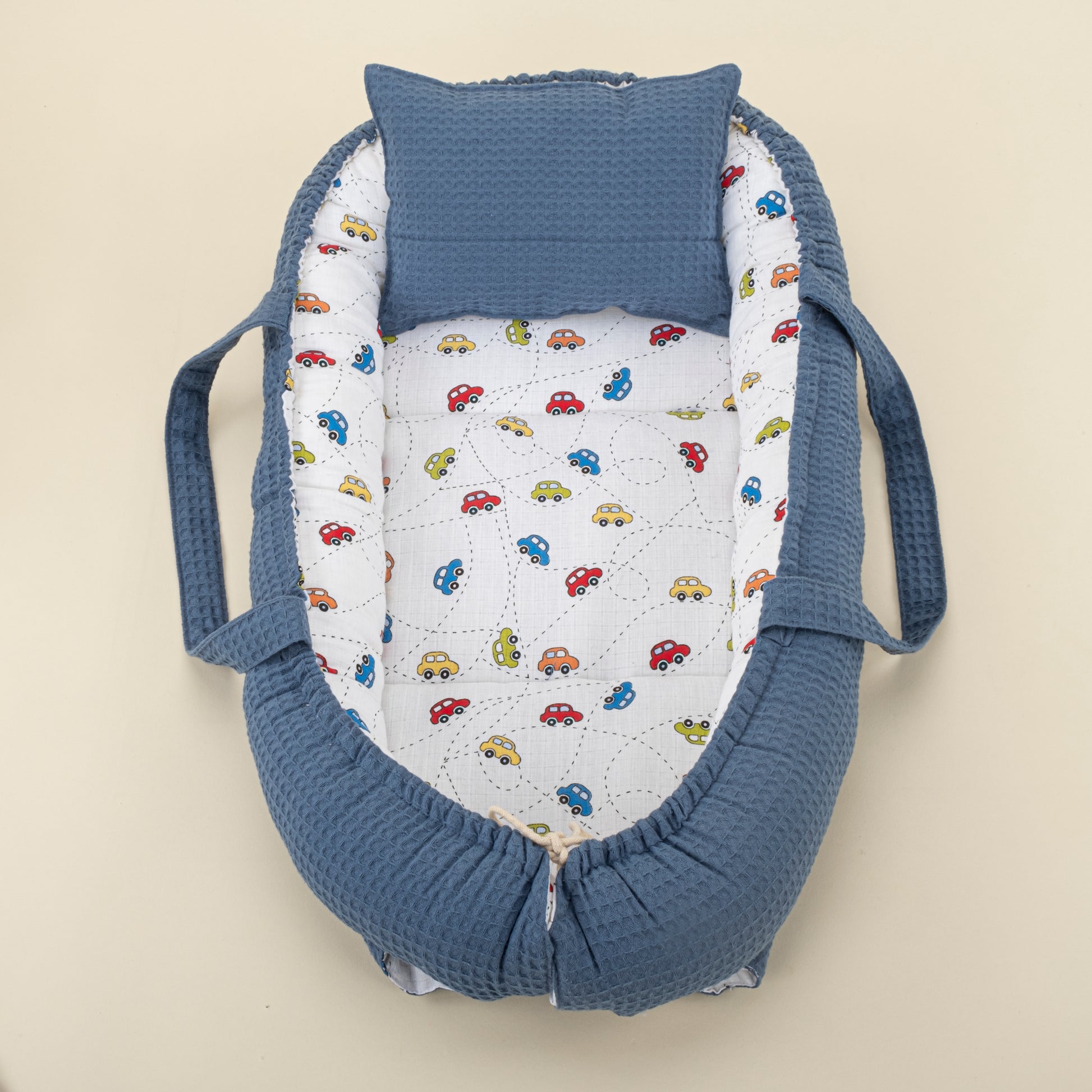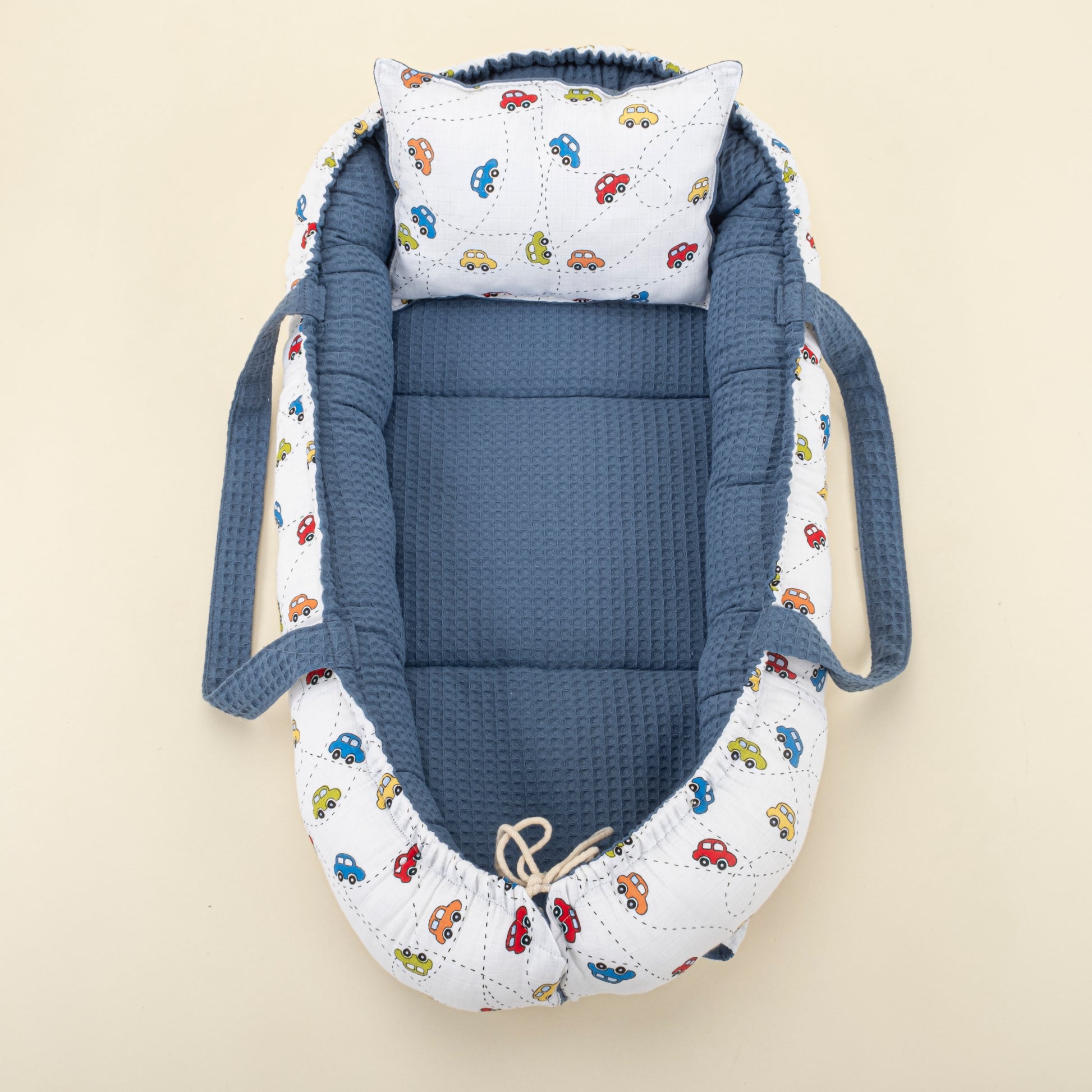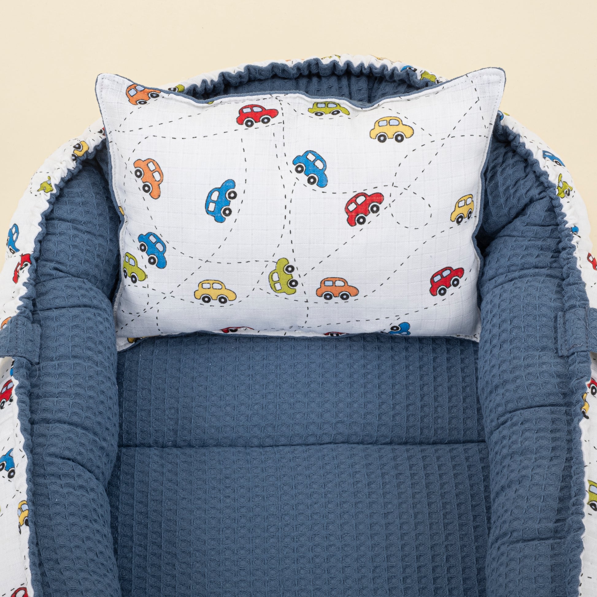 Babynest ve Yastık- Çift Taraflı - İndigo Petek - Renkli Arabalar