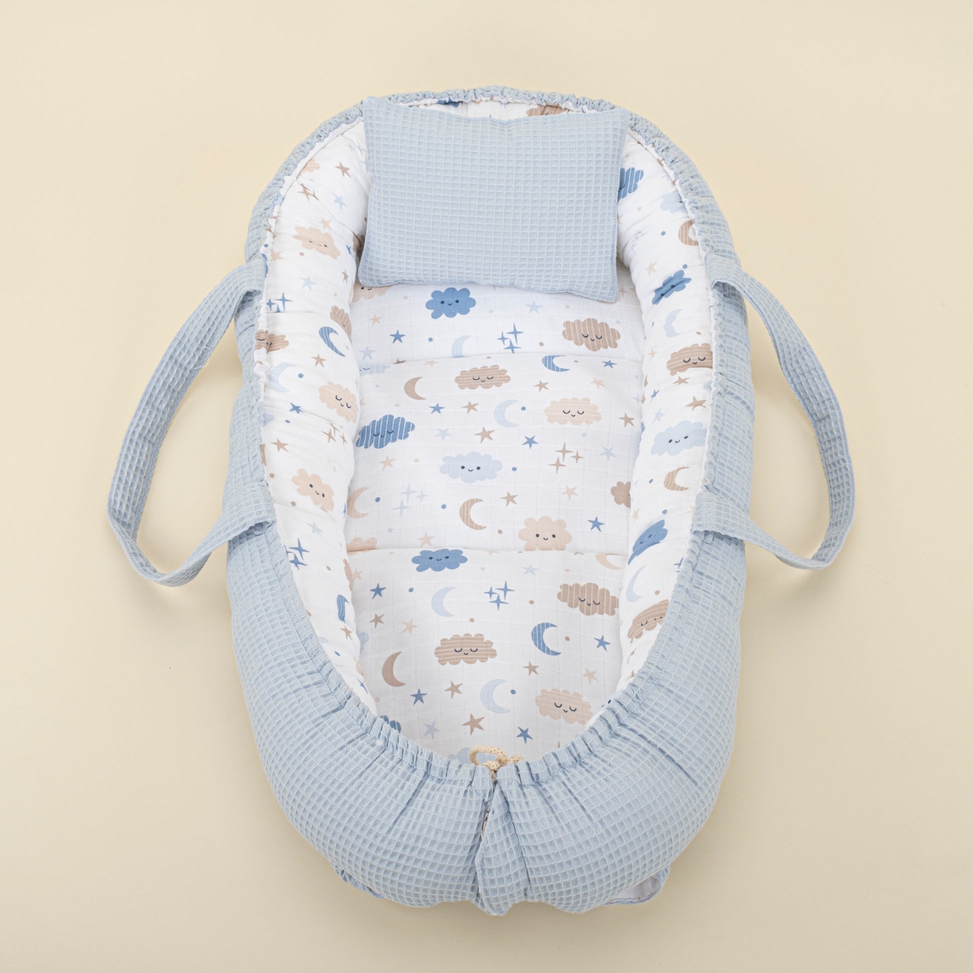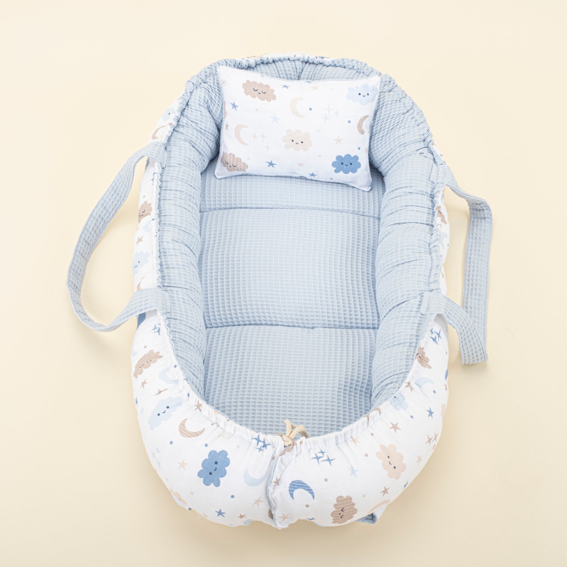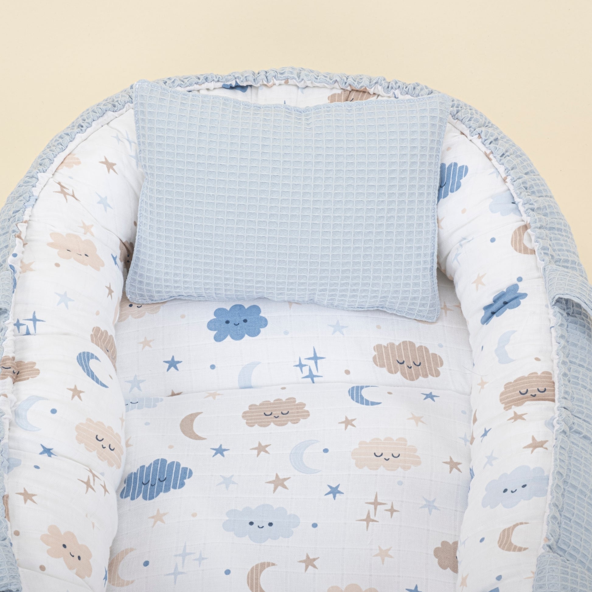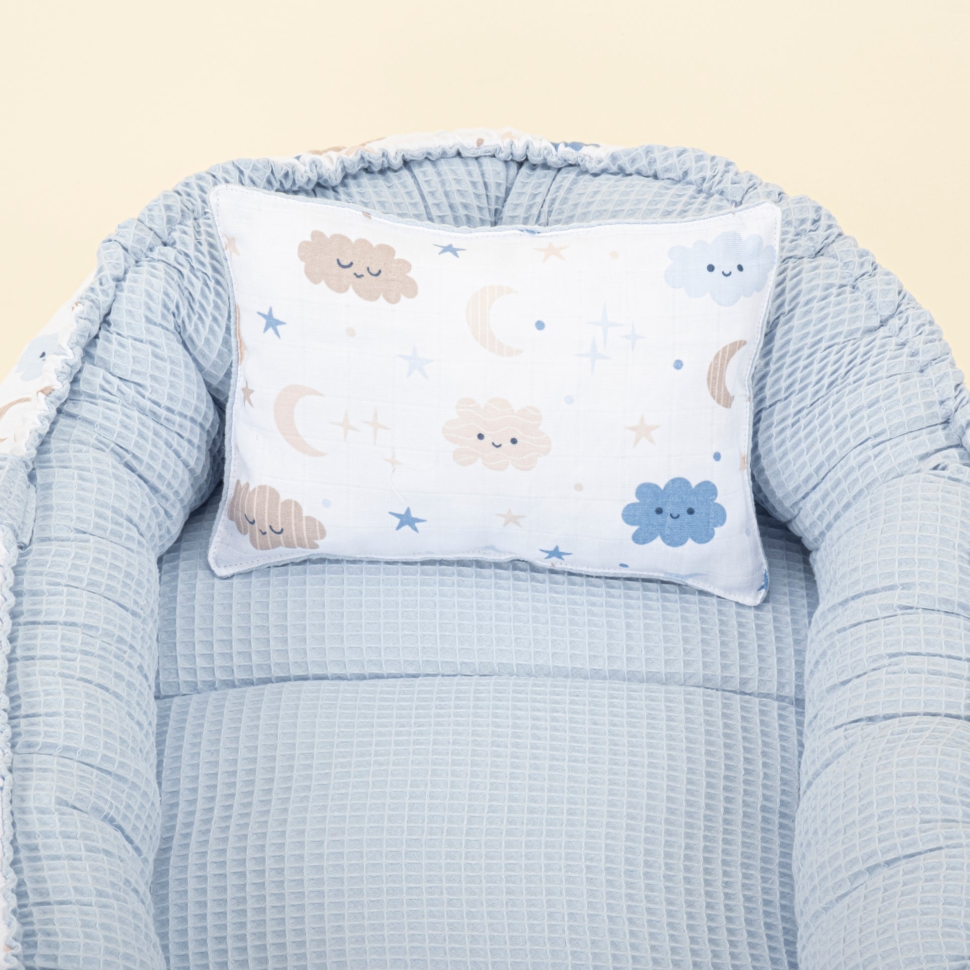 Babynest ve Yastık - Çift Taraflı - Bebe Mavi Petek - Mavi Bulut