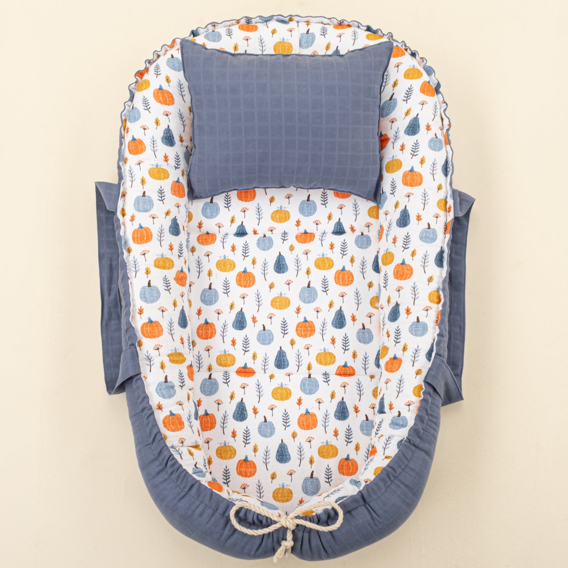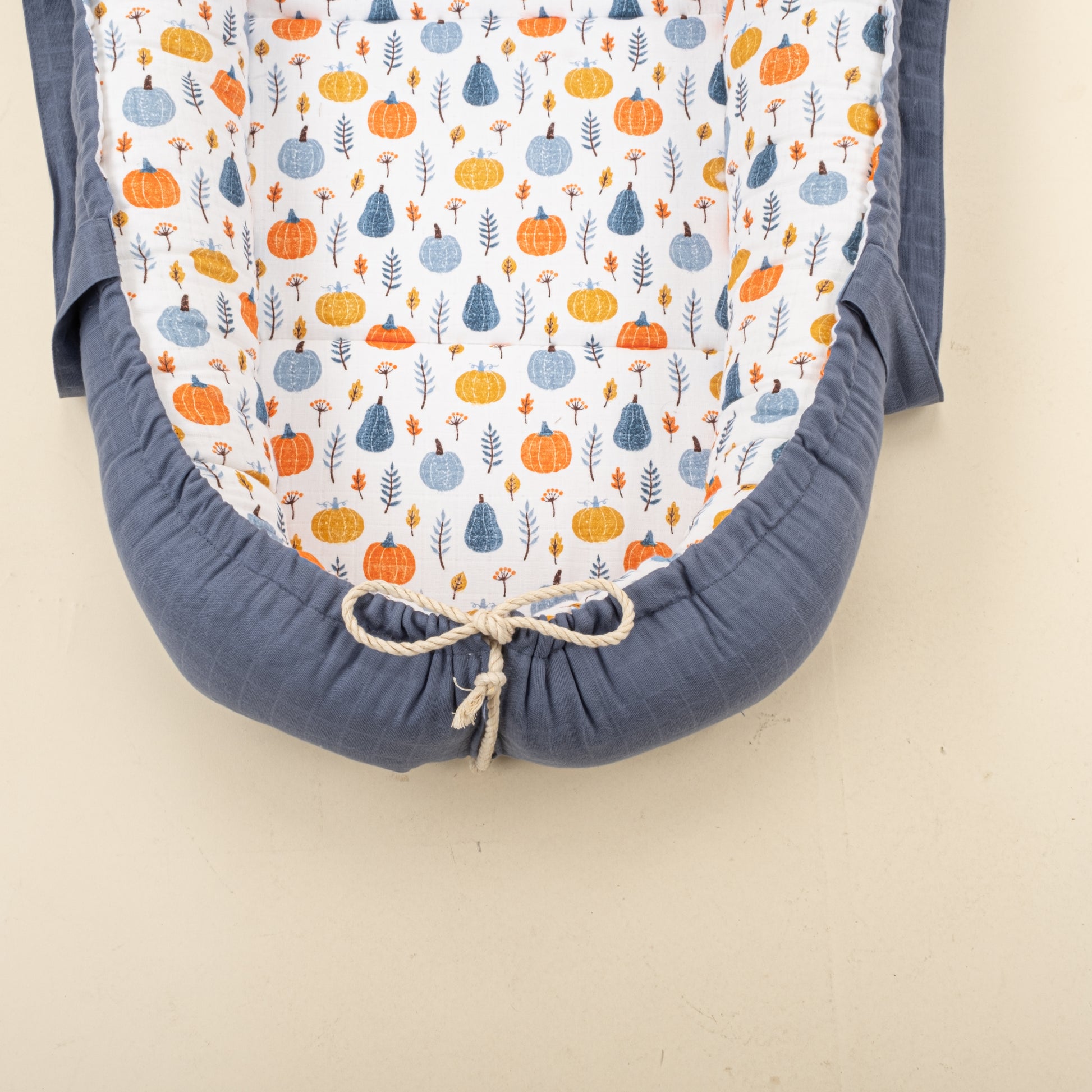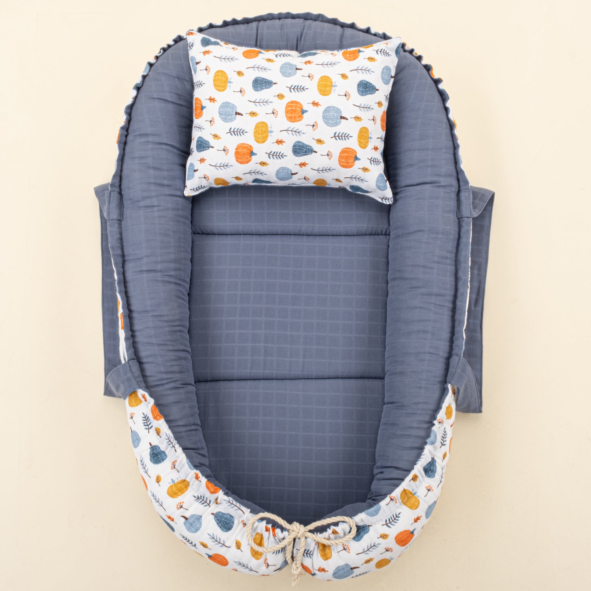 Babynest ve Yastık - Çift Taraflı - İndigo Muslin - Mavi Balkabağı