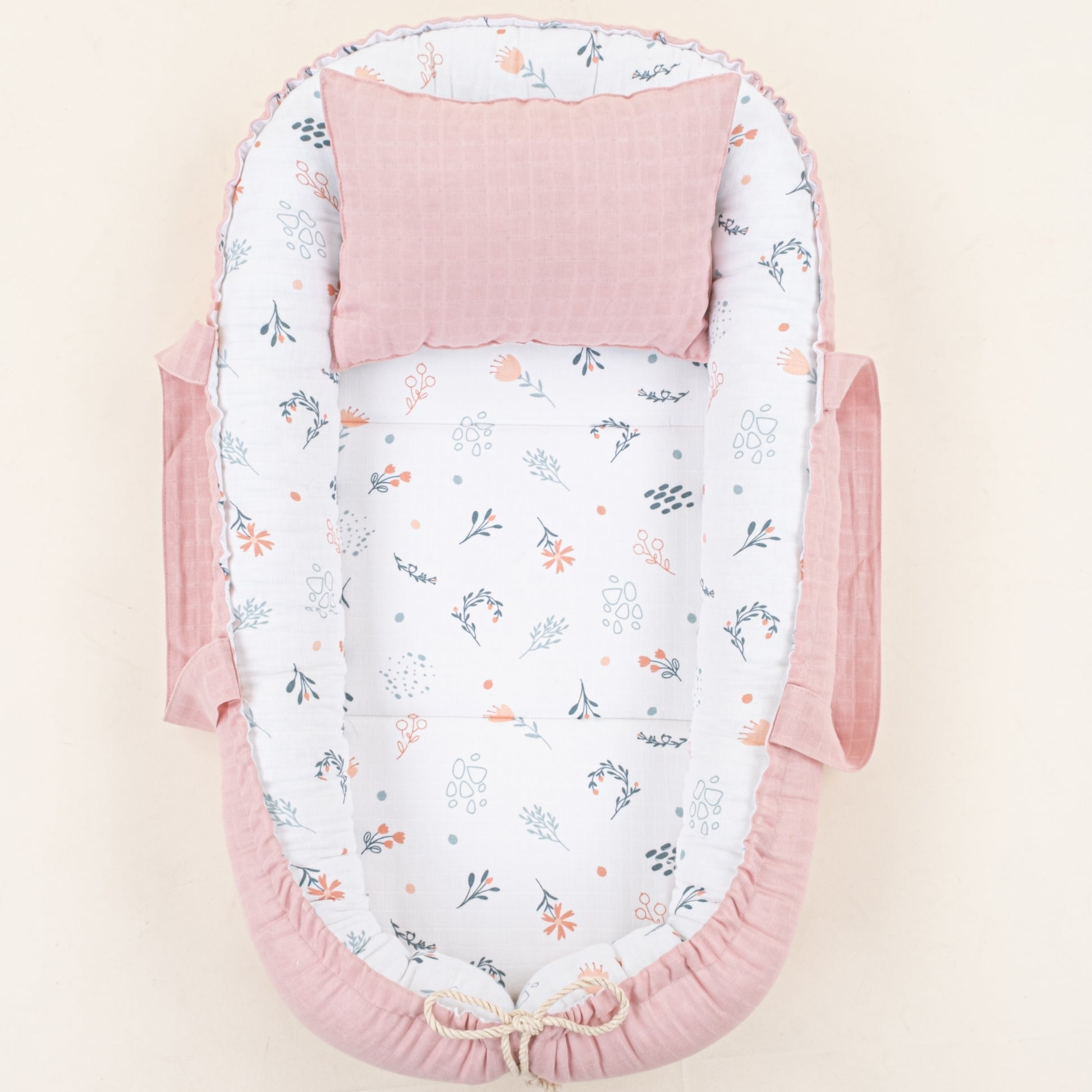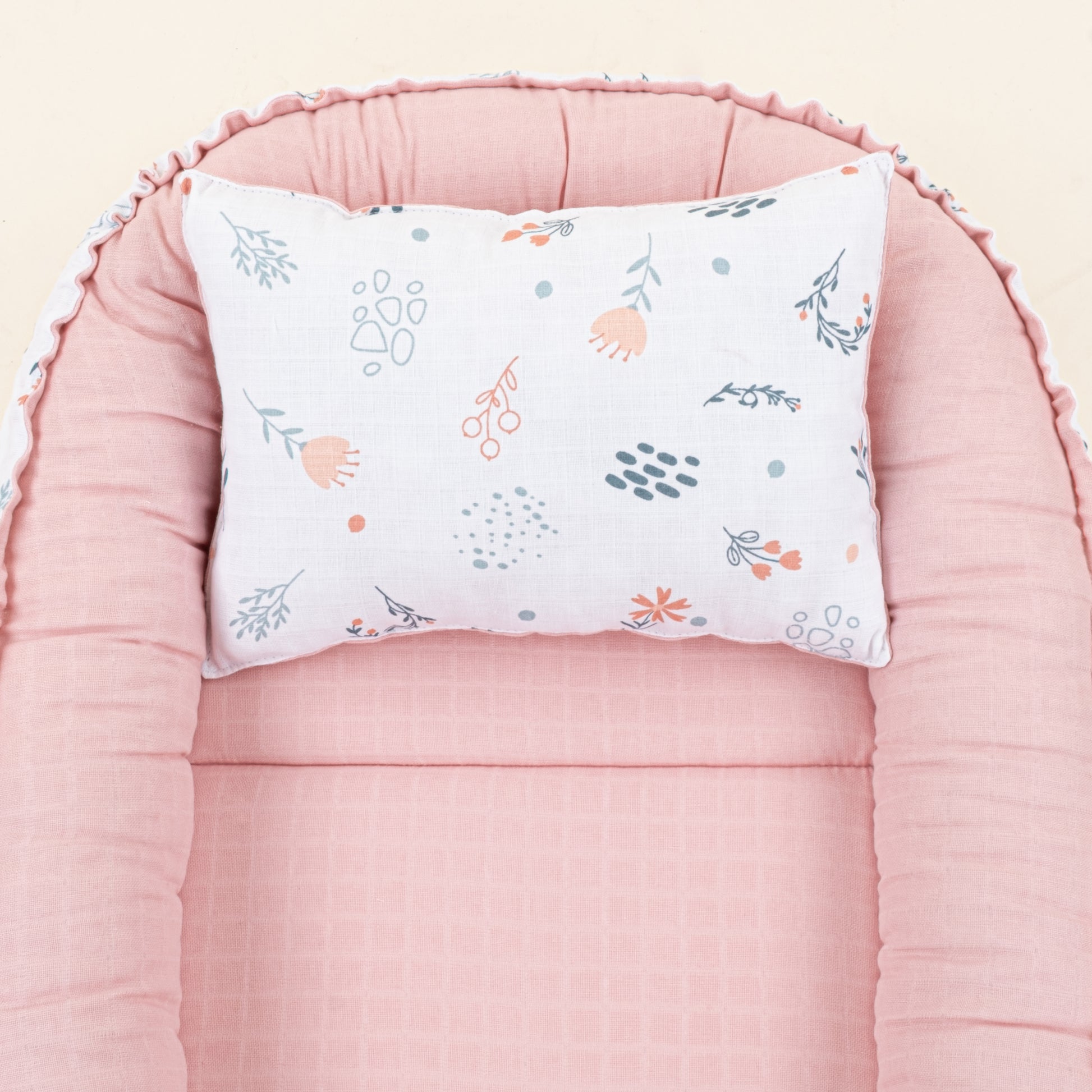 Babynest ve Yastık - Çift Taraflı - Pudra Muslin - Yeşil Çiçekler
