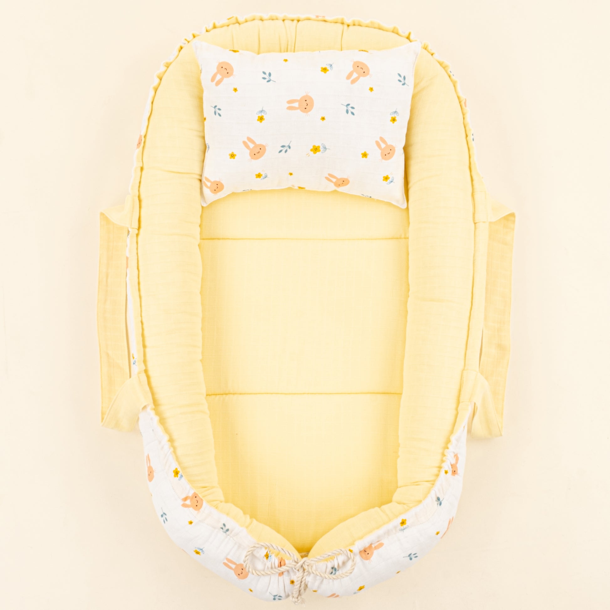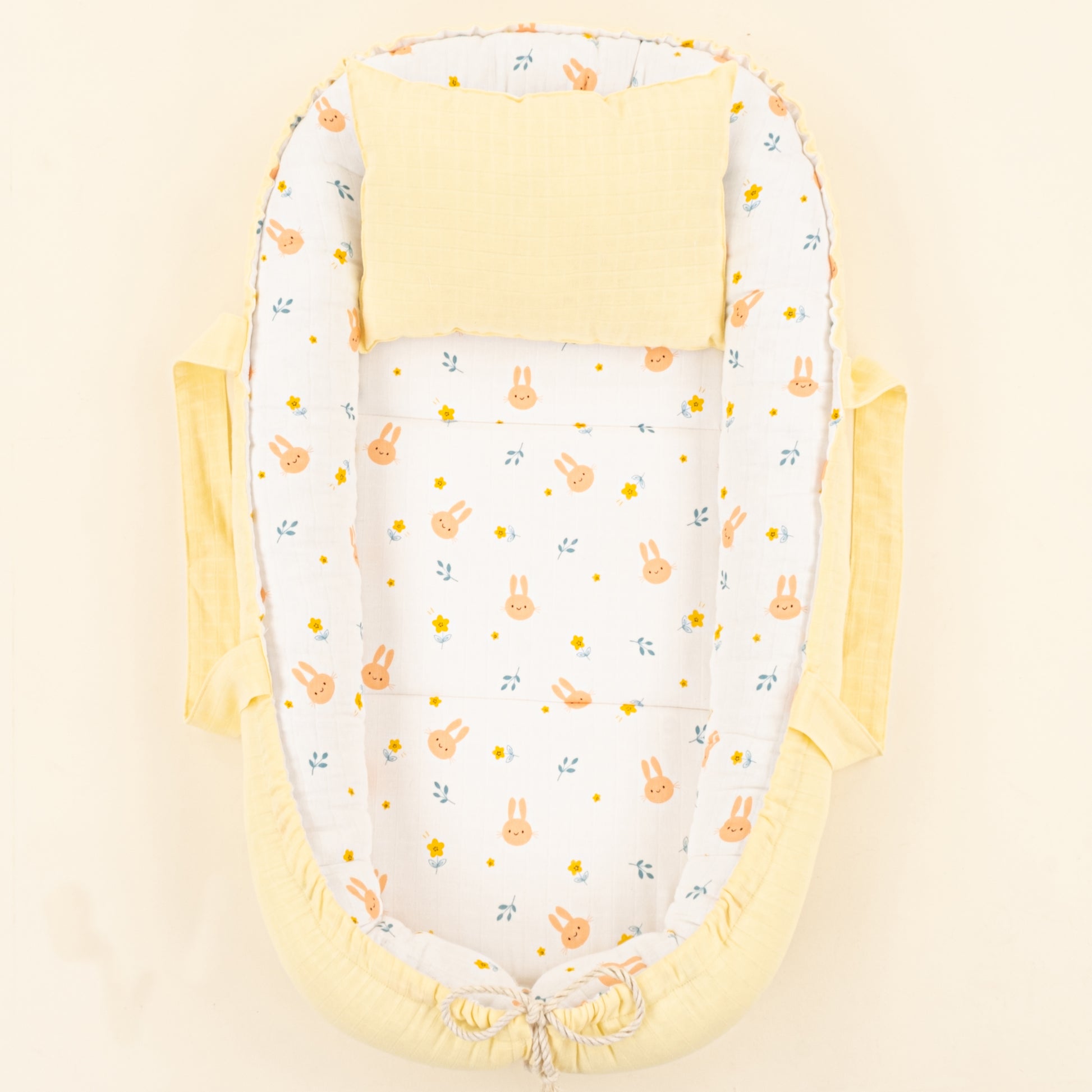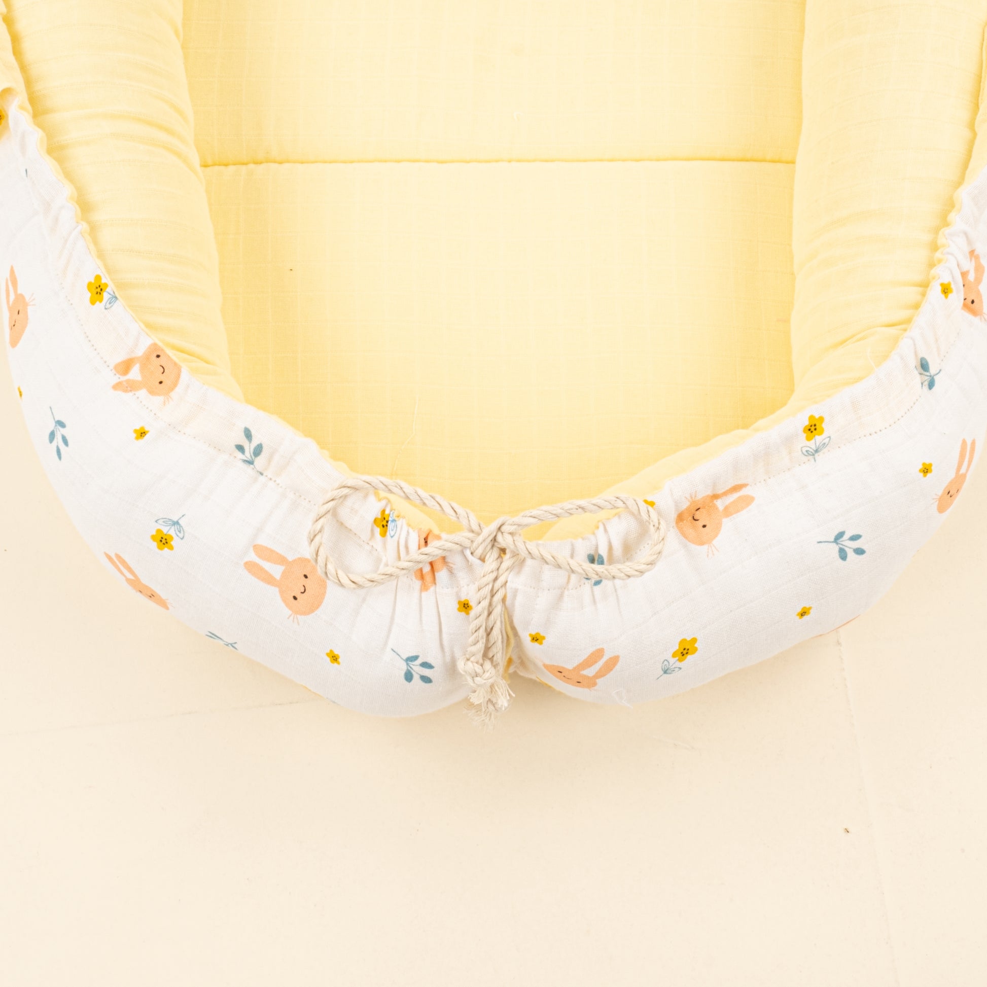 Babynest ve Yastık - Çift Taraflı - Sarı Muslin - Turuncu Tavşan