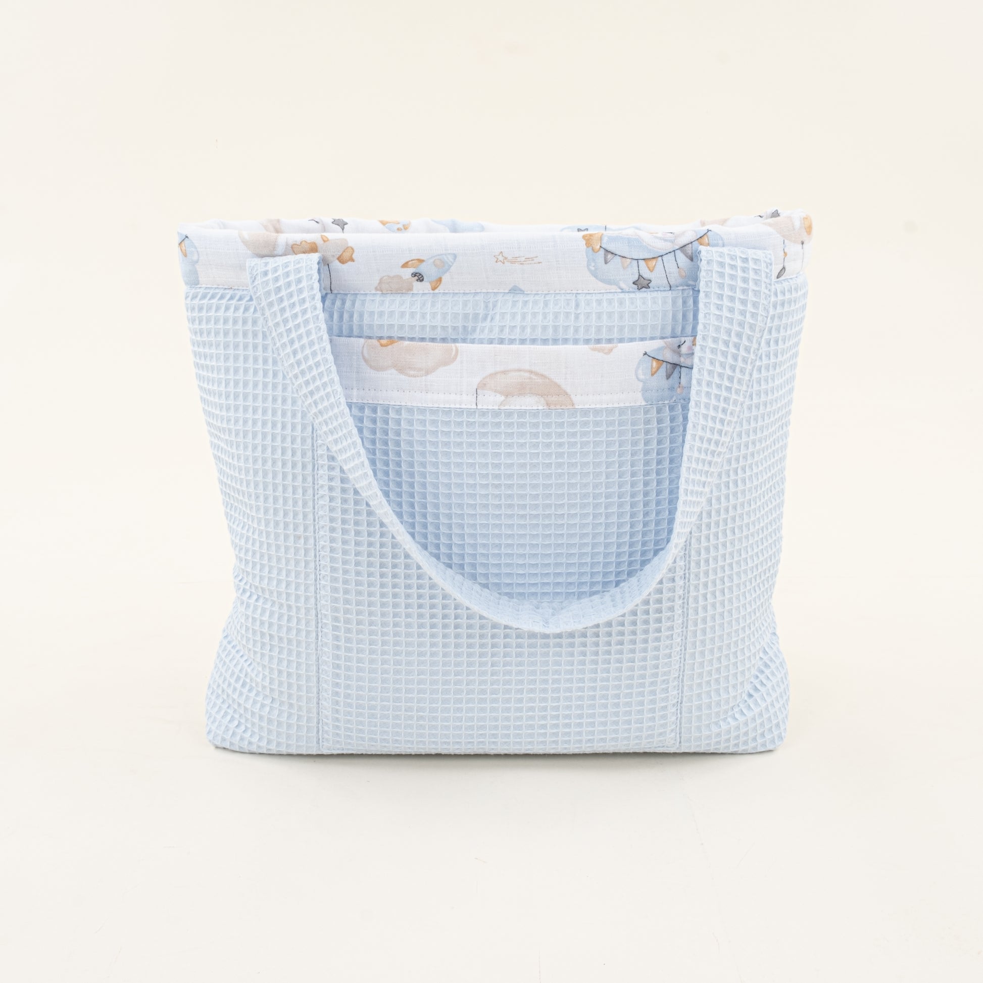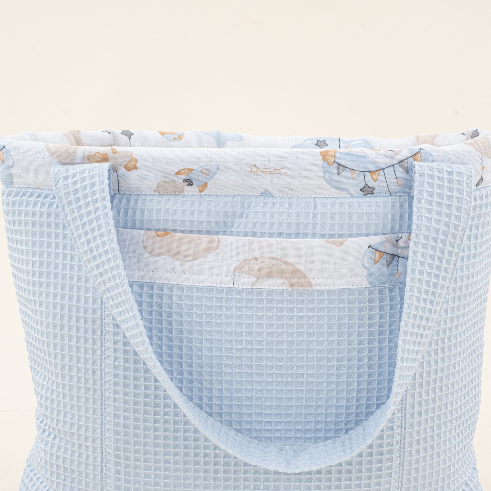 bebek bezi, yedek giysi, ıslak mendil, emzik vb. eşyalarınızı doğal dokulu müslin çantalarımızda taşıyabilirsiniz.