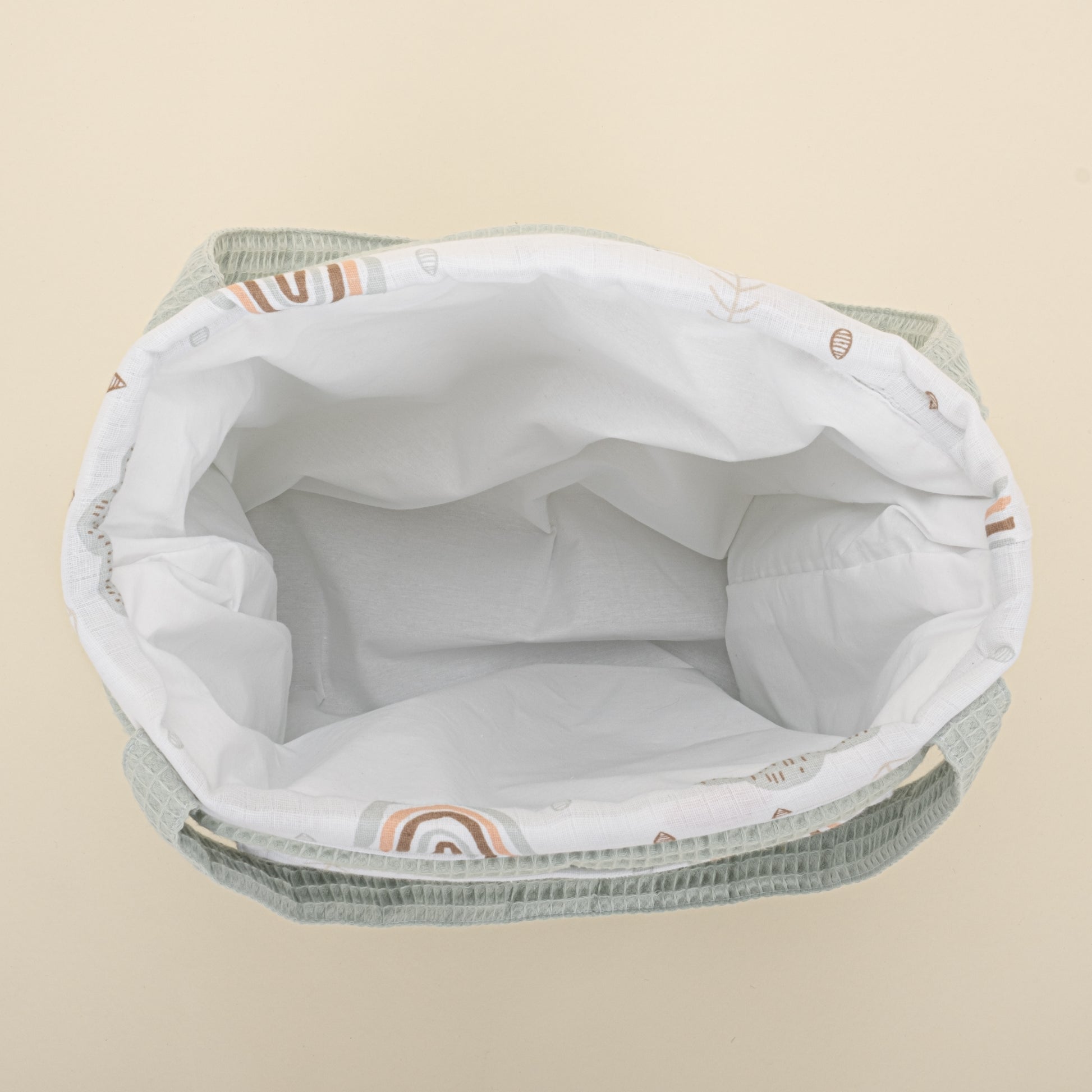 bebek bezi, yedek giysi, ıslak mendil, emzik vb. eşyalarınızı doğal dokulu müslin çantalarımızda taşıyabilirsiniz.