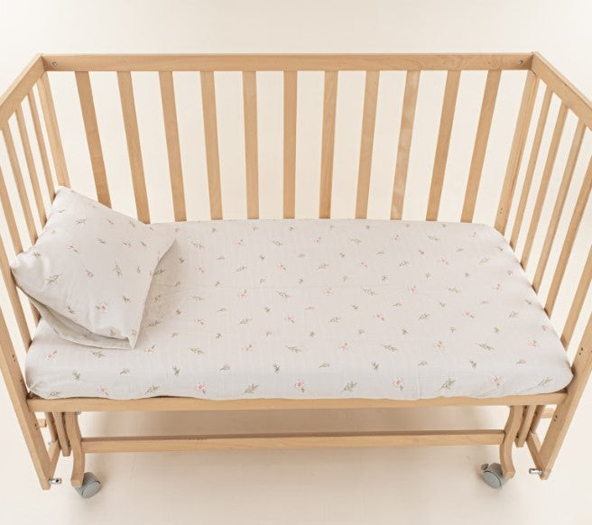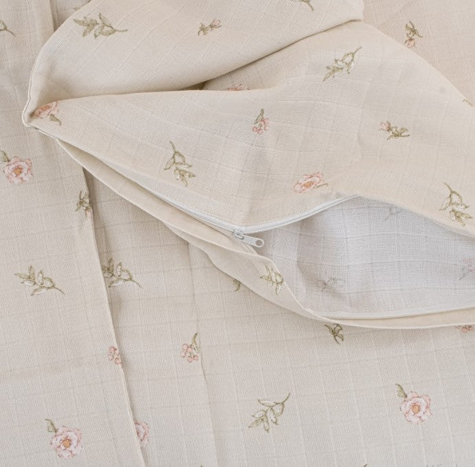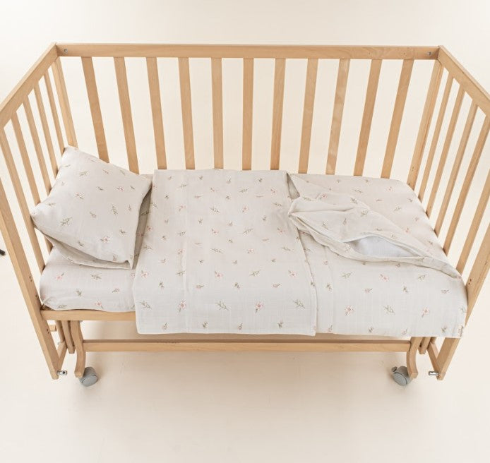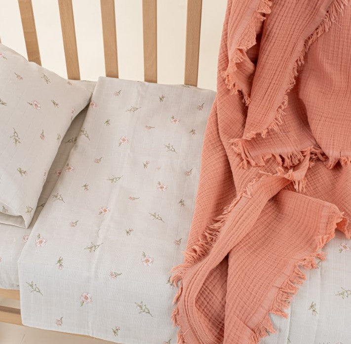 Bebek Muslin Nevresim Seti (Dört Katlı Muslin Battaniye , Yorgan Kılıfı , Yastık Kılıfı , Lastikli Çarşaf) - Mercan Dört Katlı Muslin Battaniye - Pembe Çiçekler