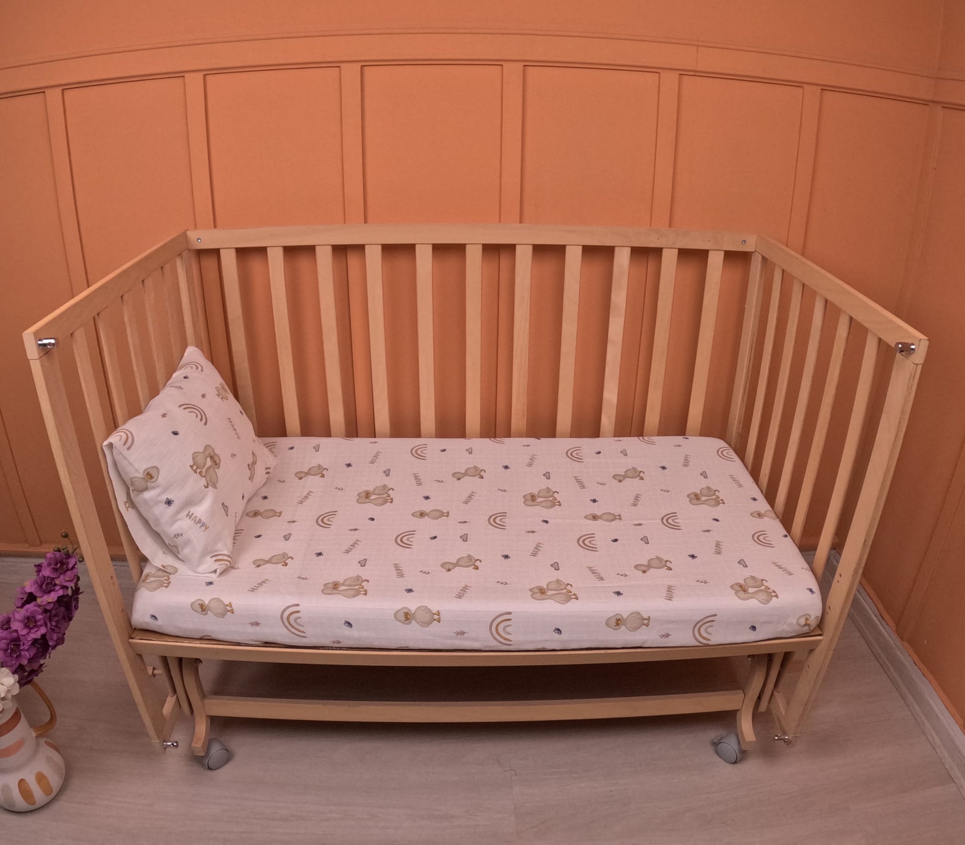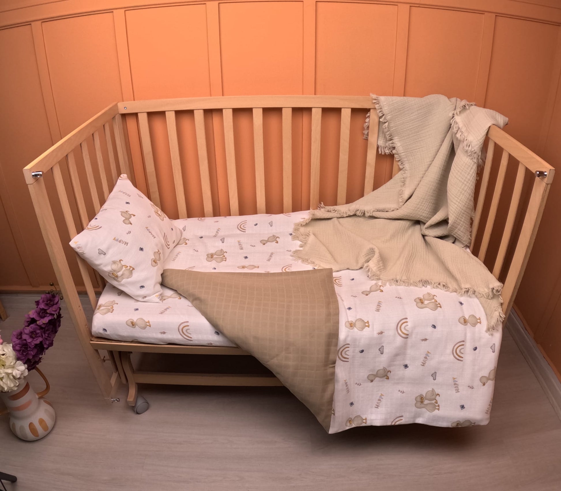 Bebek Muslin Nevresim Seti (Dört Katlı Muslin Battaniye , Yorgan Kılıfı , Yastık Kılıfı , Lastikli Çarşaf) - Taş Dört Katlı Muslin Battaniye - Toprak Muslin - Kahverengi Ördek