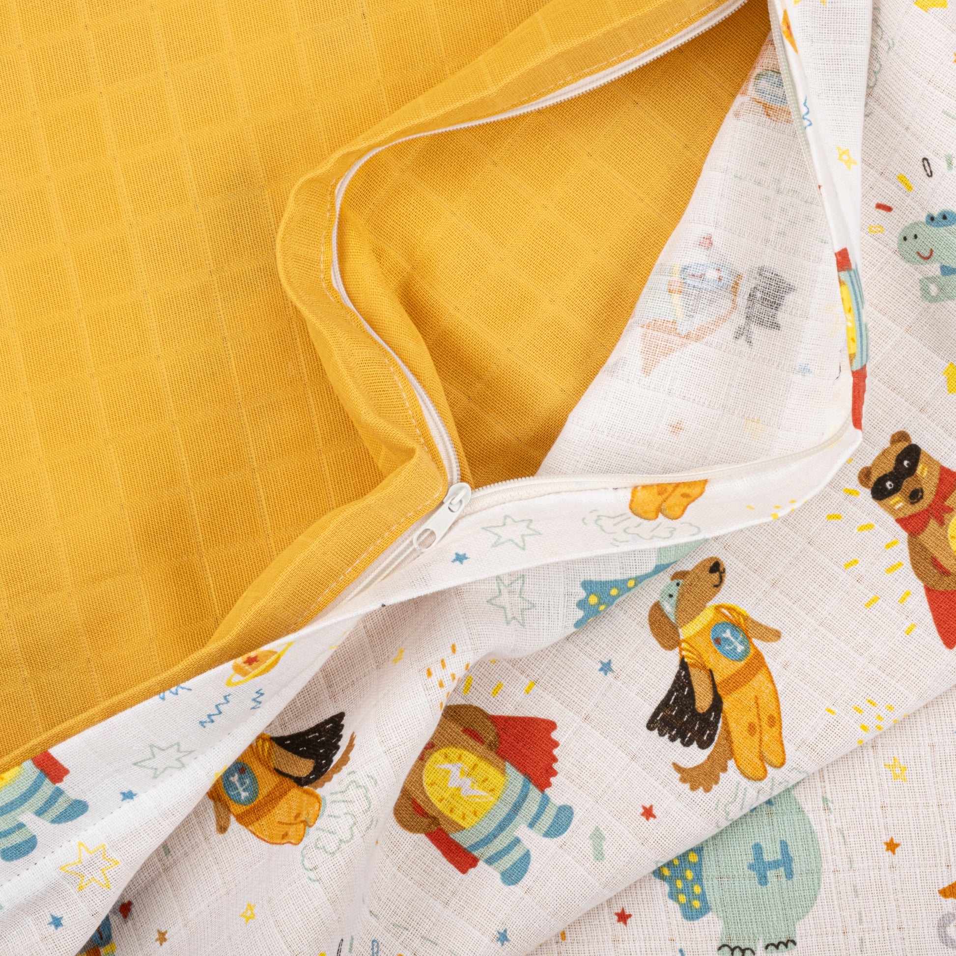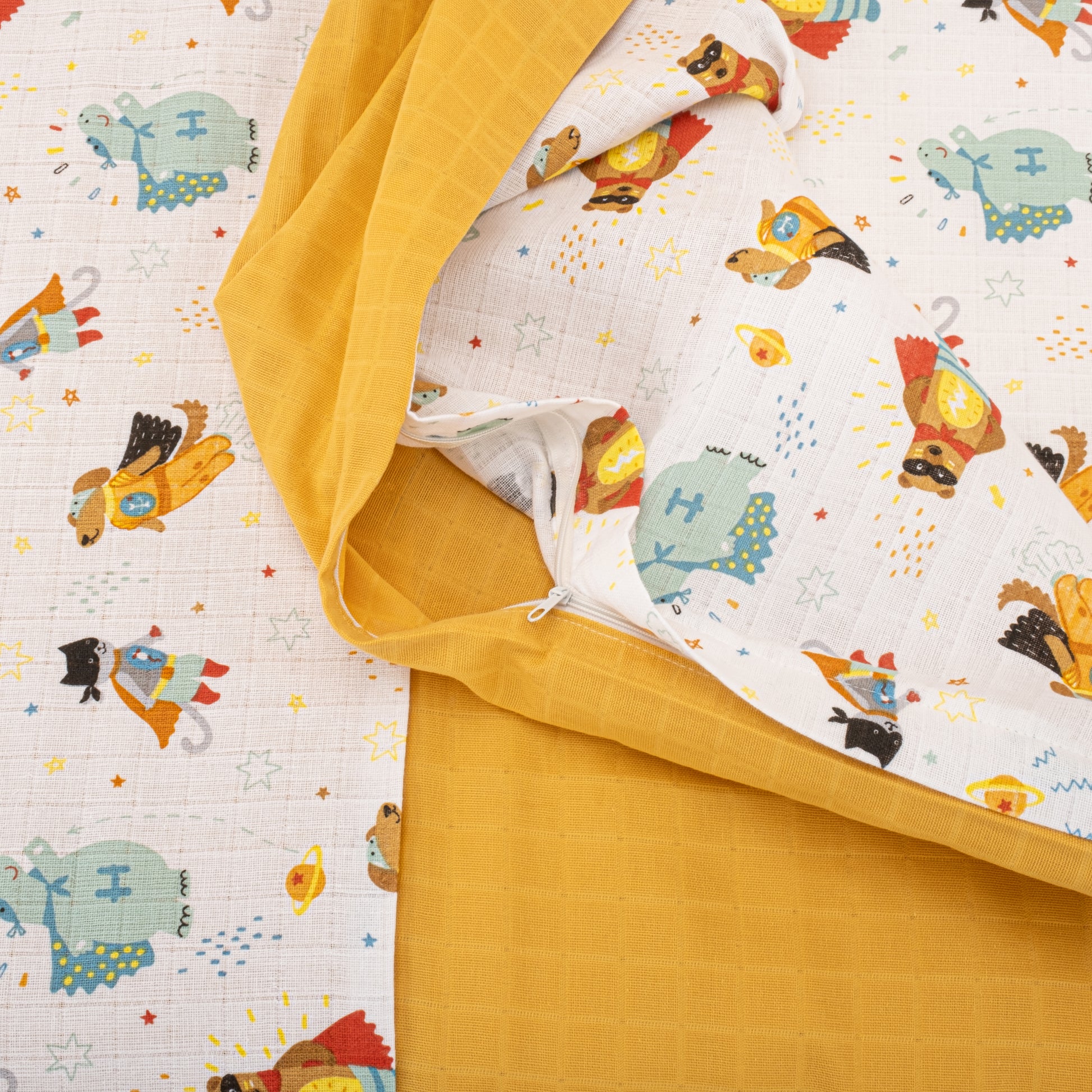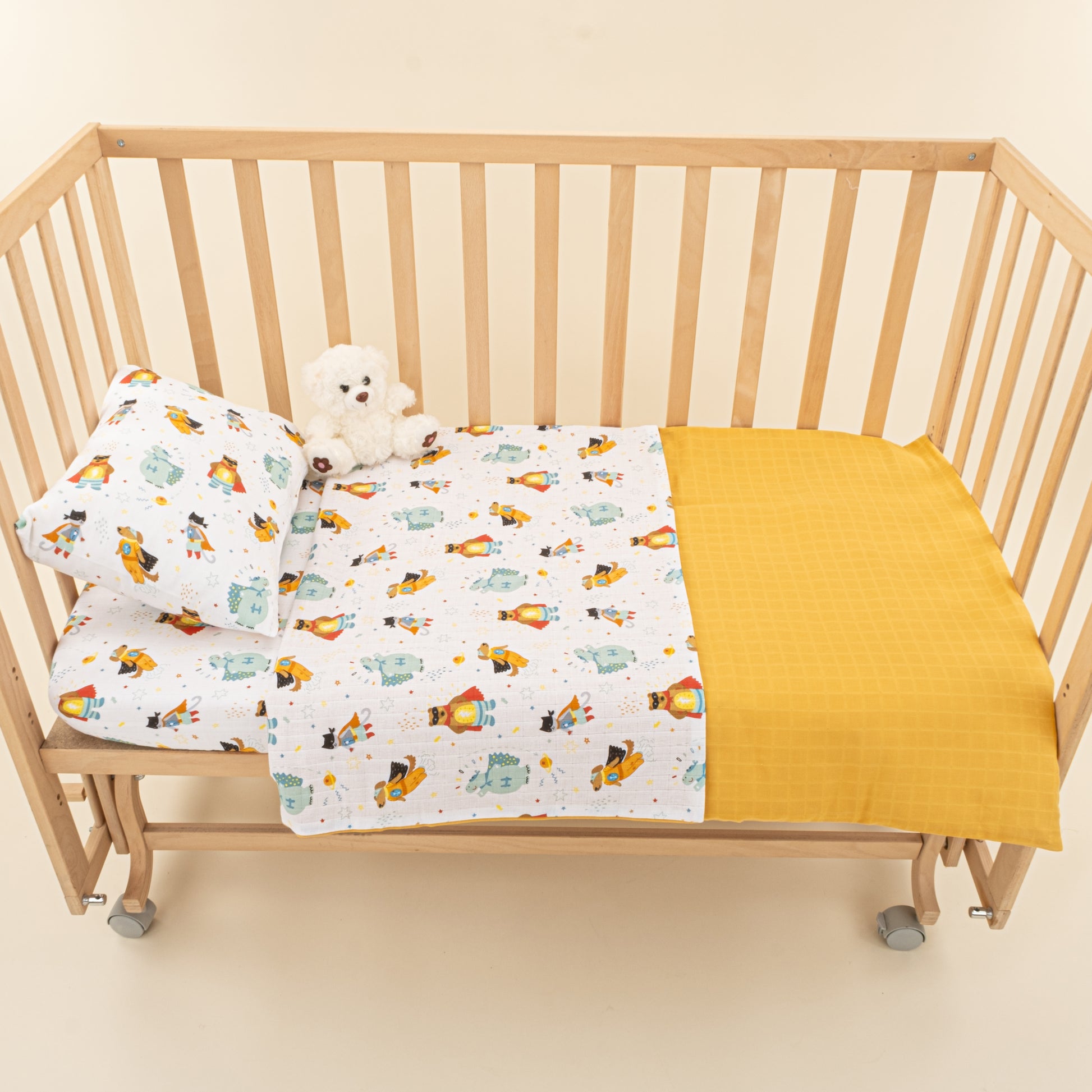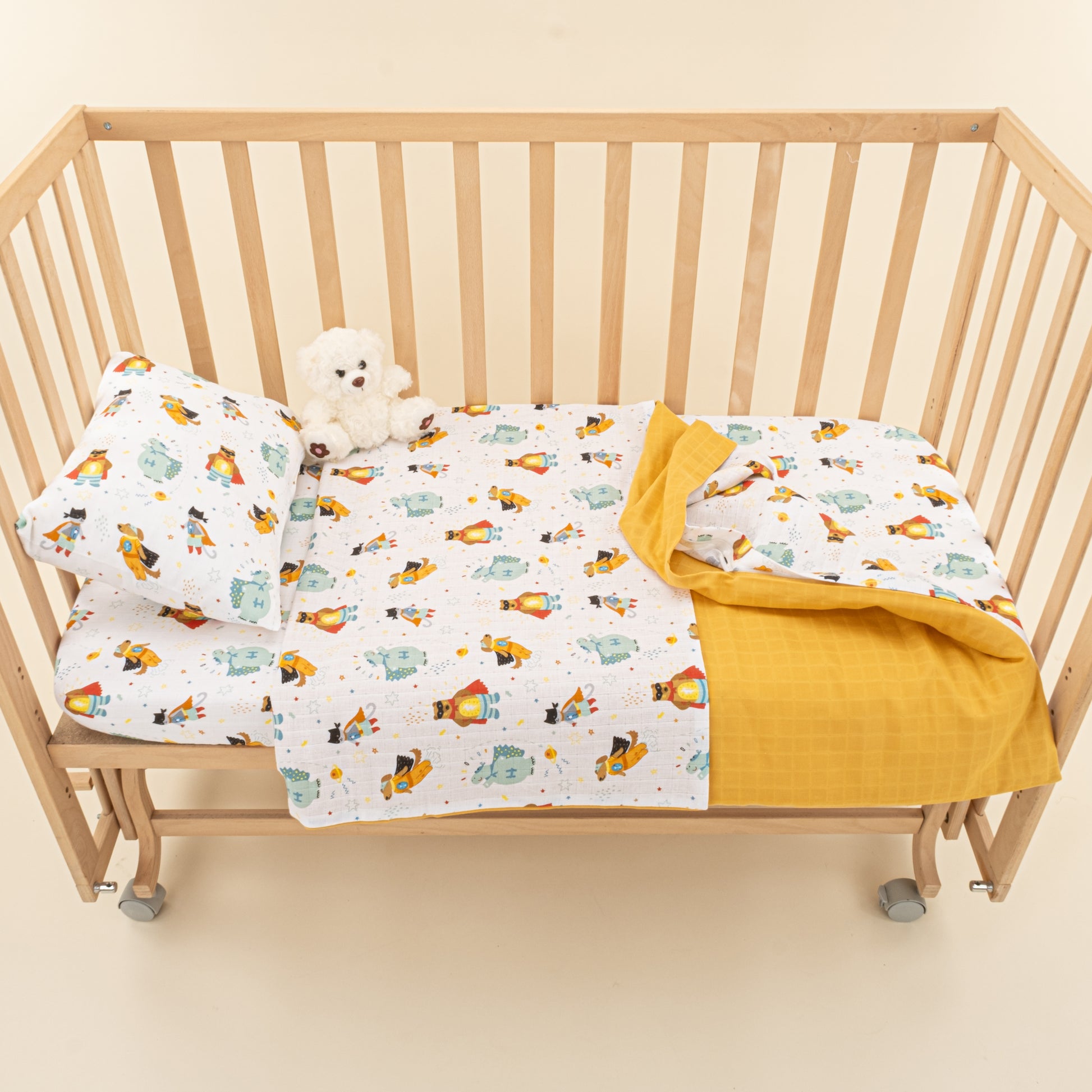 Bebek Muslin Nevresim Seti (Yorgan Kılıfı,Yastık Kılıfı,Lastikli Çarşaf) - Hardal Muslin - Süper Kahramanlar