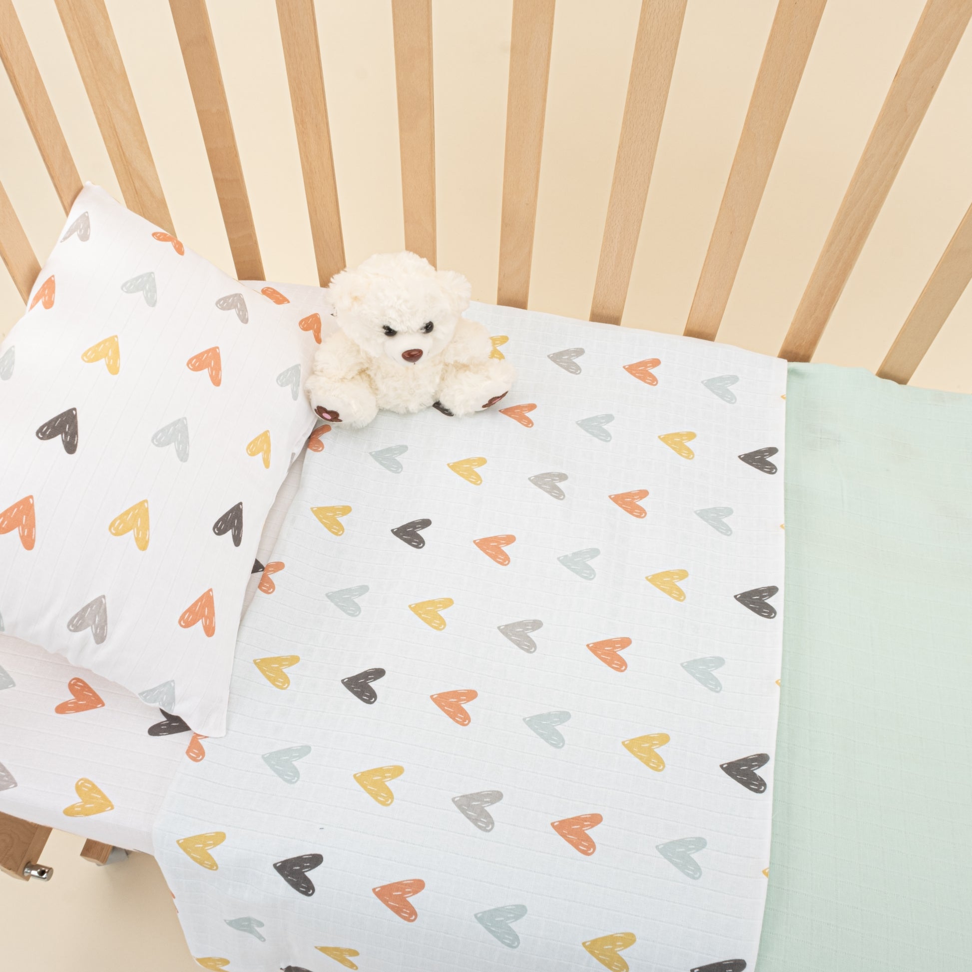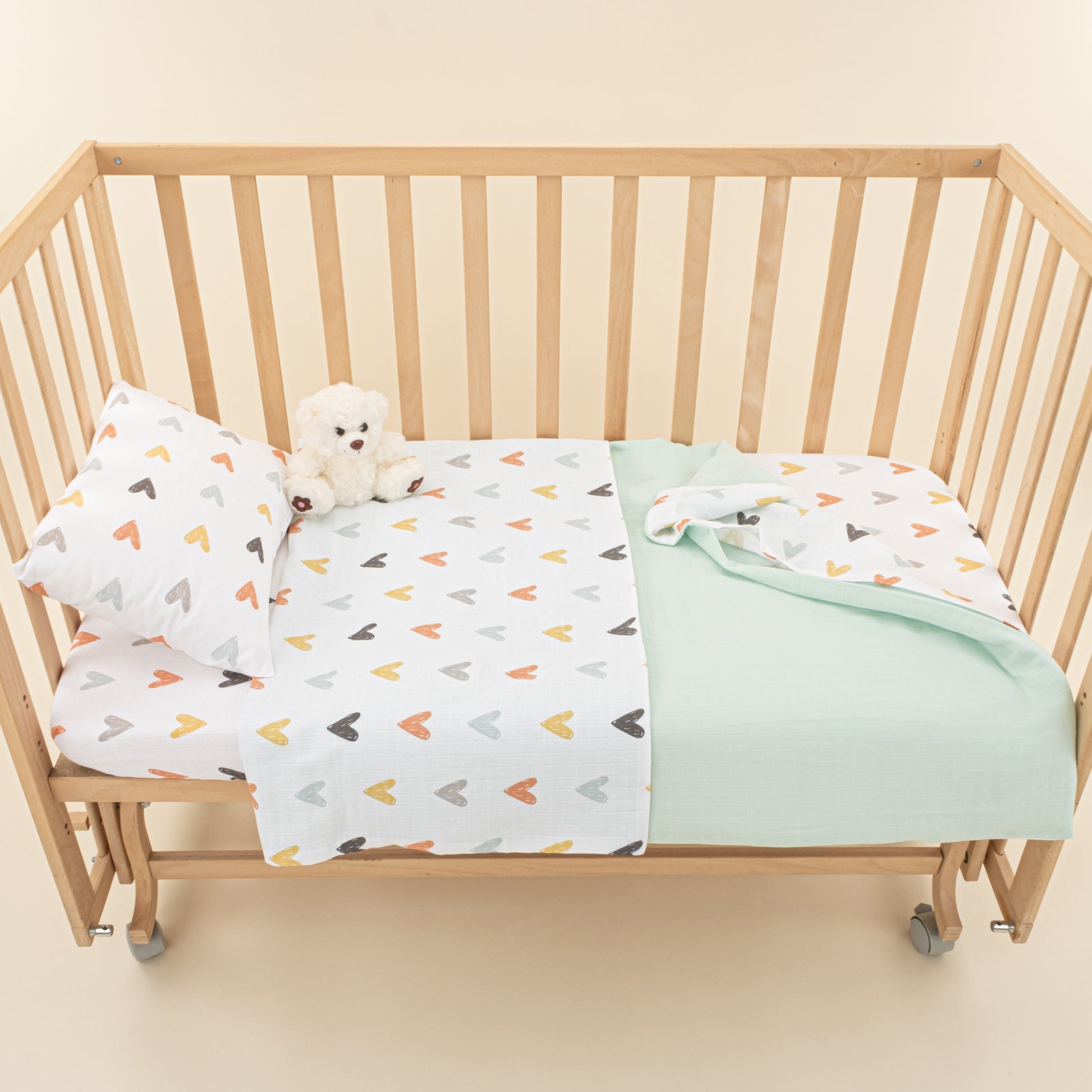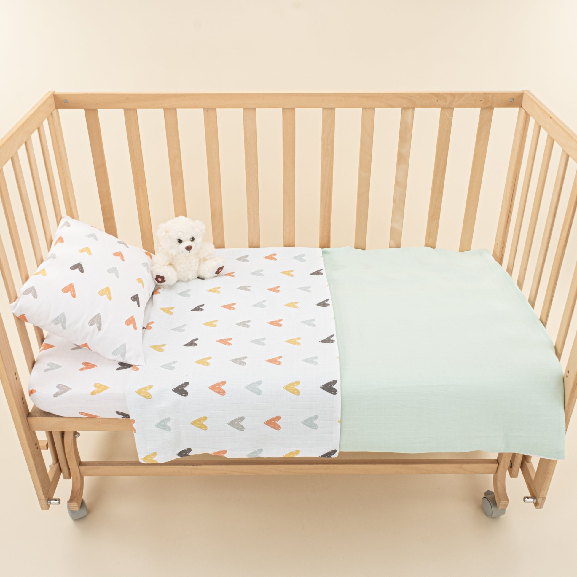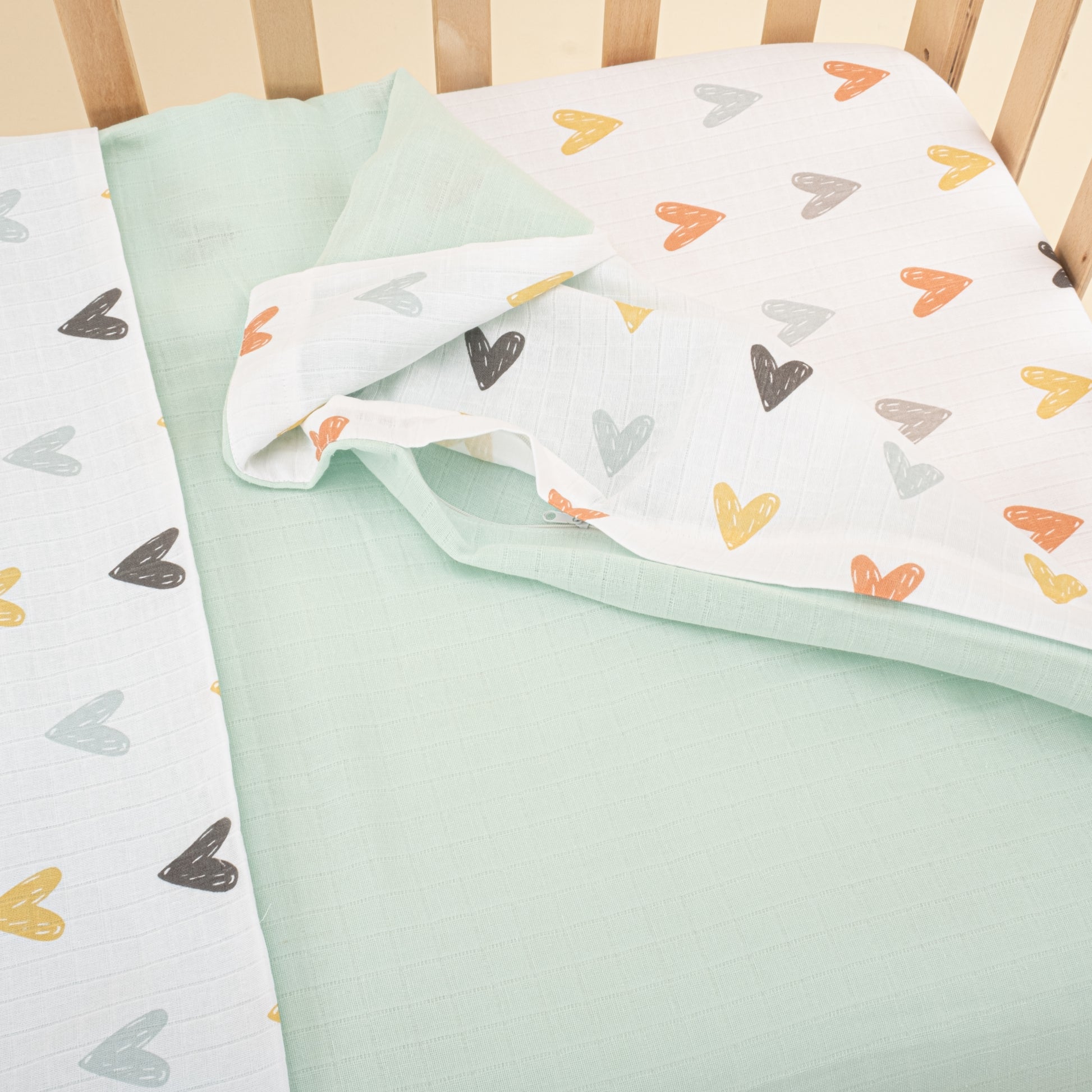 Bebek Muslin Nevresim Seti (Yorgan Kılıfı,Yastık Kılıfı,Lastikli Çarşaf) - Su Yeşili Muslin - Kalpler